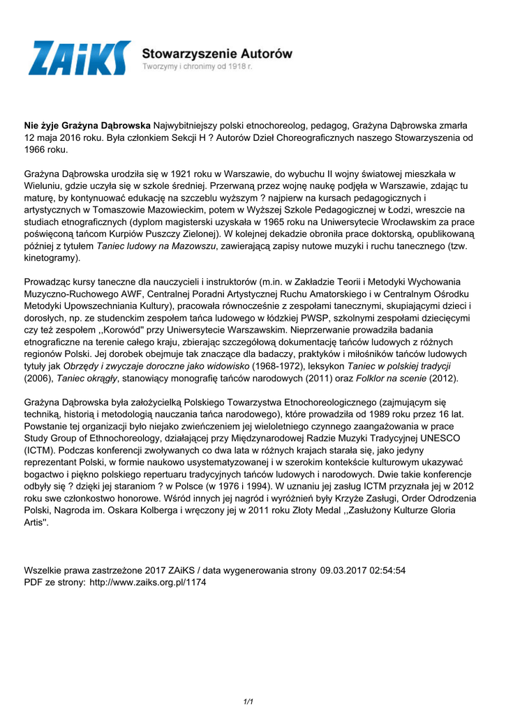 Nie żyje Grażyna Dąbrowska Najwybitniejszy polski etnochoreolog, pedagog, Grażyna Dąbrowska zmarła 12 maja 2016 roku. Była członkiem Sekcji H ? Autorów Dzieł Choreograficznych naszego Stowarzyszenia od 1966 roku. Grażyna Dąbrowska urodziła się w 1921 roku w Warszawie, do wybuchu II wojny światowej mieszkała w Wieluniu, gdzie uczyła się w szkole średniej. Przerwaną przez wojnę naukę podjęła w Warszawie, zdając tu maturę, by kontynuować edukację na szczeblu wyższym ? najpierw na kursach pedagogicznych i artystycznych w Tomaszowie Mazowieckim, potem w Wyższej Szkole Pedagogicznej w Łodzi, wreszcie na studiach etnograficznych (dyplom magisterski uzyskała w 1965 roku na Uniwersytecie Wrocławskim za prace poświęconą tańcom Kurpiów Puszczy Zielonej). W kolejnej dekadzie obroniła prace doktorską, opublikowaną później z tytułem Taniec ludowy na Mazowszu, zawierającą zapisy nutowe muzyki i ruchu tanecznego (tzw. kinetogramy). Prowadząc kursy taneczne dla nauczycieli i instruktorów (m.in. w Zakładzie Teorii i Metodyki Wychowania Muzyczno-Ruchowego AWF, Centralnej Poradni Artystycznej Ruchu Amatorskiego i w Centralnym Ośrodku Metodyki Upowszechniania Kultury), pracowała równocześnie z zespołami tanecznymi, skupiającymi dzieci i dorosłych, np. ze studenckim zespołem tańca ludowego w łódzkiej PWSP, szkolnymi zespołami dziecięcymi czy też zespołem ,,Korowód'' przy Uniwersytecie Warszawskim. Nieprzerwanie prowadziła badania etnograficzne na terenie całego kraju, zbierając szczegółową dokumentację tańców ludowych z różnych regionów Polski. Jej dorobek obejmuje tak znaczące dla badaczy, praktyków i miłośników tańców ludowych tytuły jak Obrzędy i zwyczaje doroczne jako widowisko (1968-1972), leksykon Taniec w polskiej tradycji (2006), Taniec okrągły, stanowiący monografię tańców narodowych (2011) oraz Folklor na scenie (2012). Grażyna Dąbrowska była założycielką Polskiego Towarzystwa Etnochoreologicznego (zajmującym się techniką, historią i metodologią nauczania tańca narodowego), które prowadziła od 1989 roku przez 16 lat. Powstanie tej organizacji było niejako zwieńczeniem jej wieloletniego czynnego zaangażowania w prace Study Group of Ethnochoreology, działającej przy Międzynarodowej Radzie Muzyki Tradycyjnej UNESCO (ICTM). Podczas konferencji zwoływanych co dwa lata w różnych krajach starała się, jako jedyny reprezentant Polski, w formie naukowo usystematyzowanej i w szerokim kontekście kulturowym ukazywać bogactwo i piękno polskiego repertuaru tradycyjnych tańców ludowych i narodowych. Dwie takie konferencje odbyły się ? dzięki jej staraniom ? w Polsce (w 1976 i 1994). W uznaniu jej zasług ICTM przyznała jej w 2012 roku swe członkostwo honorowe. Wśród innych jej nagród i wyróżnień były Krzyże Zasługi, Order Odrodzenia Polski, Nagroda im. Oskara Kolberga i wręczony jej w 2011 roku Złoty Medal ,,Zasłużony Kulturze Gloria Artis''. Wszelkie prawa zastrzeżone 2017 ZAiKS / data wygenerowania strony 09.03.2017 02:54:54 PDF ze strony: http://www.zaiks.org.pl/1174 1/1