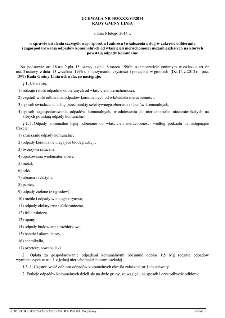 UCHWAŁA NR 303/XXX/VI/2014 RADY GMINY LINIA z dnia 6 lutego 2014 r. w sprawie ustalenia szczegółowego sposobu i zakresu świadczenia usług w zakresie odbierania i zagospodarowania odpadów komunalnych od właścicieli nieruchomości niezamieszkałych na których powstają odpady komunalne Na podstawie art. 18 ust. 2 pkt 15 ustawy z dnia 8 marca 1990r. o samorządzie gminnym w związku art. 6r ust. 3 ustawy z dnia 13 września 1996 r. o utrzymaniu czystości i porządku w gminach (Dz. U. z 2013 r., poz. 1399) Rada Gminy Linia uchwala, co następuje: § 1. Ustala się: 1) rodzaje i ilość odpadów odbieranych od właściciela nieruchomości, 2) częstotliwość odbierania odpadów komunalnych od właściciela nieruchomości, 3) sposób świadczenia usług przez punkty selektywnego zbierania odpadów komunalnych, 4) sposób zagospodarowania odpadów komunalnych, w odniesieniu do nieruchomości niezamieszkałych na których powstają odpady komunalne. § 2. 1. Odpady komunalne będą odbierane od właścicieli nieruchomości według podziału na następujące frakcje: 1) zmieszane odpady komunalne, 2) odpady komunalne ulegające biodegradacji, 3) tworzywa sztuczne, 4) opakowania wielomateriałowe, 5) metal, 6) szkło, 7) ubrania i tekstylia, 8) papier, 9) odpady zielone (z ogrodów), 10) meble i odpady wielkogabarytowe, 11) odpady elektryczne i elektroniczne, 12) folia rolnicza 13) opony 14) odpady budowlane i rozbiórkowe, 15) baterie i akumulatory, 16) chemikalia, 17) przeterminowane leki. 2. Opłata za gospodarowanie odpadami komunalnymi obejmuje odbiór 1,5 Mg rocznie odpadów wymienionych w ust. 1 z jednej nieruchomości niezamieszkałej . § 3. 1. Częstotliwość odbioru odpadów komunalnych określa załącznik nr 1 do uchwały. 2. Frakcje odpadów komunalnych dzieli się na dwie grupy, ze względu na sposób i częstotliwość odbioru: Id: 85E6C1CC-E9C5-4A22-A9E0-351BF4D63E0A. Podpisany Strona 1 1) grupa podstawowa obejmująca odpady odbierane od właścicieli nieruchomości regularnie, bez względu na ilość zgromadzonych odpadów, do której zalicza się: odpady mokre (zmieszane), odpady ulegające biodegradacji, tworzywa sztuczne, odpady wielomateriałowe, metal, szkło, ubrania i tekstylia oraz papier; 2) grupa dodatkowa obejmująca odpady zielone (z ogrodów), meble i odpady wielkogabarytowe, zużyte opony, odpady elektryczne i elektroniczne, baterie i akumulatory, chemikalia oraz przeterminowane leki, folie rolnicze. 3. Wójt Gminy Linia podaje do publicznej wiadomości na stronie internetowej Gminy Linia oraz w lokalnej prasie terminy odbioru odpadów wielkogabarytowych i bezpośrednio z nieruchomości. § 4. 1. W punkcie selektywnej zbiórki odpadów, znajdującego się na terenie Gminy Linia ustawia się oznakowane pojemniki na poszczególne frakcje odpadów komunalnych. 2. Właściciele nieruchomości samodzielnie dostarczają do punktu selektywnej zbiórki odpadów odpady komunalne zebrane w sposób selektywny. 3. Wójt Gminy Linia podaje do publicznej wiadomości na stronie internetowej Gminy Linia oraz w lokalnej prasie lokalizację punktu selektywnej zbiórki odpadów oraz wykaz odbieranych w nim frakcji odpadów. § 5. Sposób zagospodarowania poszczególnych frakcji odpadów komunalnych odebranych od właścicieli nieruchomości określa załącznik nr 2 do uchwały. § 6. Wykonanie uchwały powierza się Wójtowi Gminy Linia. § 7. Uchwała wchodzi w życie po upływie 14 dni od dnia jej ogłoszenia w Dzienniku Urzędowym Województwa Pomorskiego. Przewodniczący Rady Gminy Linia Czesław Hinz Id: 85E6C1CC-E9C5-4A22-A9E0-351BF4D63E0A. Podpisany Strona 2 Załącznik Nr 1 do uchwały Nr 303/XXX/VI/2014 Rady Gminy Linia z dnia 6 lutego 2014 r. CZĘSTOTLIWOŚĆ ODBIORU ODPADÓW KOMUNALNYCH GRUPA ODPADÓW ODPADY PODSTAWOWA ZMIESZANE ZMIESZANE POZOSTAŁOŚCI PO WYSEGREGOWANIU ODPADÓW TWORZYWA SZTUCZNE WIELOMATERIALOWE METAL PAPIER UBRANIA SZKŁO ZIELONE MEBLE I ODPADY WIELKOGABARYTOWE DODATKOWA NIERUCHOMOŚCI NIE ZAMIESZKAŁE NA KTÓRYCH POWSTAJĄ ODPADY raz na dwa tygodnie raz na dwa tygodnie raz na miesiąc raz na dwa miesiące według zapotrzebowania samodzielne dostarczenie do bezpłatnego punktu selektywnej zbiórki odpadów raz na rok odbiór z terenu nieruchomości lub według zapotrzebowania samodzielne dostarczenie do bezpłatnego punktu selektywnej zbiórki odpadów ODPADY ELEKTRYCZNE I ELEKTRONICZNE FOLIA ROLNICZA ZUŻYTE OPONY GRUZY I ODPADY ROZBIÓRKOWE BATERIE I AKUMULATORY według zapotrzebowania samodzielne dostarczenie do bezpłatnego punktu selektywnej zbiórki odpadów CHEMIKALIA PRZETERMINOWANE LEKI według zapotrzebowania samodzielne dostarczenie do bezpłatnego punktu selektywnej zbiórki odpadów Id: 85E6C1CC-E9C5-4A22-A9E0-351BF4D63E0A. Podpisany Strona 1 Załącznik Nr 2 do uchwały Nr 303/XXX/VI/2014 Rady Gminy Linia z dnia 6 lutego 2014 r. SPOSÓB ZAGOSPODAROWANIA ODPADÓW KOMUNALNYCH ODPAD PROCESY ODZYSKU1) PROCESY UNIESZKODLIWIANIA1) ZMIESZANE R1, R15 D1, D10, D11 BIODEGRADOWALNE R1, R3, R10 D10, D11 TWORZYWA SZTUCZNE R1, R5, R14, R15 D10, D11 WIELOMATERIALOWE R1, R5, R14, R15 D10, D11 METAL R4, R5 - SZKŁO R5, R14, R15 - UBRANIA R1, R14, R15 D10, D11 PAPIER R1, R3, R14,R15 D10, D12 ZIELONE R1, R3, R10 D10, D11 MEBLE I ODPADY WIELKOGABARYTOWE R1, R5, R15 D1, D10, D11 OPONY R5 - ODPADY ELEKTRYCZNE I ELEKTRONICZNE R5, R14, R15 - BATERIE, AKUMULATORY R6 D5, D16 CHEMIKALIA R2, R6 D5, D16 PRZETERMINOWANE LEKI R1 D10, D11 1) Oznaczenia procesów odzysku i unieszkodliwiania na podstawie załączników nr 1 i 2 do ustawy z dnia 14 grudnia 2012r. o odpadach (Dz. U. z 2013 r. 21) Id: 85E6C1CC-E9C5-4A22-A9E0-351BF4D63E0A. Podpisany Strona 1