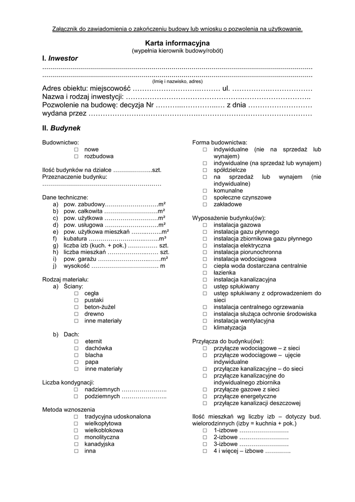 Załącznik do zawiadomienia o zakończeniu budowy lub wniosku o pozwolenia na uŜytkowanie. Karta informacyjna (wypełnia kierownik budowy/robót) I. Inwestor ........................................................................................................................................ ........................................................................................................................................ (Imię i nazwisko, adres) Adres obiektu: miejscowość ……………………….……… ul. …………….……………… Nazwa i rodzaj inwestycji: ………………………………………….……………………….. Pozwolenie na budowę: decyzja Nr ………...…………...… z dnia ……………………… wydana przez ……………………………………….………………………………………… II. Budynek Budownictwo: □ nowe □ rozbudowa Ilość budynków na działce ………………..szt. Przeznaczenie budynku: …………………………………………………… Dane techniczne: a) pow. zabudowy………………………m² b) pow. całkowita ………………………m² c) pow. uŜytkowa ………………………m² d) pow. usługowa ………………………m² e) pow. uŜytkowa mieszkań ……..……..m² f) kubatura ……………………….……..m³ g) liczba izb (kuch. + pok.) …………… szt. h) liczba mieszkań ………………..…… szt. i) pow. garaŜu ……………………..……m² j) wysokość ……………………………. m Rodzaj materiału: a) Ściany: □ cegła □ pustaki □ beton-ŜuŜel □ drewno □ inne materiały b) Dach: □ □ □ □ □ eternit dachówka blacha papa inne materiały Liczba kondygnacji: □ nadziemnych ………………….. □ podziemnych ………………….. Metoda wznoszenia □ tradycyjna udoskonalona □ wielkopłytowa □ wielkoblokowa □ monolityczna □ kanadyjska □ inna Forma budownictwa: □ indywidualne (nie na sprzedaŜ lub wynajem) □ indywidualne (na sprzedaŜ lub wynajem) □ spółdzielcze □ na sprzedaŜ lub wynajem (nie indywidualne) □ komunalne □ społeczne czynszowe □ zakładowe WyposaŜenie budynku(ów): □ instalacja gazowa □ instalacja gazu płynnego □ instalacja zbiornikowa gazu płynnego □ instalacja elektryczna □ instalacja piorunochronna □ instalacja wodociągowa □ ciepła woda dostarczana centralnie □ łazienka □ instalacja kanalizacyjna □ ustęp spłukiwany □ ustęp spłukiwany z odprowadzeniem do sieci □ instalacja centralnego ogrzewania □ instalacja słuŜąca ochronie środowiska □ instalacja wentylacyjna □ klimatyzacja Przyłącza do budynku(ów): □ przyłącze wodociągowe – z sieci □ przyłącze wodociągowe – ujęcie indywidualne □ przyłącze kanalizacyjne – do sieci □ przyłącze kanalizacyjne do indywidualnego zbiornika □ przyłącze gazowe z sieci □ przyłącze energetyczne □ przyłącze kanalizacji deszczowej Ilość mieszkań wg liczby izb – dotyczy bud. wielorodzinnych (izby = kuchnia + pok.) □ 1-izbowe ……………………. □ 2-izbowe ……………………. □ 3-izbowe ……………………. □ 4 i więcej – izbowe …………. III. Budowla V. Obiekt mostowy Dane techniczne: a) kubatura ……………………………m³ b) pojemność …………………………m³ c) długość …………………………….m d) szerokość ……………………………. e) wysokość ……………………………. Dane techniczne: a) klasa drogi …………………………….. b) długość ……………………………….m c) szerokość …………………………….m d) światło (skrajnia) …………………….m e) rodzaj konstrukcji …………………….. IV. Droga VI. Rurociągi, przewody, linie i sieci Dane techniczne: a) klasa drogi ……………………………… b) długość ……………………………….m c) szerokość …………………………….m d) światło (skrajnia) …………………….m e) rodzaj nawierzchni drogi …………………... Dane techniczne: a) długość ………………………………..m b) średnica ……………………………….mm c) napięcie …………………………….….kV VII. Obiekty budowlane (niewymienione w pkt. II-VII) Dane charakterystyczne dla danego obiektu budowlanego: ........................................................................................................................................ ........................................................................................................................................ Zakończenie budowy: □ całkowite □ przed wykonaniem wszystkich robót budowlanych □ etap ………… według pozwolenia na budowę Terminy: rozpoczęcia budowy …………………..…………; zakończenia budowy ………...……………… Sporządził ………………………………….. dnia ……………………………… Uprawnienia bud. Nr …………………………………… Wyjaśnienie: W odpowiednich miejscach zaznaczyć lub wypełnić W przypadku zgłoszenia więcej niŜ jednego budynku, kartę informacyjną naleŜy wypełniać dla kaŜdego z nich osobno Niniejszy formularz nie jest drukiem obowiązującym, ma jedynie charakter informacyjny i pomocniczy, ułatwiający złoŜenie właściwych dokumentów.