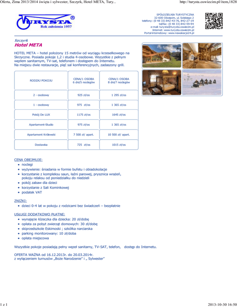 Oferta, Zima 2013/2014 święta i sylwester, Szczyrk, Hotel META, Tury... 1z1 http://turysta.oswiecim.pl/item,1828 SPÓŁDZIELNIA TURYSTYCZNA 32-600 Oświęcim, ul. Solskiego 2 telefony: (0 48 33) 842-43-76, 842-27-19 tel/fax: (0 48 33) 842-59-94 e-mail: [email protected] Internet: www.turysta.oswiecim.pl Portal internetowy: www.nawakacje24.pl Szczyrk Hotel META HOTEL META – hotel położony 15 metrów od wyciągu krzesełkowego na Skrzyczne. Posiada pokoje 1,2 i studia 4-osobowe. Wszystkie z pełnym węzłem sanitarnym, TV-sat, telefonem i dostępem do Internetu. Na miejscu dwie restauracje, pięć sal konferencyjnych, zadaszony grill. RODZAJ POKOJU CENA/1 OSOBA 6 dni/5 noclegów CENA/1 OSOBA 8 dni/7 noclegów 2 - osobowy 925 zł/os 1 295 zł/os 1 - osobowy 975 zł/os 1 365 zł/os Pokój De LUX 1175 zł/os 1645 zł/os Apartament-Studio 975 zł/os 1 365 zł/os Apartament Królewski 7 500 zł/ apart. 10 500 zł/ apart. Dostawka 725 zł/os 1015 zł/os CENA OBEJMUJE: noclegi wyżywienie: śniadania w formie bufetu i obiadokolacje korzystanie z kompleksu saun, łaźni parowej, prysznica wrażeń, pokoju relaksu od poniedziałku do niedzieli pokój zabaw dla dzieci korzystanie z Sali Kominkowej podatek VAT ZNIŻKI: dzieci 0-4 lat w pokoju z rodzicami bez świadczeń – bezpłatnie USŁUGI DODATKOWO PŁATNE: wynajęcie łóżeczka dla dziecka: 20 zł/dobę opłata za pobyt zwierząt domowych: 30 zł/dobę skiprzedszkole Eskimoski ; szkółka narciarska parking monitorowany: 10 zł/doba opłata miejscowa Wszystkie pokoje posiadają pełny węzeł sanitarny, TV-SAT, telefon, dostęp do Internetu. OFERTA WAŻNA od 16.12.2013r. do 20.03.2014r. z wyłączeniem turnusów „Boże Narodzenie” i „ Sylwester” 2013-10-30 16:50