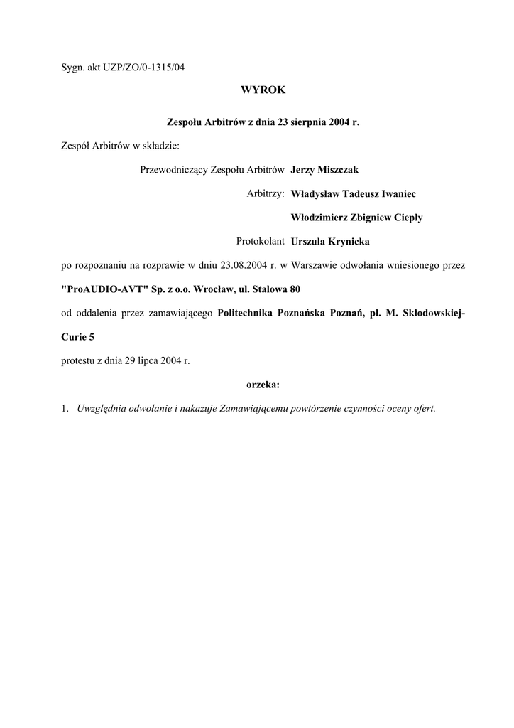 Sygn. akt UZP/ZO/0-1315/04 WYROK Zespołu Arbitrów z dnia 23 sierpnia 2004 r. Zespół Arbitrów w składzie: Przewodniczący Zespołu Arbitrów Jerzy Miszczak Arbitrzy: Władysław Tadeusz Iwaniec Włodzimierz Zbigniew Ciepły Protokolant Urszula Krynicka po rozpoznaniu na rozprawie w dniu 23.08.2004 r. w Warszawie odwołania wniesionego przez "ProAUDIO-AVT" Sp. z o.o. Wrocław, ul. Stalowa 80 od oddalenia przez zamawiającego Politechnika Poznańska Poznań, pl. M. SkłodowskiejCurie 5 protestu z dnia 29 lipca 2004 r. orzeka: 1. Uwzględnia odwołanie i nakazuje Zamawiającemu powtórzenie czynności oceny ofert. 2. Kosztami postępowania obciąża Politechnika Poznańska Poznań, pl. M. SkłodowskiejCurie 5 i nakazuje: 1) zaliczyć na rzecz Urzędu Zamówień Publicznych koszty w wysokości 5 184 zł 22 gr (słownie: pięć tysięcy sto osiemdziesiąt cztery złote dwadzieścia dwa grosze) z kwoty wpisu uiszczonego przez "ProAUDIO-AVT" Sp. z o.o. Wrocław, ul. Stalowa 80 2) dokonać wpłaty kwoty 7 684 zł 22 gr (słownie: siedem tysięcy sześćset osiemdziesiąt cztery złote dwadzieścia dwa grosze) przez Politechnika Poznańska Poznań, pl. M. Skłodowskiej-Curie 5 na rzecz "ProAUDIO-AVT" Sp. z o.o. Wrocław, ul. Stalowa 80 3) dokonać wpłaty kwoty 0 zł 00 gr (słownie: xxx) przez xxx na rzecz Urzędu Zamówień Publicznych na rachunek środków specjalnych UZP 4) dokonać zwrotu kwoty 750 zł 78 gr (słownie: siedemset pięćdziesiąt złotych siedemdziesiąt osiem groszy) z rachunku środków specjalnych Urzędu Zamówień Publicznych na rzecz "ProAUDIOAVT" Sp. z o.o. Wrocław, ul. Stalowa 80. 3. Uzasadnienie Zamawiający, Politechnika Poznańska ogłosiła przetarg nieograniczony na wykonanie instalacji niskoprądowych, teleinformatycznych i zasilania gwarantowanego w budynku Centrum Wykładowego Politechniki Poznańskiej - Pakiet 5 – wykonanie instalacji i dostawa urządzeń multimedialnych. W przetargu tym ofertę złożyła firma ProAUDIO - AVT Spółka z o.o. we Wrocławiu. W dniu 23 lipca 2004 r. Spółka ta poinformowana została o rozstrzygnięciu tego Strona 2 z 2 postępowania poprzez wybór oferty firmy AVC Spółka z o. o. w Poznaniu. Po zapoznaniu się z treścią oferty zwycięskiej, ProAUDIO -AVT złożyła protest zarzucając nie zabezpieczenie wybranej, jako najkorzystniejsza, oferty gwarancją wadialną ,brak zaświadczenia z Krajowego Rejestru Karnego o niekaralności spółki jako podmiotu zbiorowego, brak dokumentów autoryzacji na dystrybucję i montaż kluczowych urządzeń i systemów, których dotyczy postępowanie, opisy oferowanych urządzeń w języku angielskim bez tłumaczenia na język polski, zaoferowanie urządzeń nie spełniających minimalnych wymagań technicznych. Z powodu przytoczonych uchybień Protestujący wnosił o odrzucenie wybranej oferty w oparciu o przepisy art.89 ust.1 pkt.1 i 2 ustawy Prawo zamówień publicznych jako niezgodnej z przepisami tejże ustawy oraz siwz. Zamawiający protest oddalił, podnosząc, że wybrana oferta była prawidłowo zabezpieczona wadium w postaci gwarancji ubezpieczeniowej, Zamawiający wycofał się z wymogu złożenia zaświadczenia z KRK, co do podmiotów zbiorowych, wykonawca, w związku z członkostwem Polski w Unii Europejskiej, może posiadać uprawnienia na dystrybucję i montaż udzielone mu przez podmioty działające na całym obszarze Unii, nie zaś tylko przez firmę polską na terenie Polski, Zamawiający dopuścił dostarczenie wymaganych atestów i certyfikatów w trakcie realizacji przedmiotu zamówienia oraz, że zaoferowane urządzenia spełniają wymogi określone przez Zamawiającego w siwz. Z takim rozstrzygnięciem protestu nie zgodziła się Spółka ProAUDIO -AVT składając odwołanie. Odwołujący tak jak w proteście podnosi, że zwycięski oferent nie przedłożył wymaganych prawem dokumentów, część oferty nie jest w języku polskim, oferta nie spełnia wymagań określonych w siwz, co do uprawnień autoryzowanego partnera producenta oferowanego sprzętu, a część oferowanych urządzeń nie spełnia wymagań siwz oraz, że dokumenty stanowiące ofertę nie zostały podpisane i ponumerowane, czego wymagały zapisy siwz. Strona 3 z 3 Każdy z tych zarzutów Odwołujący szczegółowo uzasadnia polemizując z twierdzeniami Zamawiającego zawartymi w rozstrzygnięciu protestu. Żądania Odwołującego sprowadzają się do uchylenia rozstrzygnięcia Zamawiającego oddalającego protest oraz uchylenia decyzji o wyborze oferty, nakazanie wykluczenia z postępowania firmy AVC Spółka z o. o. w Poznaniu lub nakazanie odrzucenia jej oferty, a także nakazanie Zamawiającemu ponownego wyboru oferty. Zespół Arbitrów po zapoznaniu się z treścią siwz oraz wybranej oferty, a także po wysłuchaniu stron ustalił i zważył, co następuje: Odwołujący podniósł sześć zarzutów, przy czym z jednego z nich dotyczącego przełącznika matrycowego AV zrezygnował na rozprawie z powodu, jak oświadczył trudności dowodowych i skomplikowanej materii technicznej tego zarzutu. Rozpatrując każdy z tych zarzutów należy stwierdzić, że nie zasługuje na uwzględnienie zarzut dotyczący aneksu gwarancji wadialnej, który nie został podpisany przez upoważnione osoby reprezentujące oferenta, ani też nie zawiera wymaganej siwz numeracji stron. Wadium ma na celu zabezpieczenie interesów Zamawiającego poprzez materialne zagwarantowanie podpisania umowy przez oferenta, którego oferta zostaje wybrana jako najkorzystniejsza. Warunkiem prawidłowego wniesienia wadium jest załączenie do oferty gwarancji ubezpieczeniowej czy też aneksu do niej, a tak uczynił zwycięski oferent. Pozostałe zarzuty podniesione przez Odwołującego zasługują na uwzględnienie. Zamawiający w postępowaniu, którego wartość zamówienia przekracza wyrażoną w złotych równowartość kwoty 60.000 euro ma obowiązek zgodnie z art. 26 ust. 1 ustawy Prawo zamówień publicznych żądania od 