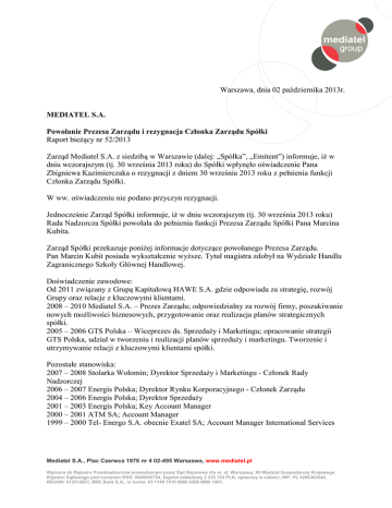 Warszawa, dnia 02 października 2013r. MEDIATEL S.A. Powołanie Prezesa Zarządu i rezygnacja Członka Zarządu Spółki Raport bieżący nr 52/2013 Zarząd Mediatel S.A. z siedzibą w Warszawie (dalej: „Spółka”, „Emitent”) informuje, iż w dniu wczorajszym (tj. 30 września 2013 roku) do Spółki wpłynęło oświadczenie Pana Zbigniewa Kazimierczaka o rezygnacji z dniem 30 września 2013 roku z pełnienia funkcji Członka Zarządu Spółki. W ww. oświadczeniu nie podano przyczyn rezygnacji. Jednocześnie Zarząd Spółki informuje, iż w dniu wczorajszym (tj. 30 września 2013 roku) Rada Nadzorcza Spółki powołała do pełnienia funkcji Prezesa Zarządu Spółki Pana Marcina Kubita. Zarząd Spółki przekazuje poniżej informacje dotyczące powołanego Prezesa Zarządu. Pan Marcin Kubit posiada wykształcenie wyższe. Tytuł magistra zdobył na Wydziale Handlu Zagranicznego Szkoły Głównej Handlowej. Doświadczenie zawodowe: Od 2011 związany z Grupą Kapitałową HAWE S.A. gdzie odpowiada za strategię, rozwój Grupy oraz relacje z kluczowymi klientami. 2008 – 2010 Mediatel S.A. – Prezes Zarządu; odpowiedzialny za rozwój firmy, poszukiwanie nowych możliwości biznesowych, przygotowanie oraz realizacja planów strategicznych spółki. 2005 – 2006 GTS Polska – Wiceprezes ds. Sprzedaży i Marketingu; opracowanie strategii GTS Polska, udział w tworzeniu i realizacji planów sprzedaży i marketingu. Tworzenie i utrzymywanie relacji z kluczowymi klientami spółki. Pozostałe stanowiska: 2007 – 2008 Stolarka Wołomin; Dyrektor Sprzedaży i Marketingu - Członek Rady Nadzorczej 2006 – 2007 Energis Polska; Dyrektor Rynku Korporacyjnego - Członek Zarządu 2004 – 2006 Energis Polska; Dyrektor Sprzedaży 2001 – 2003 Energis Polska; Key Account Manager 2000 – 2001 ATM SA; Account Manager 1999 – 2000 Tel- Energo S.A. obecnie Exatel SA; Account Manager International Services Mediatel S.A., Plac Czerwca 1976 nr 4 02-495 Warszawa, www.mediatel.pl Wpisana do Rejestru Przedsiębiorców prowadzonym przez Sąd Rejonowy dla m. st. Warszawy, XII Wydział Gospodarczy Krajowego Rejestru Sądowego pod numerem KRS: 0000045784, Kapitał zakładowy 2 235 703 PLN, opłacony w całości, NIP: PL 5260302640, REGON: 012512021, BRE Bank S.A., nr konta: 63 1140 1010 0000 5208 9800 1001. Podstawa prawna: Art. 56 ust. 1 pkt 2 Ustawy o ofercie - informacje bieżące i okresowe, § 5 ust. 1 pkt 21 i 22 Rozporządzenia Ministra Finansów z dnia 19 lutego 2009 r. w sprawie informacji bieżących i okresowych przekazywanych przez emitentów papierów wartościowych oraz warunków uznawania za równoważne informacji wymaganych przepisami prawa państwa niebędącego państwem członkowskim. Marcin Kubit Prezes Zarządu Marek Nowakowski Członek Zarządu Mediatel S.A., Plac Czerwca 1976 nr 4 02-495 Warszawa, www.mediatel.pl Wpisana do Rejestru Przedsiębiorców prowadzonym przez Sąd Rejonowy dla m. st. Warszawy, XII Wydział Gospodarczy Krajowego Rejestru Sądowego pod numerem KRS: 0000045784, Kapitał zakładowy 2 235 703 PLN, opłacony w całości, NIP: PL 5260302640, REGON: 012512021, BRE Bank S.A., nr konta: 63 1140 1010 0000 5208 9800 1001.