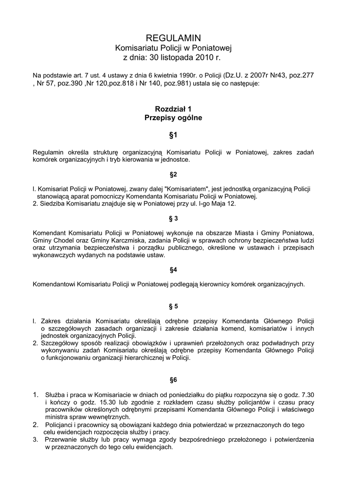 REGULAMIN Komisariatu Policji w Poniatowej z dnia: 30 listopada 2010 r. Na podstawie art. 7 ust. 4 ustawy z dnia 6 kwietnia 1990r. o Policji (Dz.U. z 2007r Nr43, poz.277 , Nr 57, poz.390 ,Nr 120,poz.818 i Nr 140, poz.981) ustala się co następuje: Rozdział 1 Przepisy ogólne §1 Regulamin określa strukturę organizacyjną Komisariatu Policji w Poniatowej, zakres zadań komórek organizacyjnych i tryb kierowania w jednostce. §2 l. Komisariat Policji w Poniatowej, zwany dalej "Komisariatem", jest jednostką organizacyjną Policji stanowiącą aparat pomocniczy Komendanta Komisariatu Policji w Poniatowej. 2. Siedziba Komisariatu znajduje się w Poniatowej przy ul. l-go Maja 12. §3 Komendant Komisariatu Policji w Poniatowej wykonuje na obszarze Miasta i Gminy Poniatowa, Gminy Chodel oraz Gminy Karczmiska, zadania Policji w sprawach ochrony bezpieczeństwa ludzi oraz utrzymania bezpieczeństwa i porządku publicznego, określone w ustawach i przepisach wykonawczych wydanych na podstawie ustaw. §4 Komendantowi Komisariatu Policji w Poniatowej podlegają kierownicy komórek organizacyjnych. §5 l. Zakres działania Komisariatu określają odrębne przepisy Komendanta Głównego Policji o szczegółowych zasadach organizacji i zakresie działania komend, komisariatów i innych jednostek organizacyjnych Policji. 2. Szczegółowy sposób realizacji obowiązków i uprawnień przełożonych oraz podwładnych przy wykonywaniu zadań Komisariatu określają odrębne przepisy Komendanta Głównego Policji o funkcjonowaniu organizacji hierarchicznej w Policji. §6 1. Służba i praca w Komisariacie w dniach od poniedziałku do piątku rozpoczyna się o godz. 7.30 i kończy o godz. 15.30 lub zgodnie z rozkładem czasu służby policjantów i czasu pracy pracowników określonych odrębnymi przepisami Komendanta Głównego Policji i właściwego ministra spraw wewnętrznych. 2. Policjanci i pracownicy są obowiązani każdego dnia potwierdzać w przeznaczonych do tego celu ewidencjach rozpoczęcia służby i pracy. 3. Przerwanie służby lub pracy wymaga zgody bezpośredniego przełożonego i potwierdzenia w przeznaczonych do tego celu ewidencjach. 2 §7 Komendant przyjmuje skargi i wnioski od poniedziałku do piątku w godz. 7.30-15.30 Rozdział 2 Struktura organizacyjna Komisariatu. §8 Ustala się następującą strukturę organizacyjną Komisariatu: 1. Kierownictwo: a) Komendant Komisariatu Policji b) Zastępca Komendanta Komisariatu Policji 2. Zespół Kryminalny 3. Jednoosobowe Stanowisko do spraw Wykroczeń 4. Zespół Patrolowo- Interwencyjny 5. Zespół Dzielnicowych 6. Zespół do spraw Administracyjno-Gospodarczych. Rozdział 3 Tryb kierowania w Komisariacie. §9 Komisariatem kieruje Komendant Komisariatu Policji w Poniatowej, zwany dalej "Komendantem" przy pomocy Zastępcy Komendanta Komisariatu Policji, kierowników komórek organizacyjnych oraz bezpośrednio podległych pracowników. § 10 Zadania i kompetencje Zastępcy Komendanta określają odrębne przepisy Komendanta. § 11 1. Komendant sprawuje nadzór nad Jednoosobowym Stanowiskiem do spraw Wykroczeń, Zespołem Patrolowo-Interwencyjnym, Zespołem Dzielnicowych i Zespołem do spraw Administracyjno-Gospodarczych. 2. Zastępca sprawuje nadzór nad Zespołem Kryminalnym. 3 § 12 1. Komórką organizacyjną Komisariatu kieruje jej kierownik przy pomocy zastępcy, kierowników podległych komórek organizacyjnych oraz bezpośrednio podległych policjantów. 2. Kierownik komórki organizacyjnej Komisariatu, zwany dalej "kierownikiem” realizuje zadania oraz reprezentuje Komendanta w kontaktach z podmiotami pozapolicyjnymi, w zakresie przypisanej właściwości rzeczowej wynikającej z zadań Komendanta, o których mowa w § 3 ust. 1. 3. Kierownik określa szczegółowe zadania zastępcy. 4. Komendant określa zadania podległej komórki organizacyjnej oraz zakresy czynności dla poszczególnych stanowisk służbowych. 5. Komendant jest obowiązany do niezwłocznej aktualizacji zadań i zakresów czynności, o których mowa w ust. 3 i 4. 6. Kierownika zastępuje w czasie jego nieobecności zastępca albo policjant lub pracownik wskazany przez tego kierownika. 7. Zastępowanie kierownika obejmuje wykonywanie zadań, o których mowa w regulaminie, chyba że kierownik określił inny zakres zastępstwa. 8. Kierownik może zlecać podległym policjantom lub pracownikom wykonywanie czynności innych niż ustalone w zakresach czynności dla stanowisk służbowych. 9. Kierownik obowiązany jest stwarzać warunki do sprawnej realizacji zadań służbowych, kształcenia i doskonalenia zawodowego oraz kształcenia właściwych postaw etycznych. Rozdział 4 Zakresy zadań komórek organizacyjnych Komisariatu. § 13 Zespół Kryminalny. W zakresie działania w/w referatu pozostaje przede wszystkim: 1. Rozpoznawanie, zapobieganie oraz zwalczanie przestępstw kryminalnych i gospodarczych a także wykrywanie ich sprawców. 2. Prowadzenie dochodzeń i śledztw zleconych, postępowań sprawdzających oraz wykonywanie czynności w trybie art.308 kpk 3. Współpraca z Prokuraturą i Sądem w zakresie prowadzonych postępowań przygotowawczych. 4. Prowadzenie odpowiednich rejestracji statystycznych i kryminalistycznych zgodnie z przepisami. 4 § 14 Jednoosobowe Stanowisko do spraw Wykroczeń: W zakresie działania w/w Stanowiska pozostaje przede wszystkim: 1. Organizowanie, wykonywanie oraz wspomaganie działań Policji w zakresie zapobiegania i zwalczania wykroczeń oraz współdziałania na obszarze działania Komisariatu Policji w Poniatowej w tym zakresie z organami ochrony prawnej, administracji publicznej oraz organizacjami społecznymi, inicjowanie lokalnej polityki zapobiegania, ujawniania i ścigania sprawców wykroczeń; 2. Rejestracja oraz prowadzenie ewidencji postępowań w sprawach o wykroczenia; 3. Prowadzenie wskazanych analiz stanu zagrożenia wykroczeniami; 4. Planowanie i organizowanie działań własnych związanych z realizacją zada