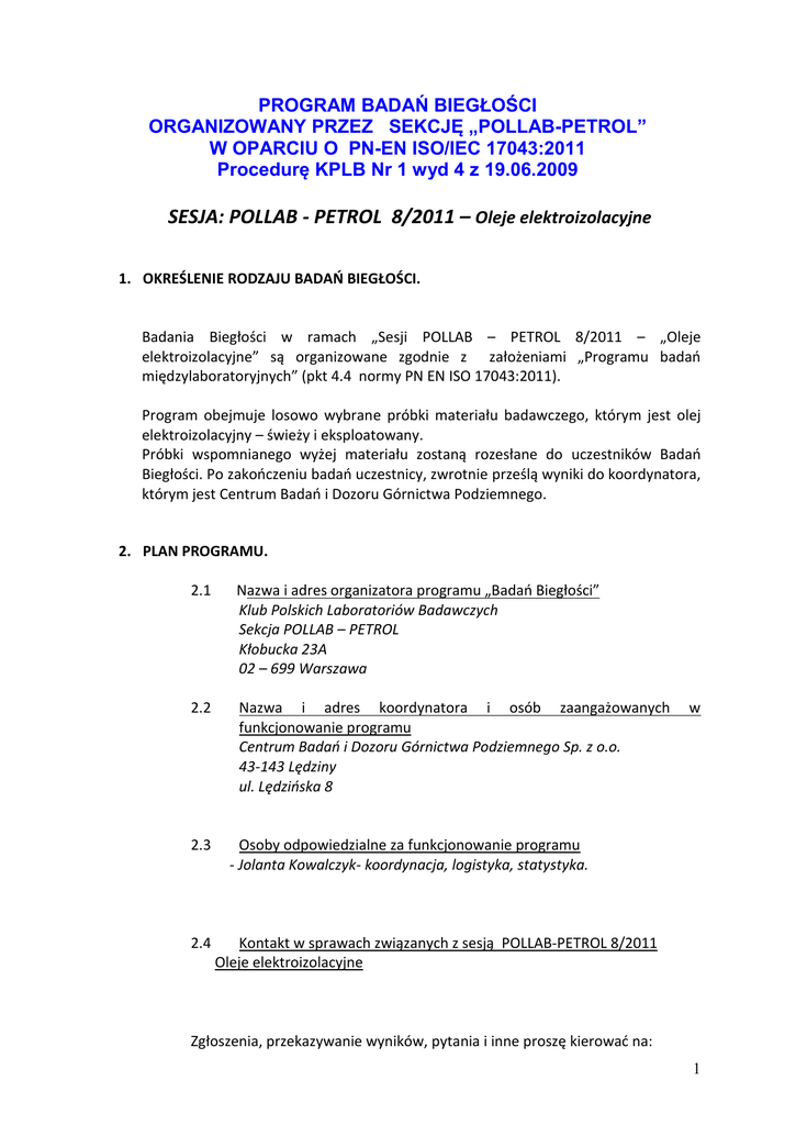 PROGRAM BADAŃ BIEGŁOŚCI ORGANIZOWANY PRZEZ SEKCJĘ „POLLAB-PETROL” W OPARCIU O PN-EN ISO/IEC 17043:2011 Procedurę KPLB Nr 1 wyd 4 z 19.06.2009 SESJA: POLLAB - PETROL 8/2011 – Oleje elektroizolacyjne 1. OKREŚLENIE RODZAJU BADAŃ BIEGŁOŚCI. Badania Biegłości w ramach „Sesji POLLAB – PETROL 8/2011 – „Oleje elektroizolacyjne” są organizowane zgodnie z założeniami „Programu badao międzylaboratoryjnych” (pkt 4.4 normy PN EN ISO 17043:2011). Program obejmuje losowo wybrane próbki materiału badawczego, którym jest olej elektroizolacyjny – świeży i eksploatowany. Próbki wspomnianego wyżej materiału zostaną rozesłane do uczestników Badao Biegłości. Po zakooczeniu badao uczestnicy, zwrotnie prześlą wyniki do koordynatora, którym jest Centrum Badao i Dozoru Górnictwa Podziemnego. 2. PLAN PROGRAMU. 2.1 Nazwa i adres organizatora programu „Badao Biegłości” Klub Polskich Laboratoriów Badawczych Sekcja POLLAB – PETROL Kłobucka 23A 02 – 699 Warszawa 2.2 Nazwa i adres koordynatora i osób zaangażowanych funkcjonowanie programu Centrum Badao i Dozoru Górnictwa Podziemnego Sp. z o.o. 43-143 Lędziny ul. Lędzioska 8 2.3 2.4 w Osoby odpowiedzialne za funkcjonowanie programu - Jolanta Kowalczyk- koordynacja, logistyka, statystyka. Kontakt w sprawach związanych z sesją POLLAB-PETROL 8/2011 Oleje elektroizolacyjne Zgłoszenia, przekazywanie wyników, pytania i inne proszę kierowad na: 1 Jolanta Kowalczyk Centrum Badao i Dozoru Górnictwa Podziemnego Sp. z o.o. 43-143 Lędziny ul. Lędzioska 8 tel. 32 32 42 251, kom. 513 121 383 e-mail: [email protected] 2.5 Charakter i cel programu Badanie biegłości – „Sesja POLLAB – PETROL 8/2011 – Oleje elektroizolacyjne” jest skierowane głównie do laboratoriów zrzeszonych w Sekcji POLLAB-PETROL, które w zakresie analitycznym posiadają wdrożone metody badawcze oceny właściwości oleju elektroizolacyjnego. Celem programu jest zewnętrzna kontrola jakości wykonywanych badao 2.5 Kryteria jakie powinny spełniad laboratoria uczestniczące W Badaniu Biegłości – „Sesji POLLAB – 8/2011 – Oleje elektroizolacyjne” mogą uczestniczyd laboratoria będące członkami Sekcji, zarówno laboratoria akredytowane jak i pozostałe. Dopuszcza się również udział laboratoriów nie zrzeszonych w KLUBIE. 2.6 Uzasadnienie wyboru obiektów i rodzajów badao obiektów Obiektem badao są oleje elektroizolacyjne, stosowane w elektrotechnice w sieciach nisko i wysokonapięciowych, transformatorach, aparaturze łączeniowej i sterowniczej. Oleje te podlegają badaniu w różnym zakresie w zależności od przeznaczenia w momencie zalania do aparatury oraz podczas jej eksploatacji. 2.7 Opis sposobu uzyskania, i transportowania obiektów badao przygotowania, sprawdzenia Materiał badawczy będą stanowid dwie próbki oleju: - olej czysty zakupiony bezpośrednio u producenta. - olej eksploatowany pozyskany od użytkownika Wszystkie próbki równoległe będą pozyskane poprzez podział próbki tego materiału badawczego i rozesłane do uczestników „Badania Biegłości” pocztą kurierską. 2.8 Opis informacji przekazywanych uczestnikom „Badao Biegłości” i harmonogram poszczególnych faz (etapów) realizacji programu a - Formularz zgłoszeniowy. b - Tekst programu. c - Formularz sprawozdania z zakresem badao (arkusz MS Excel) 2 d. - Sprawozdanie z badao z nadanym kodem uczestnika. Fazy programu: a - Przygotowanie materiału badawczego. b - Zebranie dokumentacji. c - Rozesłanie próbek równoległych i formularzy sprawozdania. d - Zebranie wyników badao. e - Opracowanie sprawozdania z „Badao Biegłości” wraz z oceną osiągnięd. f - Rozesłanie sprawozdao z wyników do uczestników „Badao Biegłości”. 2.9 Ramy czasowe wykonania badao SESJA: POLLAB - PETROL 8/2011 – Oleje elektroizolacyjne Data rozpoczęcia – zebranie formularzy zgłoszeniowych do Data rozesłania próbek oleju elektroizolacyjnego do Data przesłania wyników badao do koordynatora Data zakooczenia sesji i rozesłania wyników 20.11.2011 30.11.2011 30.12.2011 28.02.2012 2.10. Informacje o metodach badao objętych programem Sposób podawania wyników wg norm czynnościowych. Tabela 1 L.p. 1 Parametr Gęstośd w 200C Jednostka g/cm3 2 Lepkośd kinematyczna w 400C Temperatura zapłonu w tyglu zamkniętym Temperatura płynięcia Zawartośd wody met. KF mm2/s 0 C 0 C mg/kg Liczba kwasowa Napięcie przebicia w temp. 200C –wartośd średnia/względne odchylenie standardowe Rezystywnośd w temp. 500C Współczynnik strat dielektrycznych w temp. 500C Klasa czystości Analiza chromatograficzna - całkowita zawartośd gazu w oleju - skład i koncentracja gazu z oleju mg KOH/g kV/- Zawartośd 2 furfuralu Obecnośd siarki potencjalnie korozyjnej mg/kg --- 3 4 5 6 7 8 9 10 11 12 13 gΩm kod % *µl/l+ Metoda PN-EN ISO 3675 PN-EN ISO 12185 PN-EN ISO 3104 PN-EN ISO 2719 PN ISO 3016 PN-EN ISO 12937 PN-EN 60814 PN-EN 62021-1 PN-EN 60156 PN-EN 60247 PN-EN 60247 PN-ISO 4406 chromatografia gazowa PN-EN 60599 PN-EN 60567 PN-EN 61198 PN-EN 62535 3 2.11 Opis metod statystycznych stosowanych do oceny osiągnięd laboratoriów uczestniczących w programie 2.11.1 Oznaczenie wartości przypisanej(należnej) – wartością tą jest średnia arytmetyczna obliczona z wyników podanych przez uczestników „Badania Biegłości”. Do obliczenia nie będą brane wartości statystycznie odbiegające od średniej. Do weryfikacji tych wartości zostanie użyty „Test Grubbsa.” 2.11.2 W zakres obliczeo statystycznych wchodzą: - obliczenie wartości: x, z (wskaźnik z-score) Z-SCORE jest wyznaczany z wykorzystaniem odchylenia standardowego odtwarzalności metody. Wyniki zostaną poddane obróbce statystycznej jeżeli będzie co najmniej 5 wyników w zakresie badawczym danej metodyki. 2.12 Podstawy metod stosowanych do oceny Ocena wykonania badania polega na obliczeniu dla każdego wyniku parametru z (wskaźnik z-score). Kryteria oceny są następu