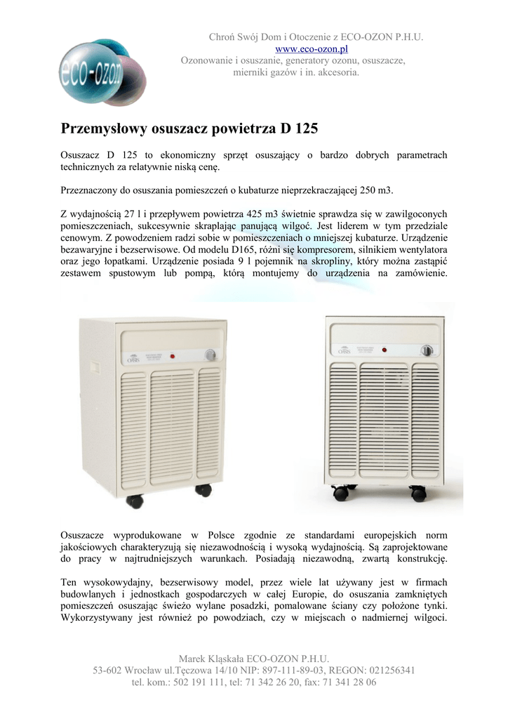 Chroń Swój Dom i Otoczenie z ECO-OZON P.H.U. www.eco-ozon.pl Ozonowanie i osuszanie, generatory ozonu, osuszacze, mierniki gazów i in. akcesoria. Przemysłowy osuszacz powietrza D 125 Osuszacz D 125 to ekonomiczny sprzęt osuszający o bardzo dobrych parametrach technicznych za relatywnie niską cenę. Przeznaczony do osuszania pomieszczeń o kubaturze nieprzekraczającej 250 m3. Z wydajnością 27 l i przepływem powietrza 425 m3 świetnie sprawdza się w zawilgoconych pomieszczeniach, sukcesywnie skraplając panującą wilgoć. Jest liderem w tym przedziale cenowym. Z powodzeniem radzi sobie w pomieszczeniach o mniejszej kubaturze. Urządzenie bezawaryjne i bezserwisowe. Od modelu D165, różni się kompresorem, silnikiem wentylatora oraz jego łopatkami. Urządzenie posiada 9 l pojemnik na skropliny, który można zastąpić zestawem spustowym lub pompą, którą montujemy do urządzenia na zamówienie. Osuszacze wyprodukowane w Polsce zgodnie ze standardami europejskich norm jakościowych charakteryzują się niezawodnością i wysoką wydajnością. Są zaprojektowane do pracy w najtrudniejszych warunkach. Posiadają niezawodną, zwartą konstrukcję. Ten wysokowydajny, bezserwisowy model, przez wiele lat używany jest w firmach budowlanych i jednostkach gospodarczych w całej Europie, do osuszania zamkniętych pomieszczeń osuszając świeżo wylane posadzki, pomalowane ściany czy położone tynki. Wykorzystywany jest również po powodziach, czy w miejscach o nadmiernej wilgoci. Marek Kląskała ECO-OZON P.H.U. 53-602 Wrocław ul.Tęczowa 14/10 NIP: 897-111-89-03, REGON: 021256341 tel. kom.: 502 191 111, tel: 71 342 26 20, fax: 71 341 28 06 Chroń Swój Dom i Otoczenie z ECO-OZON P.H.U. www.eco-ozon.pl Ozonowanie i osuszanie, generatory ozonu, osuszacze, mierniki gazów i in. akcesoria. Specyfikacja techniczna D 125 Wydajność osuszaczy liczona w litrach skroplonej wody / dobę Wydajność znamionowa* Higrostat Zakres temperatur pracy Typ czynnika chłodzącego Moc Przepływ powietrza System odmrażania Wskaźnik wypełnienia zbiornika wody Automatyczny wyłącznik przelewowy Pojemność zbiornika Możliwość dołączenia systemu odprowadzania wody Wysoka wydajność osuszania Filtr powietrza System zapobiegania oblodzeniu Kółka z blokadą Idealnie funkcjonuje w pomieszczeniach 27,0 6ºC - 43ºC R134a 360 W 425 m3 zawór gazowy 9 l. 250m3 Zaprojektowany w USA, wyprodukowany w UE (Polska) Obudowa stalowa, laminowana Waga: 22,7 kg Wymiary: Wysokość Szerokość Głębokość 60.5 cm 38.0 cm 36.2 cm * wydajność znamionowa dla osuszaczy liczona jest w warunkach 36ºC, 90% wilgotności względnej Marek Kląskała ECO-OZON P.H.U. 53-602 Wrocław ul.Tęczowa 14/10 NIP: 897-111-89-03, REGON: 021256341 tel. kom.: 502 191 111, tel: 71 342 26 20, fax: 71 341 28 06 Chroń Swój Dom i Otoczenie z ECO-OZON P.H.U. www.eco-ozon.pl Ozonowanie i osuszanie, generatory ozonu, osuszacze, mierniki gazów i in. akcesoria. Rozkład wydajności skraplania w zależności od warunków klimatycznych: wilgotności i temperatury dla urządzenia DH 125: • Przy 10ºC, 70% Wilgotności względnej • Przy 20ºC, 60% Wilgotności względnej 6,4 litrów wody / dobę 7,4 litrów wody / dobę • Przy 28ºC, 60% Wilgotności względnej • Przy 30ºC, 80% Wilgotności względnej 12,8 litrów wody / dobę 22,4 litrów wody / dobę max 27 l wody / dobę Budowa i opis działania: Osuszacz jest urządzeniem stacjonarnym. Konstrukcja opiera się na ramie zmontowanej z blach stalowych. Kompresor pompuje gaz R 134a do zamkniętego układu chłodzenia. Poprzez układ cienkich rurek gaz wpompowywany jest do parownika gdzie następuje jego rozprężenie. Podczas rozprężania gaz schładza parownik. Z parownika poprzez kondensator, gaz oddając ciepło powraca do kompresora i cykl się powtarza. Powietrze napędzane przez wentylator przedmuchiwane jest przez parownik. Wilgoć zawarta w powietrzu osadza się na ściankach parownika. Tak powstały kondensat pary wodnej skraplany jest do pojemnika na skropliny. W pojemniku zainstalowany jest pływak, który podnosząc się wraz z cieczą do pozycji maksymalnej pobudza wyłącznik. Wyłącznik wyłącza urządzenie oraz wysyła sygnał elektryczny do lampki kontrolnej informując użytkownika o konieczności wypróżnienia zbiornika na skropliny.W urządzeniu istnieje opcja podłączenia spustu bezpośrednio do okapnika. Urządzenie zaopatrzone jest w automatyczny układ zapobiegający zmrożeniu parownika. Płytka sterująca co 20 min, wysyła sygnał elektryczny do elektrozaworu otwierającego obieg ciepłego gazu, który rozmraża parownik. Regulowany higrostat włącza i wyłącza urządzenie w zależności od zadanej wilgotności pozwalając utrzymać zadane parametry klimatyczne. Kompresor urządzenia zaopatrzony jest w zawory membranowe, które umożliwiają pochylanie urządzenia a nawet obrócenie go "do góry nogami" podczas transportu. Urządzenie zaopatrzone jest w kółka pozwalające na łatwe przemieszczanie. Marek Kląskała ECO-OZON P.H.U. 53-602 Wrocław ul.Tęczowa 14/10 NIP: 897-111-89-03, REGON: 021256341 tel. kom.: 502 191 111, tel: 71 342 26 20, fax: 71 341 28 06 Chroń Swój Dom i Otoczenie z ECO-OZON P.H.U. www.eco-ozon.pl Ozonowanie i osuszanie, generatory ozonu, osuszacze, mierniki gazów i in. akcesoria. Dwa przednie kółka posiadają blokadę. Uchwyty w obudowie ułatwiają przenoszenie urządzenia. Z tyłu osuszacza zamontowany jest filtr powietrza. Filtr jest łatwy do demontażu i czyszczenia. Filtr najlepiej przedmuchiwać sprężonym powietrzem lub spłukać wodą. Nie wymaga wymiany. Obudowę osuszacza wykonano z blachy przygotowanej antykorozyjnie oraz laminowanej z zewnątrz. Zapewnia to długotrwałą odporność przed korozją nawet w najtrudniejszych warunkach klimatycznych. Poniżej zdjęcie rozmontowanego urządzenia z opisem poszczególnych części: Marek Kląskała ECO-OZON P.H.U. 53-602 Wrocław ul.Tęczowa 14/10 NIP: 897