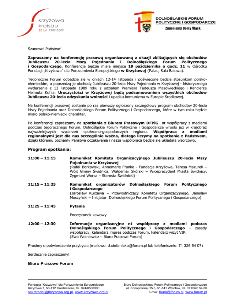 Szanowni Państwo! Zapraszamy na konferencję prasową organizowaną z okazji zbliżających się obchodów Jubileuszu 20-lecia Mszy Pojednania i Dolnośląskiego Forum Politycznego i Gospodarczego. Konferencja będzie miała miejsce 19 października o godz. 11 w Ośrodku Fundacji „Krzyżowa” dla Porozumienia Europejskiego w Krzyżowej (Pałac, Sala Balowa). Tegoroczne Forum odbędzie się w dniach 12-14 listopada i poświęcone będzie stosunkom polskoniemieckim, a poprzedzą je obchody Jubileuszu 20-lecia Mszy Pojednania w Krzyżowej - historycznego wydarzenia z 12 listopada 1989 roku z udziałem Premiera Tadeusza Mazowieckiego i Kanclerza Helmuta Kohla. Uroczystości w Krzyżowej będą podsumowaniem wszystkich obchodów Jubileuszu 20-lecia odzyskania wolności i upadku komunizmu w Europie Środkowej. Na konferencji prasowej zostanie po raz pierwszy ogłoszony szczegółowy program obchodów 20-lecia Mszy Pojednania oraz Dolnośląskiego Forum Politycznego i Gospodarczego, które w tym roku będzie miało polsko-niemiecki charakter. Po konferencji zapraszamy na spotkanie z Biurem Prasowym DFPiG nt współpracy z mediami podczas tegorocznego Forum. Dolnośląskie Forum Polityczne i Gospodarcze wrosło już w krajobraz najważniejszych wydarzeń społeczno-gospodarczych regionu. Współpraca z mediami regionalnymi jest dla nas szczególnie ważna, dlatego liczymy na spotkanie z Państwem, dzięki któremu poznamy Państwa oczekiwania i nasza współpraca będzie się układała wzorcowo. Program spotkania: 11:00 – 11:15 Komunikat Komitetu Organizacyjnego Jubileuszu 20-lecia Mszy Pojednania w Krzyżowej (Rafał Borkowski, Annemarie Franke - Fundacja Krzyżowa, Teresa Mazurek – Wójt Gminy Świdnica, Waldemar Skórski – Wiceprezydent Miasta Świdnicy, Zygmunt Worsa – Starosta Świdnicki) 11:15 – 11:25 Komunikat organizatorów Dolnośląskiego Forum Politycznego i Gospodarczego (Jarosław Kurzawa – Przewodniczący Komitetu Organizacyjnego, Janisław Muszyński – Inicjator Dolnośląskiego Forum Politycznego i Gospodarczego) 11:25 – 11:45 Pytania Poczęstunek kawowy 12:00 – 12:30 Informacje organizacyjne nt współpracy z mediami podczas Dolnośląskiego Forum Politycznego i Gospodarczego – zasady współpracy, kalendarz imprez podczas Forum, kalendarz wizyt VIP. (Ewa Wolniewicz – Biuro Prasowe Forum) Prosimy o potwierdzenie przybycia (mailowo: [email protected] lub telefonicznie: 71 326 54 07) Serdecznie zapraszamy! Biuro Prasowe Forum Fundacja “Krzyżowa” dla Porozumienia Europejskiego Krzyżowa 7, 58-112 Grodziszcze, tel. 074/8500300 [email protected], www.krzyżowa.org.pl Biuro Dolnośląskiego Forum Politycznego i Gospodarczego ul. Konopnickiej 15 b, 51-141 Wrocław, tel. 071/326 54 00 e-mail: [email protected], www.forum.pl