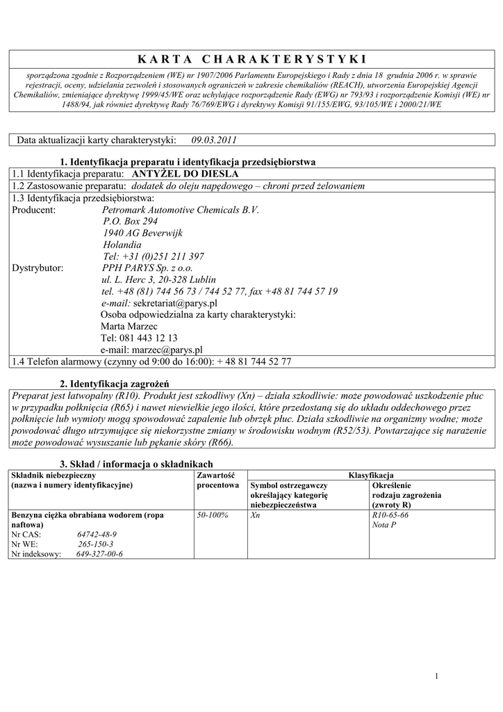 KARTA CHARAKTERYSTYKI sporządzona zgodnie z Rozporządzeniem (WE) nr 1907/2006 Parlamentu Europejskiego i Rady z dnia 18 grudnia 2006 r. w sprawie rejestracji, oceny, udzielania zezwoleń i stosowanych ograniczeń w zakresie chemikaliów (REACH), utworzenia Europejskiej Agencji Chemikaliów, zmieniające dyrektywę 1999/45/WE oraz uchylające rozporządzenie Rady (EWG) nr 793/93 i rozporządzenie Komisji (WE) nr 1488/94, jak również dyrektywę Rady 76/769/EWG i dyrektywy Komisji 91/155/EWG, 93/105/WE i 2000/21/WE Data aktualizacji karty charakterystyki: 09.03.2011 1. Identyfikacja preparatu i identyfikacja przedsiębiorstwa 1.1 Identyfikacja preparatu: ANTYŻEL DO DIESLA 1.2 Zastosowanie preparatu: dodatek do oleju napędowego – chroni przed żelowaniem 1.3 Identyfikacja przedsiębiorstwa: Producent: Petromark Automotive Chemicals B.V. P.O. Box 294 1940 AG Beverwijk Holandia Tel: +31 (0)251 211 397 Dystrybutor: PPH PARYS Sp. z o.o. ul. L. Herc 3, 20-328 Lublin tel. +48 (81) 744 56 73 / 744 52 77, fax +48 81 744 57 19 e-mail: [email protected] Osoba odpowiedzialna za karty charakterystyki: Marta Marzec Tel: 081 443 12 13 e-mail: [email protected] 1.4 Telefon alarmowy (czynny od 9:00 do 16:00): + 48 81 744 52 77 2. Identyfikacja zagrożeń Preparat jest łatwopalny (R10). Produkt jest szkodliwy (Xn) – działa szkodliwie: może powodować uszkodzenie płuc w przypadku połknięcia (R65) i nawet niewielkie jego ilości, które przedostaną się do układu oddechowego przez połknięcie lub wymioty mogą spowodować zapalenie lub obrzęk płuc. Działa szkodliwie na organizmy wodne; może powodować długo utrzymujące się niekorzystne zmiany w środowisku wodnym (R52/53). Powtarzające się narażenie może powodować wysuszanie lub pękanie skóry (R66). 3. Skład / informacja o składnikach Składnik niebezpieczny (nazwa i numery identyfikacyjne) Zawartość procentowa Benzyna ciężka obrabiana wodorem (ropa naftowa) Nr CAS: 64742-48-9 Nr WE: 265-150-3 Nr indeksowy: 649-327-00-6 50-100% Symbol ostrzegawczy określający kategorię niebezpieczeństwa Xn Klasyfikacja Określenie rodzaju zagrożenia (zwroty R) R10-65-66 Nota P 1 KARTA CHARAKTERYSTYKI sporządzona zgodnie z Rozporządzeniem (WE) nr 1907/2006 Parlamentu Europejskiego i Rady z dnia 18 grudnia 2006 r. w sprawie rejestracji, oceny, udzielania zezwoleń i stosowanych ograniczeń w zakresie chemikaliów (REACH), utworzenia Europejskiej Agencji Chemikaliów, zmieniające dyrektywę 1999/45/WE oraz uchylające rozporządzenie Rady (EWG) nr 793/93 i rozporządzenie Komisji (WE) nr 1488/94, jak również dyrektywę Rady 76/769/EWG i dyrektywy Komisji 91/155/EWG, 93/105/WE i 2000/21/WE Dodatek utrzymujący płynność paliwa w niskich 3,5-5% temperaturach (mieszanina złożona z poniższych substancji niebezpiecznych): 70-79,9% Solwent nafta (ropa naftowa) węglowodory ciężkie aromatyczne Nr CAS: 64742-94-5 Nr WE: 265-198-5 Nr indeksowy: 649-424-00-3 1-7,4% Naftalen Nr CAS: 91-20-3 Nr WE: 202-049-5 Nr indeksowy: 601-052-00-2 1-4,9% Trimetylobenzen Nr CAS: 25551-13-7 Nr WE: 247-099-9 Nr indeksowy: 1,7% 1, 2, 4 trimetylobenzen Nr CAS: 95-63-6 Nr WE: 202-436-9 Nr indeksowy: 601-043-00-3 Pełne treści zwrotów R podano w punkcie 16. Xn, N R36/38-40-51/53-65 Xn R65 Xn, N R22-40-50-53 Rakotw. Kat.3 Xn R21/22-38 Xn, Xi, N R10-20-36/37/38-51-53 4. Pierwsza pomoc Informacje ogólne: Powinny być przestrzegane zwykłe środki ostrożności jak przy pracy z chemikaliami. W przypadku wystąpienia jakichkolwiek niepokojących objawów skontaktować się z lekarzem. Sprawdzić funkcje życiowe. Osobę nieprzytomną mającą kłopoty z oddychaniem utrzymać w pozycji półsiedzącej. W przypadku utraty przytomności utrzymać oddychanie. W przypadku wystąpienia wymiotów należy chronić przed uduszeniem / zagrożenie zapalenia płuc. Zapobiegać wychłodzeniu poprzez okrycie poszkodowanego (nie ogrzewać poszkodowanego). Spożycie alkoholu wzmaga toksyczność. . Po narażeniu inhalacyjnym: Przewietrzyć pomieszczenie. Wyprowadzić poszkodowanego ze skażonej atmosfery (ratownicy muszą być chronieni środkami ochrony osobistej). Zapewnić mu spokój w miejscu dobrze wentylowanym. W przypadku trudności w oddychaniu podać tlen a w przypadku jego zatrzymania zastosować sztuczne oddychanie. Skonsultować się z lekarzem. W wyniku kontaktu ze skórą: Natychmiast zdjąć zanieczyszczoną odzież. Skórę, która miała bezpośredni kontakt z preparatem lub były podejrzenia, że mógł on zaistnieć, niezwłocznie przemyć dużą ilością wody, ewentualnie z mydłem. Zapewnić poszkodowanemu konsultację dermatologiczną. W wyniku kontaktu z oczami: Usunąć szkła kontaktowe. Przemywać oczy dużą ilością letniej wody co najmniej 10 min. (przy odwiniętych powiekach), unikać silnego strumienia wody ze względu na ryzyko uszkodzenia rogówki, w przypadku zanieczyszczenia jednego oka chronić w trakcie przemywania drugie oko przed zanieczyszczeniem. Przyłożyć opatrunek ze sterylnej gazy lub suchej i czystej chusteczki. Nie stosować żadnych kropli ani maści do oczu. Natychmiast skontaktować się z lekarzem. Uwaga: osoby narażone na skażenie oczu powinny być pouczone o konieczności i sposobie ich natychmiastowego płukania. Po połknięciu: Nie prowokować wymiotów. Nieprzytomnej osobie nie podawać nic doustnie. Opłukać usta dużą ilością czystej wody. Natychmiast wezwać lekarza, pokazać opakowanie, etykietę lub kartę charakterystyki. 5. Postępowanie w przypadku pożaru Odpowiednie środki gaśnicze: piany (poliwalent, AFFF, alkoholowa) 2 KARTA CHARAKTERYSTYKI sporządzona zgodnie z Rozporządzeniem (WE) nr 1907/2006 Parlamentu Europejskiego i Rady z dnia 18 grudnia 2006 r. w sprawie rejestracji, oceny, udzielania zezwoleń i stosowanych ograniczeń w zakresie chemikaliów (REACH), utworzenia Europejskiej Agencji Chemikaliów, zmieniające dyrektywę 1999/45/WE oraz uchylające rozporządzenie Rady (EWG) nr 793/93