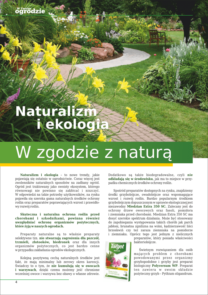 Naturalizm i ekologia W zgodzie z naturą Naturalizm i ekologia – to nowe trendy, jakie pojawiają się ostatnio w ogrodnictwie. Coraz więcej jest zwolenników naturalnych sposobów na zadbany ogród. Ogród jest traktowany jako swoisty ekosystem, którego równowagi nie powinno się zakłócać i niszczyć. W odpowiedzi na takie potrzeby użytkowników, na rynku pojawiła się szeroka gama naturalnych środków ochrony roślin oraz preparatów poprawiających wzrost i prawidłowy rozwój roślin. Skuteczna i naturalna ochrona roślin przed chorobami i szkodnikami, powinna również uwzględniać ochronę organizmów pożytecznych, które żyją w naszych ogrodach. Preparaty naturalne są to właśnie preparaty selektywne tzn. nie stwarzają zagrożenia dla pszczół, trzmieli, złotooków, biedronek oraz dla innych organizmów pożytecznych, co jest bardzo cenne w przypadku zakładania ogrodów ekologicznych. Kolejną pozytywną cechą naturalnych środków jest fakt, że mają minimalny lub zerowy okres karencji. Świadczy to o tym, że nie kumulują się w owocach i warzywach, dzięki czemu możemy jeść chronione wcześniej owoce i warzywa bez obawy o własne zdrowie. 4 Dodatkowo są także biodegradowalne, czyli nie odkładają się w środowisku, jak ma to miejsce w przypadku chemicznych środków ochrony roślin. Spośród preparatów dostępnych na rynku, znajdziemy środki grzybobójcze, owadobójcze oraz wspomagające wzrost i rozwój roślin. Bardzo popularnym środkiem grzybobójczym dopuszczonym w uprawie ekologicznej jest niezawodny Miedzian Extra 350 SC. Zalecany jest do ochrony drzew owocowych oraz fasoli, pomidora i ziemniaka przed chorobami. Miedzian Extra 350 SC ma dosyć szerokie spektrum działania. Może być stosowany do zapobiegania występowania takich chorób jak parch jabłoni, brunatna zgnilizna na wiśni, kędzierzawość liści brzoskwiń czy też zaraza ziemniaka na pomidorze i ziemniaku. Oprócz tego jest jednym z nielicznych preparatów, który posiada właściwości bakteriobójcze. Świetnym rozwiązaniem dla osób mających problem z chorobami powodowanymi przez organizmy grzybopodobne i grzyby jest preparat biologiczny Polyversum WP. Preparat ten zawiera w swoim składzie pożyteczny grzyb – Pythium oligandrum. Jest to niepatogeniczny gatunek, który jest pasożytem grzybów powodujących takie choroby jak szara pleśń, zgorzel zgnilakowa, fytoftoroza, zgnilizna twardzikowa i wiele innych, które porażają warzywa, truskawkę i rośliny ozdobne. Jego pozytywne działanie polega na tym, że zasiedla strefę korzeniową rozwijających się roślin eliminując tym samym organizmy grzybopodobne i grzyby infekujące rośliny przez korzenie. Grzybnia stykając się z tkanką rośliny wprowadza do niej fitohormony stymulując roślinę do dalszego wzrostu. Uzupełnieniem naturalnych środków ochrony roślin jest niewątpliwie biostymulator Asahi SL , który dotychczas był znany tylko rolnikom i profesjonalnym ogrodnikom. Preparat ten powinien być stosowany wówczas, gdy rośliny zostały narażone na działanie czynników stresowych takich jak np. przymrozki, susza, przesadzanie, uszkodzenie roślin chemicznymi środkami ochrony roślin, nawozami czy też innymi substancjami szkodliwymi (paliwo, detergenty, mocz psi). Każdy z miłośników ogrodów powinien koniecznie go mieć w swoim magazynku. Co ciekawe ostatnie badania uczonych wskazują, że w pewnym stopniu biostymulator Asahi SL ogranicza wzrost grzybów powodujących choroby roślin. Dzięki temu nasze rośliny będą zdrowsze i piękniejsze. Innym bardzo przydatnym preparatem, który wspomaga wzrost roślin jest zawierający węglan potasu Omni Protect. Ma on jeszcze jedną zaletę, a mianowicie wspomaga ochronę jabłoni przed parchem. Z kolei preparat Boni Protect Forte zawiera w swoim składzie szczepy grzybów, które zapobiegają infekcji oraz dalszemu rozwojowi takich chorób jak szara pleśń na truskawce czy też brunatna zgnilizna drzew pestkowch (monilioza). Co ważne, obydwa te preparaty nie mają określonego okresu karencji (czas jaki musi minąć od momentu wykonania zabiegu chemicznego do zbioru rośliny przeznaczonej do konsumpcji) ponieważ nie stwierdzono pozostałości tych preparatów w chronionych owocach. Także bezpiecznym i ciekawym środkiem jest preparat SB Flora3Active. Dzięki swojemu unikalnemu działaniu łączy w sobie cechy środka grzybo i owadobójczego jednocześnie spełnia także funkcje odżywki dolistnej (zawiera około 10% azotu oraz 0,37% związków żelaza). Produkt jest znany w całej Europie Zachodniej. Stosowany jest z powodzeniem od lat przez hobbystów i miłośników roślin. Jego niewątpliwym sukcesem jest fakt, iż jest biodegradowalny i nie stanowi zagrożenia dla środowiska naturalnego. Warto także opisać nowy produkt, jakim jest BioMass Sugar. W składzie tego preparatu wchodzi unikalna kompozycja złożona z cukrów, makroelementów oraz pierwiastków śladowych, które zostały uzyskane z surowców odnawialnych. Preparat ten ma za zadanie stymulować wzrost i rozwój systemu korzeniowego. Dzięki regulacji stosunku węgla i azotu w glebie wpływa na intensyfikację życia biologicznego gleby poprzez rozwój organizmów pożytecznych. Przyczynia się także do poprawy właściwości gleby dzięki większej liczbie drobnoustrojów pożytecznych i ich relacji symbiotycznych z roślinami. Po zastosowaniu na roślinie wzmacnia ją chroniąc tym samym przed negatywnymi czynnikami i infekcjami np. przez naturalne ograniczenie populacji szkodników glebowych tj. nicieni czy pędraków. Jeśli natomiast chodzi o przyjazne środowisku środki owadobójcze to można podać tu przykład preparatu Spintor 240 SC, którego substancją aktywną są tzw. spinozyny. Substancja aktywna uniemożliwia prawidłowe działanie systemu nerwowego szkodników, a objawy działania środka występują w ciągu kilkunastu minut po zabiegu. Preparat ten zarej