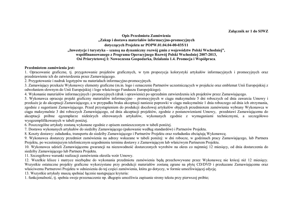 Załącznik nr 1 do SIWZ Opis Przedmiotu Zamówienia „Zakup i dostawa materiałów informacyjno-promocyjnych dotyczących Projektu nr POPW.01.04.04-00-035/11 „Inwestycje i turystyka – szansą na dynamiczny rozwój gmin z województw Polski Wschodniej”, współfinansowanego z Programu Operacyjnego Rozwój Polski Wschodniej 2007-2013, Osi Priorytetowej I: Nowoczesna Gospodarka, Działania 1.4. Promocja i Współpraca. Przedmiotem zamówienia jest: 1. Opracowanie graficzne, tj. przygotowanie projektów graficznych, w tym propozycja kolorystyki artykułów informacyjnych i promocyjnych oraz przedstawienie ich do zatwierdzenia przez Zamawiającego. 2. Przygotowanie i nadruk logotypów na materiałach informacyjno-promocyjnych. 3. Zamawiający przekaże Wykonawcy elementy graficzne (m.in. logo i oznaczenie Partnerów uczestniczących w projekcie oraz emblemat Unii Europejskiej z odwołaniem słownym do Unii Europejskiej i logo właściwego Funduszu Europejskiego). 4. Wykonanie materiałów informacyjnych i promocyjnych (druk i oprawienie) po uprzednim zatwierdzeniu ich projektów przez Zamawiającego. 5. Wykonawca opracuje projekt graficzny materiałów informacyjno – promocyjnych w ciągu maksymalnie 5 dni roboczych od dnia zawarcia Umowy i przekaże je do akceptacji Zamawiającego, a w przypadku braku akceptacji naniesie poprawki w ciągu maksymalnie 1 dnia roboczego od dnia ich otrzymania, zgodnie z sugestiami Zamawiającego. Przed przystąpieniem do produkcji docelowej artykułów objętych przedmiotem zamówienia wybrany Wykonawca w ciągu maksymalnie 3 dni roboczych Zamawiającego, od dnia akceptacji projektów, zgodnie z postanowieniami Umowy, przedstawi Zamawiającemu do akceptacji próbne egzemplarze niektórych oferowanych artykułów, wykonanych zgodnie z wymaganiami technicznymi, a szczegółowo wyegzemplifikowanych w tabeli poniżej. 6. Poszczególne artykuły zostaną wykonane zgodnie z opisem zamieszczonym w tabeli poniżej. 7. Dostawa wykonanych artykułów do siedziby Zamawiającego (pakowanie według standardów) i Partnerów Projektu. 8. Koszty dostawy: załadunku, transportu do siedziby Zamawiającego i Partnerów Projektu oraz rozładunku obciążają Wykonawcę. 9. Wykonawca dostarczy przedmiot zamówienia na adresy wskazane w tabeli poniżej: w dni robocze, w godzinach pracy Zamawiającego, lub Partnera Projektu, po wcześniejszym telefonicznym uzgodnieniu terminu dostawy z Zamawiającym lub właściwym Partnerem Projektu. 10. Wykonawca udzieli Zamawiającemu gwarancji na niezawodność dostarczonych wyrobów na okres co najmniej 12 miesięcy, od dnia dostarczenia do siedziby Zamawiającego lub Partnera Projektu. 11. Szczegółowe warunki realizacji zamówienia określa wzór Umowy. 12. Wszelkie klisze i matryce niezbędne do wykonania przedmiotu zamówienia będą przechowywane przez Wykonawcę nie krócej niż 12 miesięcy. Wszystkie ostateczne projekty graficzne wykorzystane przy produkcji materiałów zostaną zgrane na płytę CD/DVD i przekazane Zamawiającemu oraz właściwemu Partnerowi Projektu w odniesieniu do tej części zamówienia, która go dotyczy, w formie umożliwiającej edycję. 13. Wszystkie artykuły muszą spełniać łącznie następujące kryteria: 1. funkcjonalność, tj. spełnia swoje przeznaczenie np. długopis umożliwia zapisanie strony tekstu przy pierwszej próbie; 2. trwałość, tj. czy produkt nie ulega trwałym zniekształceniom np. podczas ściskania palcami lub nie kruszy sie, długopis po wymianie wkładu działa tak jak przed jego rozkręceniem; mechanizm przyciskowy działa bez zarzutu przy wielokrotnym użytkowaniu; nadruki muszą być trwałe; 3. estetyka, tj. jak pod względem estetycznym produkt został wykonany, np.: - nie występują zarysowania, przebarwienia, pęknięcia, ewentualnie inne uszkodzenia artykułu widoczne gołym okiem (odpowiednio do rodzaju artykułu); - poszczególne części artykułu są dobrze do siebie dopasowane, zamocowane oraz zszyte np. końcówka długopisu nie odpada z obsady podczas pisania, rączki są dobrze przyszyte/przymocowane do torby; - graficzne elementy artykułu nie są starte, nie są rozmazane, popękane ani nie zmieniły kolorów podczas pocierania ręką lub drapania paznokciem; - krawędzie artykułów są prawidłowo wykończone i nie niosą niebezpieczeństwa skaleczeń; - dany produkt pod względem wyglądu nie odbiega od dostępnych na rynku standardów oraz czy wszystkie jego elementy są względem siebie proporcjonalne, - sposób wykonania i użyte materiały nie wywołują wątpliwości co do jakości produktu; - logotypy, inne dane w tym informacja o Projekcie są widoczne i odpowiednio wyeksponowane. 14. Przez opracowanie tekstów i zdjęć, skład oraz przygotowanie do druku publikacji informacyjno - promocyjnych Zamawiający rozumie: 1) opracowanie redakcyjne tekstów do poszczególnych rodzajów publikacji we współpracy z Zamawiającym 2) korekty językowe, 3) adiustacja tekstu, 4) opracowanie projektów graficznych i typograficznych, 5) obróbka fotografii, 6) łamanie publikacji, 7) opracowanie okładki dla poszczególnych rodzajów publikacji Wszystkie powyższe materiały promocyjne powinny zawierać informację o projekcie realizowanym przez Zamawiającego zgodnie z wytycznymi dotyczącymi promocji dla przedsięwzięć realizowanych w ramach Programu Operacyjnego Rozwój Polski Wschodniej. Aktualny dokument w wersji elektronicznej dostępny jest pod następującym adresem: www.polskawschodnia.gov.pl. Lp 1 2 3 Miejsce dostawy i dni robocze: Liczba sztuk Gmina Baligród 190 Adres: ul. Plac Wolności 11, 38-606 Baligród, tel. 13 468 4077 Godziny pracy: 7.00 – 15.00 Osoba odpowiedzialna za kontakt z wykonawcą: Przemysław Ołdakowski Dane do kontaktu: e-mail: [email protected] [email protected] [email protected] tel./fax: 13 468 4004 GSM- 692 118 905 Gmina Baligród 30 j.w. Nazwa artykułu Długopisy z nadrukiem Opis przedmiotu Długopis wykonany z po