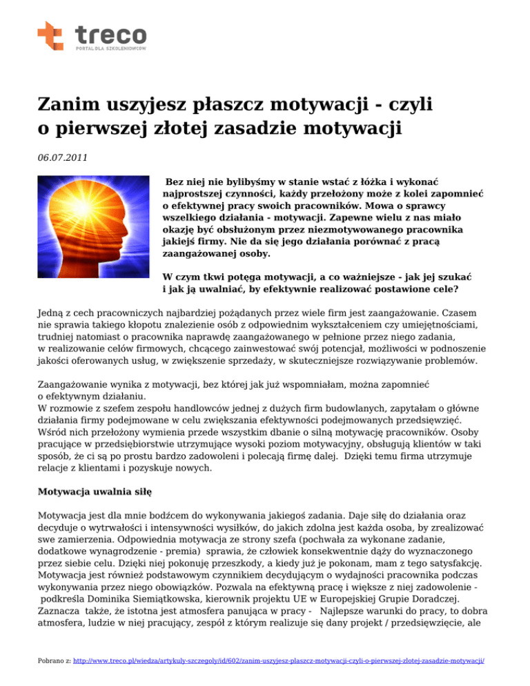 Zanim uszyjesz płaszcz motywacji - czyli o pierwszej złotej zasadzie motywacji 06.07.2011 Bez niej nie bylibyśmy w stanie wstać z łóżka i wykonać najprostszej czynności, każdy przełożony może z kolei zapomnieć o efektywnej pracy swoich pracowników. Mowa o sprawcy wszelkiego działania - motywacji. Zapewne wielu z nas miało okazję być obsłużonym przez niezmotywowanego pracownika jakiejś firmy. Nie da się jego działania porównać z pracą zaangażowanej osoby. W czym tkwi potęga motywacji, a co ważniejsze - jak jej szukać i jak ją uwalniać, by efektywnie realizować postawione cele? Jedną z cech pracowniczych najbardziej pożądanych przez wiele firm jest zaangażowanie. Czasem nie sprawia takiego kłopotu znalezienie osób z odpowiednim wykształceniem czy umiejętnościami, trudniej natomiast o pracownika naprawdę zaangażowanego w pełnione przez niego zadania, w realizowanie celów firmowych, chcącego zainwestować swój potencjał, możliwości w podnoszenie jakości oferowanych usług, w zwiększenie sprzedaży, w skuteczniejsze rozwiązywanie problemów. Zaangażowanie wynika z motywacji, bez której jak już wspomniałam, można zapomnieć o efektywnym działaniu. W rozmowie z szefem zespołu handlowców jednej z dużych firm budowlanych, zapytałam o główne działania firmy podejmowane w celu zwiększania efektywności podejmowanych przedsięwzięć. Wśród nich przełożony wymienia przede wszystkim dbanie o silną motywację pracowników. Osoby pracujące w przedsiębiorstwie utrzymujące wysoki poziom motywacyjny, obsługują klientów w taki sposób, że ci są po prostu bardzo zadowoleni i polecają firmę dalej. Dzięki temu firma utrzymuje relacje z klientami i pozyskuje nowych. Motywacja uwalnia siłę Motywacja jest dla mnie bodźcem do wykonywania jakiegoś zadania. Daje siłę do działania oraz decyduje o wytrwałości i intensywności wysiłków, do jakich zdolna jest każda osoba, by zrealizować swe zamierzenia. Odpowiednia motywacja ze strony szefa (pochwała za wykonane zadanie, dodatkowe wynagrodzenie - premia) sprawia, że człowiek konsekwentnie dąży do wyznaczonego przez siebie celu. Dzięki niej pokonuję przeszkody, a kiedy już je pokonam, mam z tego satysfakcję. Motywacja jest również podstawowym czynnikiem decydującym o wydajności pracownika podczas wykonywania przez niego obowiązków. Pozwala na efektywną pracę i większe z niej zadowolenie podkreśla Dominika Siemiątkowska, kierownik projektu UE w Europejskiej Grupie Doradczej. Zaznacza także, że istotna jest atmosfera panująca w pracy - Najlepsze warunki do pracy, to dobra atmosfera, ludzie w niej pracujący, zespół z którym realizuje się dany projekt / przedsięwzięcie, ale Pobrano z: http://www.treco.pl/wiedza/artykuly-szczegoly/id/602/zanim-uszyjesz-plaszcz-motywacji-czyli-o-pierwszej-zlotej-zasadzie-motywacji/ także warunki socjalne: czystość w miejscu pracy, dostęp do sanitariatów, kawy herbaty, itp. Ewa Brzezińska, kierownik działu sprzedaży w Europejskiej Grupie Doradczej podkreśla, że: Motywowanie do pracy, to jedna z najważniejszych, a jednocześnie najtrudniejszych funkcji zarządzania. Jest bardzo ważna przy dobrym rządzeniu w przedsiębiorstwie. Odpowiednie podejście do pracownika i sposób wywierania na niego wpływu odgrywają tutaj największą rolę. Osoba motywująca powinna być sama zmotywowana do pracy. Dobrze będzie motywował lider pełen realnego optymizmu, z pozytywnym nastawieniem, który „zarazi” swoim entuzjazmem pozostałych pracowników. Poza tym, kiedy już robimy to, co lubimy lub lubimy to, co robimy i robimy to dobrze, to na pewno jest miło, gdy otrzymujemy za to dobre wynagrodzenie. Nie ulega wątpliwości, że motywacja ma ogromne znaczenie. Jeśli już wiemy, że motywować należy i siebie i ludzi, za których odpowiadamy, rodzi się pytanie - jak motywować? Skrojona na miarę O motywacji i zasadach istotnych w jej uruchamianiu można pisać tomy, na początku jednak należy pamiętać, że motywacja musi być dopasowana do człowieka niczym ubranie. Kiedy idziemy ulicą, nie dziwi nas, że po drodze mijać będziemy blondyna, brunetkę, osobę z niebieskimi oczami, z jasną lub ciemną karnacją. Nie obrażamy się na to, że ludzie wyglądają inaczej niż my. Jest to dla nas zupełnie normalne. Jesteśmy przecież różni. Jak to się jednak dzieje, że bulwersuje nas, gdy ktoś zachowuje się inaczej niż my, myśli w odmienny sposób, ma inne podejście do pewnych zagadnień, w inny sposób wyraża siebie? Dlaczego akceptując to, że jesteśmy różni fizycznie, nie tolerujemy niekiedy różnic związanych z naszą psychiką i próbujemy wszystkich „mierzyć swoją miarą”? Tymczasem zróżnicowanie i dopasowanie narzędzi motywacyjnych pod kątem danej osoby, to jedna z ważniejszych zasad motywowania siebie i ludzi. Właściwy kod do sejfu Tak jak z powodu różnic w naszym kodzie genetycznym, różnimy się w wyglądzie, tak samo różnimy się pod kątem czynników motywujących nas do działania czyli prościej mówiąc – nie wszystkich ludzi można zmotywować tym samym. To co motywuje jedną osobę, może działać demotywująco na drugą. Dobranie właściwych narzędzi służących do motywowania ludzi jest jak znalezienie właściwego kodu do sejfu. Bez niego nie da się sprawić, by człowiek zaangażował swój cały potencjał w realizację celów firmy. Wyobraźmy sobie siebie w swoim ulubionym ubraniu, w nim czujemy się najlepiej A teraz zastanówmy się, jak czułby się nasz znajomy, sąsiad, osoba mijana na ulicy, gdybyśmy ubrali ją właśnie w ten strój? Nie trzeba długo myśleć, by dojść do wniosku, że nie najlepiej, że istnieje duże prawdopodobieństwo, że strój ten nie pasowałby do danej osoby. I to też jest dla nas dość oczywiste. Dlaczego więc próbujemy zakładać swoje „płaszcze motywacyjne” na innych i dziwimy się, że nie są w n