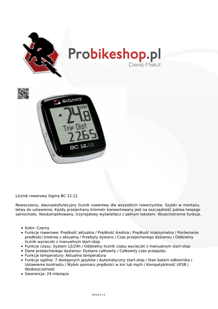 Licznik rowerowy Sigma BC 12.12 Nowoczesny, dwunastofunkcyjny licznik rowerowy dla wszystkich rowerzystów. Szybki w montażu, łatwy do ustawienia. Każdy przejechany kilometr konwertowany jest na oszczędność paliwa twojego samochodu. Nieskomplikowany, trzyrzędowy wyświetlacz z pełnym tekstem. Wszechstronne funkcje. Kolor: Czarny Funkcje rowerowe: Prędkość aktualna / Prędkość średnia / Prędkość maksymalna / Porównanie prędkości średniej z aktualną / Przebyty dystans / Czas przejechanego dystansu / Oddzielny licznik wycieczki z manualnym start-stop. Funkcje czasu: System 12/24h / Oddzielny licznik czasu wycieczki z manualnym start-stop Dane przejechanego dystansu: Dystans całkowity / Całkowity czas przejazdu Funkcje temperatury: Aktualna temperatura Funkcje ogólne: 7 dostępnych języków / Automatyczny start-stop / Stan baterii odbiornika / Ustawienie kontrastu / Wybór pomiaru prędkości w km lub mp/h / Kompatybilność UFSB / Wodoszczelność Gwarancja: 24 miesiące Strona 1 z 2 Strona 2 z 2