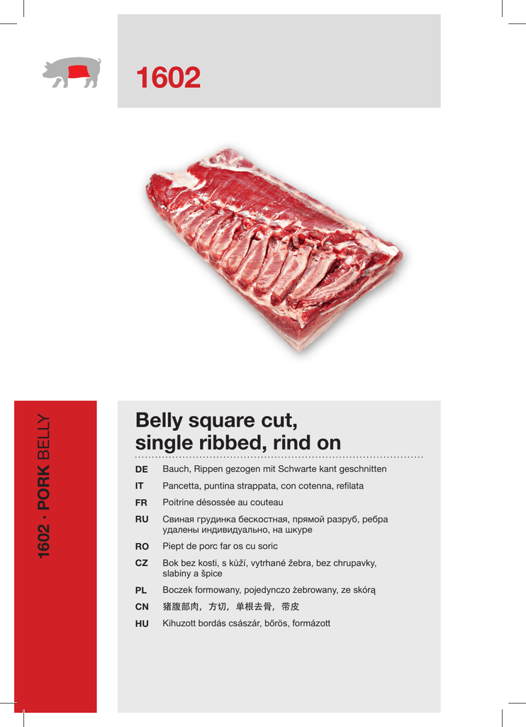 1602 · PORK BELLY 1602 Belly square cut, single ribbed, rind on DE Bauch, Rippen gezogen mit Schwarte kant geschnitten IT Pancetta, puntina strappata, con cotenna, refilata FR Poitrine désossée au couteau RU Свиная грудинка бескостная, прямой разруб, ребра удалены индивидуально, на шкуре RO Piept de porc far os cu soric CZ Bok bez kosti, s kůží, vytrhané žebra, bez chrupavky, slabiny a špice PL Boczek formowany, pojedynczo żebrowany, ze skórą CN 猪腹部肉,方切,单根去骨,带皮 HU Kihuzott bordás császár, bőrös, formázott