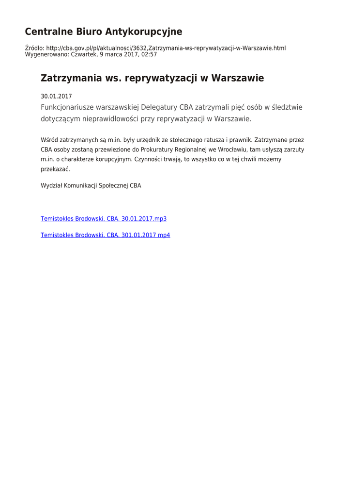 Centralne Biuro Antykorupcyjne Źródło: http://cba.gov.pl/pl/aktualnosci/3632,Zatrzymania-ws-reprywatyzacji-w-Warszawie.html Wygenerowano: Czwartek, 9 marca 2017, 02:57 Zatrzymania ws. reprywatyzacji w Warszawie 30.01.2017 Funkcjonariusze warszawskiej Delegatury CBA zatrzymali pięć osób w śledztwie dotyczącym nieprawidłowości przy reprywatyzacji w Warszawie. Wśród zatrzymanych są m.in. były urzędnik ze stołecznego ratusza i prawnik. Zatrzymane przez CBA osoby zostaną przewiezione do Prokuratury Regionalnej we Wrocławiu, tam usłyszą zarzuty m.in. o charakterze korupcyjnym. Czynności trwają, to wszystko co w tej chwili możemy przekazać. Wydział Komunikacji Społecznej CBA Temistokles Brodowski. CBA. 30.01.2017.mp3 Temistokles Brodowski. CBA. 301.01.2017 mp4