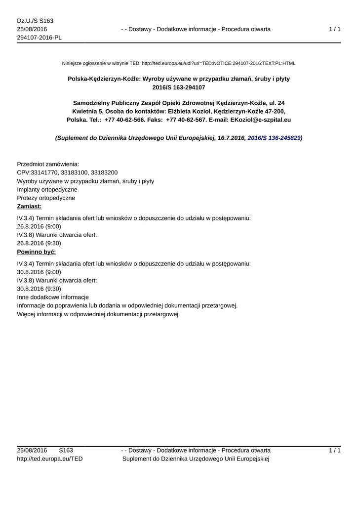 Dz.U./S S163 25/08/2016 294107-2016-PL - - Dostawy - Dodatkowe informacje - Procedura otwarta 1/1 Niniejsze ogłoszenie w witrynie TED: http://ted.europa.eu/udl?uri=TED:NOTICE:294107-2016:TEXT:PL:HTML Polska-Kędzierzyn-Koźle: Wyroby używane w przypadku złamań, śruby i płyty 2016/S 163-294107 Samodzielny Publiczny Zespół Opieki Zdrowotnej Kędzierzyn-Koźle, ul. 24 Kwietnia 5, Osoba do kontaktów: Elżbieta Kozioł, Kędzierzyn-Koźle 47-200, Polska. Tel.: +77 40-62-566. Faks: +77 40-62-567. E-mail: [email protected] (Suplement do Dziennika Urzędowego Unii Europejskiej, 16.7.2016, 2016/S 136-245829) Przedmiot zamówienia: CPV:33141770, 33183100, 33183200 Wyroby używane w przypadku złamań, śruby i płyty Implanty ortopedyczne Protezy ortopedyczne Zamiast: IV.3.4) Termin składania ofert lub wniosków o dopuszczenie do udziału w postępowaniu: 26.8.2016 (9:00) IV.3.8) Warunki otwarcia ofert: 26.8.2016 (9:30) Powinno być: IV.3.4) Termin składania ofert lub wniosków o dopuszczenie do udziału w postępowaniu: 30.8.2016 (9:00) IV.3.8) Warunki otwarcia ofert: 30.8.2016 (9:30) Inne dodatkowe informacje Informacje do poprawienia lub dodania w odpowiedniej dokumentacji przetargowej. Więcej informacji w odpowiedniej dokumentacji przetargowej. 25/08/2016 S163 http://ted.europa.eu/TED - - Dostawy - Dodatkowe informacje - Procedura otwarta Suplement do Dziennika Urzędowego Unii Europejskiej 1/1