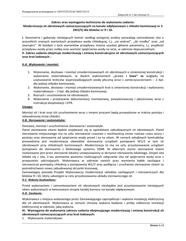 Postępowanie przetargowe nr GEK/FZR-ELB/16857/2014 Załącznik nr 1 do Umowy nr ………………… Zakres oraz wymagania techniczne do wykonania zadania: Modernizacja sit obrotowych samoczyszczących na kanale odpływowym z chłodni kominowej nr 5 (W2/5) dla bloków nr 9 i 10. I. Geometria i gabaryty istniejących komór według wstępnej analizy pozwalają zainstalować sita o wszystkich znanych wariantach przepływu wody chłodzącej, t.j. „na wskroś”, „do środka” oraz „od zewnątrz”. W każdym z tych wariantów przepływu można uzyskać główne parametry, t.j. prędkość przepływu wody przez siatkę oraz wartość spiętrzenia wody na sicie, w zakresie dopuszczalnym. II. Zakres zadania obejmuje modernizację i zmianę konstrukcyjna sit obrotowych samoczyszczących oraz krat lodowych : II.A. Wykonanie i montaż: 1. Wykonanie, dostawa i montaż zmodernizowanych sit obrotowych o zmienionej konstrukcji i wykonaniu materiałowym, w dwóch wykonaniach „prawe i lewe” ze względu na usytuowanie króćców wyprowadzających wodę płuczną wraz z zanieczyszczeniami – 2 kpl. dla jednej chłodni kominowej. 2. Wykonanie, dostawa i montaż zmodernizowanych krat o zmienionej konstrukcji i wykonaniu materiałowym – 2 kpl. dla jednej chłodni kominowej. 3. Rozruch i uruchomienie sit obrotowych. 4. Wykonanie i przekazanie dokumentacji montażowej, powykonawczej i jakościowej wraz z instrukcja eksploatacji i DTR. Uwaga: Montaż sit i krat oraz ich uruchomienie wraz z innymi pracami będą prowadzone w trakcie postoju i odwodnionej misie chłodni. II.B. Sterowanie i automatyka: Dostawa, montaż i uruchomienie sterowania i automatyki. Panel sterowania sitami będzie znajdować się w sąsiedztwie zabudowanych sit obrotowych. Panel sterowania miejscowego ma na celu sterowanie czasowe z możliwością zmian nastaw czasu pracy i postoju oraz sterowanie od spiętrzenia wody przed i za na sitem. W ramach odrębnych kontraktów prowadzona jest modernizacja obwodów sterowania urządzeń pompowni W1/2 w tym sit obrotowych przy chłodniach kominowych. Modernizacja ta ma na celu przystosowanie urządzeń pompowni do sterowania z blokowego systemu SSNB. W obecnym stanie sterowanie sitami realizowane jest przez sterownik lokalny umiejscowiony w skrzynce sterowania lokalnego. Zespól sita składa się z sita, 2-wu pomiarów poziomu realizujących załączanie sita od spiętrzenia wody oraz z przepustnic odcinających. Wykonawca w zakresie swoich prac wymienia kable zasilające i sterownicze pomiędzy chłodnią a pompownią W1/2 oraz podłącza i uruchamia sterowanie sitami za pośrednictwem nowo zabudowanej skrzynki krosowej. Zamawiający posiada Projekt Wykonawczy modernizacji układów zasilających i sterowniczych dla bloków 9 i 10, który udostępni w celu przystosowania układu sterowniczego sit. II.C. Roboty budowlane: Przed wykonaniem i zamontowaniem sit obrotowych niezbędne jest przystosowanie istniejących okien wykonanych w betonowym stropie każdej komory na kanale odpływowym. II.D. Zasilanie: Wykonawca z miejsca wskazanego przez Zamawiającego zaprojektuje i wykona instalację elektryczną dla sit obrotowych. Wykonawca w ramach Umowy wykona badania i próby odbiorcze instalacji elektrycznej w zakresie, jaką wykona. III. Wymagania do wykonania zakresu zadania obejmującego modernizację i zmianę konstrukcji sit obrotowych samoczyszczących oraz krat lodowych: 1. Wykonanie materiałowe: Strona 1 z 3 Postępowanie przetargowe nr GEK/FZR-ELB/16857/2014 Załącznik nr 1 do Umowy nr ………………… a. Elementy sit i krat mające kontakt z wodą chłodzącą oraz obudowa sit mają być wykonane ze stali kwasoodpornej w gatunku 316L lub równoważnym. b. Elementy filtrujące wykonane ze stali kwasoodpornej w gatunku 316L lub równoważnym. c. Pozostałe elementy również wykonane ze stali kwasoodpornej w gatunku 316L lub równoważnym oraz z tworzyw sztucznych. 2. Wielkość zabudowy dopasowana do komory i kanału odpływowego. 3. Sita i kraty lodowe mają być takiej konstrukcji by ich montaż polegał na ich wprowadzeniu do istniejących prowadnic. 4. Sita filtracyjne o oczku max. 8,0x8,0mm oraz drutu fi -1,0mm. 5. Konstrukcja dopasowana do aktualnie istniejącego fundamentowania. 6. Uszczelnienia zespołu filtrującego sit w prowadnicach naściennych powinny być wykonane z materiału elastycznego, samoczynnie doszczelniających się na skutek posiadanych cech sprężystości i na skutek naporu wody powstającego w wyniku spiętrzenia wody przed i za sitem. 7. Nie dopuszcza się uszczelnień zespołu filtrującego sita w prowadnicach naściennych, zużywających się w trakcie eksploatacji, których zużywanie się (wycieranie) skutkuje ciągłym powiększaniem się nieszczelności i możliwością przepływu coraz większych zanieczyszczeń ze strony „brudnej” na stronę „czystą”. 8. Nie dopuszcza się zespołu filtrującego sita i systemu uszczelnień w prowadnicach naściennych, w których wymiana elementów zużywających się wymaga odstawienia układu wody chłodzącej lub odwodnienia misy chłodni. 9. Nie dopuszcza się przepływu zanieczyszczeń przez sito i jego uszczelnienia. 10. Konstrukcja zespołu filtracyjnego sit i zespołu prowadnic znajdujących się pod wodą powinna zapewnić pewność ruchową sita obrotowego przy spiętrzeniu wody przed i za sitem . 11. Sita mają mieć układ wody spłukującej zanieczyszczenia z siatki filtracyjnej oraz kolektor przystosowany do wyczyszczenia. 12. Woda płuczna może być kierowana przed sita po uprzednim odseparowaniu zanieczyszczeń. 13. Armatura z napędem elektrycznym. 14. Sito wykonane z możliwością ręcznego obrotu zespołu filtrującego. 15. Wystarczającym zabezpieczeniem sita obrotowego przed zanieczyszczeniami o dużych gabarytach (w szczególności sople lodowe w okresie zimy) ma być krata rzadka o prześwicie ok. 100-120 mm. Kraty lodowe powinny być zamontowane w miejscu istniejących
