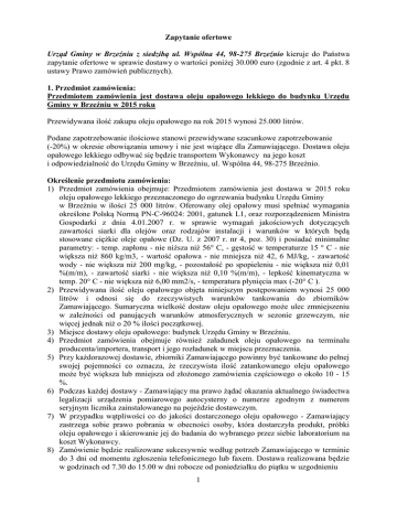 Zapytanie ofertowe Urząd Gminy w Brzeźniu z siedzibą ul. Wspólna 44, 98-275 Brzeźnio kieruje do Państwa zapytanie ofertowe w sprawie dostawy o wartości poniżej 30.000 euro (zgodnie z art. 4 pkt. 8 ustawy Prawo zamówień publicznych). 1. Przedmiot zamówienia: Przedmiotem zamówienia jest dostawa oleju opałowego lekkiego do budynku Urzędu Gminy w Brzeźniu w 2015 roku Przewidywana ilość zakupu oleju opałowego na rok 2015 wynosi 25.000 litrów. Podane zapotrzebowanie ilościowe stanowi przewidywane szacunkowe zapotrzebowanie (-20%) w okresie obowiązania umowy i nie jest wiążące dla Zamawiającego. Dostawa oleju opałowego lekkiego odbywać się będzie transportem Wykonawcy na jego koszt i odpowiedzialność do Urzędu Gminy w Brzeźniu, ul. Wspólna 44, 98-275 Brzeźnio. Określenie przedmiotu zamówienia: 1) Przedmiot zamówienia obejmuje: Przedmiotem zamówienia jest dostawa w 2015 roku oleju opałowego lekkiego przeznaczonego do ogrzewania budynku Urzędu Gminy w Brzeźniu w ilości 25 000 litrów. Oferowany olej opałowy musi spełniać wymagania określone Polską Normą PN-C-96024: 2001, gatunek L1, oraz rozporządzeniem Ministra Gospodarki z dnia 4.01.2007 r. w sprawie wymagań jakościowych dotyczących zawartości siarki dla olejów oraz rodzajów instalacji i warunków w których będą stosowane ciężkie oleje opałowe (Dz. U. z 2007 r. nr 4, poz. 30) i posiadać minimalne parametry: - temp. zapłonu - nie niższa niż 56° C, - gęstość w temperaturze 15 ° C - nie większa niż 860 kg/m3, - wartość opałowa - nie mniejsza niż 42, 6 MJ/kg, - zawartość wody - nie większa niż 200 mg/kg, - pozostałość po spopieleniu - nie większa niż 0,01 %(m/m), - zawartość siarki - nie większa niż 0,10 %(m/m), - lepkość kinematyczna w temp. 20° C - nie większa niż 6,00 mm2/s, - temperatura płynięcia max (-20° C ). 2) Przewidywana ilość oleju opałowego objęta niniejszym postępowaniem wynosi 25 000 litrów i odnosi się do rzeczywistych warunków tankowania do zbiorników Zamawiającego. Sumaryczna wielkość dostaw oleju opałowego może ulec zmniejszeniu w zależności od panujących warunków atmosferycznych w sezonie grzewczym, nie więcej jednak niż o 20 % ilości początkowej. 3) Miejsce dostawy oleju opałowego: budynek Urzędu Gminy w Brzeźniu. 4) Przedmiot zamówienia obejmuje również załadunek oleju opałowego na terminalu producenta/importera, transport i jego rozładunek w miejscu przeznaczenia. 5) Przy każdorazowej dostawie, zbiorniki Zamawiającego powinny być tankowane do pełnej swojej pojemności co oznacza, że rzeczywista ilość zatankowanego oleju opałowego może być większa lub mniejsza od złożonego zamówienia częściowego o około 10 - 15 %. 6) Podczas każdej dostawy - Zamawiający ma prawo żądać okazania aktualnego świadectwa legalizacji urządzenia pomiarowego autocysterny o numerze zgodnym z numerem seryjnym licznika zainstalowanego na pojeździe dostawczym. 7) W przypadku wątpliwości co do jakości dostarczonego oleju opałowego - Zamawiający zastrzega sobie prawo pobrania w obecności osoby, która dostarczyła produkt, próbki oleju opałowego i skierowanie jej do badania do wybranego przez siebie laboratorium na koszt Wykonawcy. 8) Zamówienie będzie realizowane sukcesywnie według potrzeb Zamawiającego w terminie do 3 dni od momentu zgłoszenia telefonicznego lub faxem. Dostawa realizowana będzie w godzinach od 7.30 do 15.00 w dni robocze od poniedziałku do piątku w uzgodnieniu 1 z pracownikiem Zamawiającego. 2. Rodzaj zamówienia: dostawa oleju opałowego lekkiego. 1. Miejsce dostawy: Urząd Gminy w Brzeźniu, ul. Wspólna 44, 98-275 Brzeźnio. 2. Termin realizacji dostawy: luty 2015 r. – Grudzień 2015 r. Dostawy na zgłoszenie telefoniczne (w ciągu 3 dni od dnia zgłoszenia) wg potrzeb zamawiającego. 3. Warunki płatności Przelew na rachunek bankowy Wykonawcy wskazany w fakturze w terminie do 14 dni od daty otrzymania prawidłowo wystawionej faktury. 4. Kryteria oceny ofert Przy wyborze najkorzystniejszej oferty Zamawiający będzie się kierował kryterium: Cena 100% Zamawiający obliczy cenę w następujący sposób: Do wyliczenia ceny Zamawiający przyjmie cenę wyjściową producenta na poziomie 2,50 zł (Cwp) Zamawiający do obliczenia ceny jednostkowej oferty (Cjo) zastosuje następujący wzór: w przypadku marży Cjo = Cwp + (Cwp x marża w %) w przypadku upustu Cjo = Cwp – (Cwp x upust w %) Następnie Zamawiający obliczy cenę netto ogółem wg wzoru: Co = Cjo x 25 000 l Co – cena netto ogółem Cjo – cena jednostkowa oferty Zamawiający wybierze ofertę Wykonawcy, który zaoferuje najkorzystniejszą cenę netto ogółem wyliczoną wg w/w wzoru. 5. Informacje dodatkowe: 1) Wykonawca w formularzu ofertowym określi marżę lub upust od ceny wyjściowej producenta publikowanej na jego stronie internetowej. 2) Cena podana przez Wykonawcę może ulec zmianie w trakcie trwania umowy tylko na skutek niezależnych od Wykonawcy zmian w składnikach: a) zmiany ceny oleju opałowego u producenta, b) zmiany przepisów. 3) Pozostałe składniki ceny są niezmienne. Wszelkie propozycje zmian należy udokumentować i uzgodnić z Zamawiającym. 4) Wykonawca składający ofertę zobowiązany jest wyodrębnić: - upust stosowany przez Wykonawcę w stosunku do Zamawiającego od ceny wyjściowej producenta (rozumianej jako cena ogłaszana przez producenta na dany dzień na stronie internetowej) – stała wartość (niezmienna przez okres obowiązywania umowy), lub 2 - marżę stosowaną przez Wykonawcę w stosunku do Zamawiającego od ceny wyjściowej producenta (rozumianej jako cena ogłaszana przez producenta na dany dzień na stronie internetowej) – stała wartość (niezmienna przez okres obowiązywania umowy), marża wykonawcy nie może mieć wartości ujemnej ani zerowej zgodnie z ustawą z dnia 05.07.2001 r. o cenach (Dz. U. z 2001 r. Nr 97 poz. 1050 z późn. zm.). 5) Zamawi