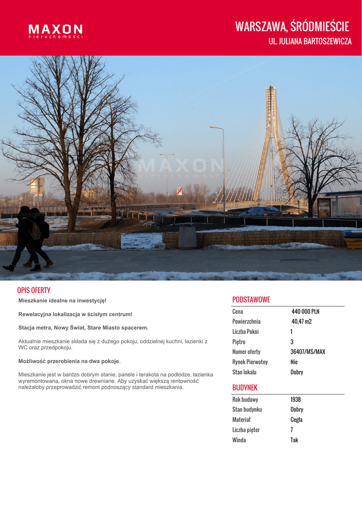 WARSZAWA, ŚRÓDMIEŚCIE UL. JULIANA BARTOSZEWICZA OPIS OFERTY Mieszkanie idealne na inwestycję! PODSTAWOWE Rewelacyjna lokalizacja w ścisłym centrum! Cena 440 000 PLN Powierzchnia 40,47 m2 Liczba Pokoi 1 Aktualnie mieszkanie składa się z dużego pokoju, oddzielnej kuchni, łazienki z WC oraz przedpokoju. Piętro 3 Numer oferty 36407/MS/MAX Możliwość przerobienia na dwa pokoje. Rynek Pierwotny Nie Stan lokalu Dobry Stacja metra, Nowy Świat, Stare Miasto spacerem. Mieszkanie jest w bardzo dobrym stanie, panele i terakota na podłodze, łazienka wyremontowana, okna nowe drewniane. Aby uzyskać większą rentowność należałoby przeprowadzić remont podnoszący standard mieszkania. BUDYNEK Rok budowy 1938 Stan budynku Dobry Materiał Cegła Liczba pięter 7 Winda Tak WARSZAWA, ŚRÓDMIEŚCIE UL. JULIANA BARTOSZEWICZA DODATKOWE INFORMACJE POMIESZCZENIA Budynek w bardzo dobrym stanie. Typ mieszkania Rozkładowe Powierzchnia salonu 20 m2 Typ kuchni Oddzielna Liczba łazienek 1 Wysokość pomieszczeń 280 cm Budynek położony na skarpie. Typ okien Drewniane (nowy typ) Idealny punkt komunikacyjny, stacja metra kilka minut spacerem. POWIERZCHNIA DODATKOWA Ładne klatki schodowe wyłożone marmurowymi płytami, nowa widna firmy Schindler, wymienione piony wodne i kanalizacyjne. Budynek przedwojenny z cegły! Nowy Świat i Stare Miasto w zasięgu ręki. Stadion narodowy oraz liczne Parki Powiśla w niedalekiej odległości. W pobliżu Uniwersytet Warszawski i Uniwersytet Muzyczny. Mieszkanie idealne pod wynajem zarówno długoterminowy jak i krótkoterminowy zamiast pokoju hotelowego, co znacznie podwyższa rentowność z tej inwestycji!!! Przyjdź i zobacz bo warto! Typ balkonów Brak Piwnica Nie Komórka Nie Ogród Nie MEDIA I WYPOSAŻENIE Ogrzewanie CO miejskie Ciepła woda Wodociąg miejski Gaz Tak Tomasz Kujawa Tomasz Kujawa tel. 525 230 030 [email protected] Niniejsze warunki mają charakter wyłącznie informacyjny i nie stanowią oferty w rozumieniu Kodeksu Cywilnego. MAXON Nieruchomości Sp. z o o. ul. Powązkowska 44C, 01-797 Warszawa Tel: (22) 530 60 00 e-mail: [email protected] www.maxon.pl