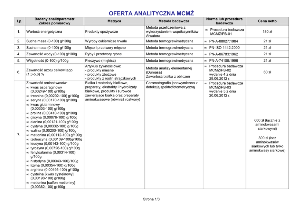 OFERTA ANALITYCZNA MCMś Lp. Badany analit/parametr Zakres pomiarowy Matryca Metoda badawcza Norma lub procedura badawcza Cena netto 1. Wartość energetyczna Produkty spoŜywcze Metoda przeliczeniowa z wykorzystaniem współczynników Atwatera • Procedura badawcza MCMś/PB-01 180 zł 2. Sucha masa (0-100) g/100g Wyroby cukiernicze trwałe Metoda termograwimetryczna • PN-A-88027:1984 21 zł 3. Sucha masa (0-100) g/100g Mięso i przetwory mięsne Metoda termograwimetryczna • PN-ISO 1442:2000 21 zł 4. Zawartość wody (0-100) g/100g Ryby i przetwory rybne Metoda termograwimetryczna • PN-A-86783:1962 21 zł 5. Wilgotność (0-100) g/100g Pieczywo (miękisz) Metoda termograwimetryczna • PN-A-74108:1996 21 zł 6. Zawartość azotu całkowitego (1,3-5,6) % 7. Zawartość aminokwasów: • kwas asparaginowy (0,00249-100) g/100g • treonina (0,00202-100) g/100g • seryna (0,00170-100) g/100g • kwas glutaminowy (0,00303-100) g/100g • prolina (0,00410-100) g/100g • glicyna (0,00076-100) g/100g • alanina (0,00121-100) g/100g • cystyna (0,00332-100) g/100g • walina (0,00200-100) g/100g • metionina (0,00112-100) g/100g • izoleucyna (0,00109-100)g/100g • leucyna (0,00143-100) g/100g • tyrozyna (0,00726-100) g/100g • fenyloalanina (0,00314-100) g/100g • histydyna (0,00343-100)/100g • lizyna (0,00354-100) g/100g • arginina (0,00495-100) g/100g • cysteina [kwas cysteinowy] (0,00198-100) g/100g • metionina [sulfon metioniny] (0,00362-100) g/100g Artykuły Ŝywnościowe: - produkty mięsne - produkty zboŜowe - produkty z roślin strączkowych Białka i materiały białkowe, preparaty, ekstrakty i hydrolizaty białkowe, produkty i surowce zawierające białka oraz preparaty aminokwasowe (równieŜ roztwory) Metoda analizy elementarnej (Dumasa) Zawartość białka z obliczeń Chromatografia jonowymienna z detekcją spektrofotometryczną • Procedura badawcza MCMś/PB-02 wydanie 4 z dnia 29.06.2012 r. • Procedura badawcza MCMś/PB-03 wydanie 5 z dnia 20.06.2012 r. 60 zł 600 zł (łącznie z aminokwasami siarkowymi) 300 zł (bez aminokwasów siarkowych lub tylko aminokwasy siarkowe) Strona 1/3 Lp. Badany analit/parametr Zakres pomiarowy Matryca Metoda badawcza Norma lub procedura badawcza Cena netto 8. Ekstrakcja tłuszczu Mięso i produkty mięsne, drób, ryby, Ekstrakcja CO2 w stanie wyroby cukiernicze, jaja, masło, nadkrytycznym produkty zboŜowe • Procedura badawcza MCMś/PB-04 30 zł 9. Zawartość tłuszczu ogólnego Produkty mięsne • Procedura badawcza MCMś/PB-05 90 zł • Metoda AACC 32-05 (AOAC 985.29) • Metoda AACC 32-07 (AOAC 991.43) 108 zł • PN-ISO 936:2000 36 zł • PN-A-88022:1959 • PN-A-82112:1973 z Az1:2002 • Procedura badawcza MCMś/PB-06 wydanie 3 z 06.02.2012 r. 36 zł 10. Zawartość błonnika 11. Popiół całkowity (0-100) g/100g 12. Popiół całkowity (0-100)g/100g Zawartość soli kuchennej (0,02-7) % 13. Ekstrakcja w aparacie Soxhleta Produkty roślinne (takie jak warzywa, owoce, zboŜa) Metoda enzymatyczno-wagowa Produkty spoŜywcze zawierajace dodatek surowców pochodzenia roślinnego Mięso i przetwory mięsne (wszystkie Metoda termograwimetryczna rodzaje i przetwory), drób Wyroby cukiernicze Metoda termograwimetryczna Mięso i przetwory mięsne Metoda miareczkowa Mohra 14. Zawartość fosforu całkowitego (54-2500 mg/100g) Mięso i przetwory mięsne, zboŜa i produkty zboŜowe, rośliny strączkowe, sery Spektrofotometria UV-Vis 15. Zawartość: • sodu • magnezu • wapnia Artykuły Ŝywnościowe Atomowa spektrometria absorpcyjna z atomizacją w płomieniu 16. Zawartość potasu Artykuły Ŝywnościowe Atomowa spektrometria absorpcyjna z atomizacją w płomieniu 17. Zawartość manganu Artykuły Ŝywnościowe Atomowa spektrometria absorpcyjna z atomizacją w płomieniu 18. 19. 20. Zawartość: • cynku • Ŝelaza Zawartość: • miedzi (0,60-6,00) mg/kg • kadmu (0,038-0,260) mg/kg Zawartość: • białka (0,-5,20) % • tłuszczu (0,30-7,80)% • laktozy (0,1-6,00)% Artykuły Ŝywnościowe Artykuły Ŝywnościowe pochodzenia roślinnego Mleko pełne lub częściowo odtłuszczone • PN-EN 15505:2009 • Procedura badawcza MCMś/PB-07 wydanie 2 z dnia 06.02.2012 r. • Procedura badawcza MCMś/PB-08 wydanie 2 z dnia 06.02.2012 r. Atomowa spektrometria absorpcyjna z atomizacją w • PN-EN 14084:2004 płomieniu Metoda absorpcyjnej spektrometrii atomowej z atomizacją • PN-EN 14084:2004 elektrotermiczną (ETAAS) Metoda spektrometrii w podczerwieni (FTIR) Strona 2/3 • PN-ISO 9622:2006 45 zł 85 zł 42 zł (sód) 48 zł (magnez) 48 zł (wapń) 42 zł 40 zł 40 zł za kaŜdy składnik 70 zł za kaŜdy składnik 60 zł Lp. 21. 22. Badany analit/parametr Zakres pomiarowy Zawartość: • suchej masy • suchej masy beztłuszczowej • kwasu cytrynowego • mocznika • wolnych kwasów tłuszczowych Gęstość Kwasowość Zawartość: • białka • tłuszczu • laktozy • suchej masy • kwasu cytrynowego • mocznika Kwasowość Matryca Norma lub procedura badawcza Metoda badawcza • Mleko pełne Metoda spektrometrii w podczerwieni (FTIR) Mleko w proszku Metoda spektrometrii w podczerwieni (FTIR) • Strona 3/3 Cena netto Procedura badawcza MCMś/PB-09 wydanie 2 z dnia 06.02.2012 r. 60 zł Procedura badawcza MCMś/PB-10 wydanie 2 z dnia 06.02.2012 r. 60 zł