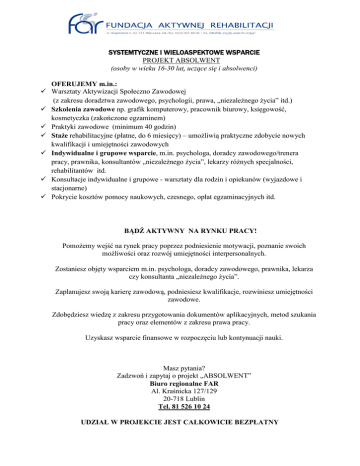 SYSTEMTYCZNE I WIELOASPEKTOWE WSPARCIE PROJEKT ABSOLWENT (osoby w wieku 16-30 lat, uczące się i absolwenci) OFERUJEMY m.in.: Warsztaty Aktywizacji Społeczno Zawodowej (z zakresu doradztwa zawodowego, psychologii, prawa, „niezależnego życia” itd.) Szkolenia zawodowe np. grafik komputerowy, pracownik biurowy, księgowość, kosmetyczka (zakończone egzaminem) Praktyki zawodowe (minimum 40 godzin) Staże rehabilitacyjne (płatne, do 6 miesięcy) – umożliwią praktyczne zdobycie nowych kwalifikacji i umiejętności zawodowych Indywidualne i grupowe wsparcie, m.in. psychologa, doradcy zawodowego/trenera pracy, prawnika, konsultantów „niezależnego życia”, lekarzy różnych specjalności, rehabilitantów itd. Konsultacje indywidualne i grupowe - warsztaty dla rodzin i opiekunów (wyjazdowe i stacjonarne) Pokrycie kosztów pomocy naukowych, czesnego, opłat egzaminacyjnych itd. BĄDŹ AKTYWNY NA RYNKU PRACY! Pomożemy wejść na rynek pracy poprzez podniesienie motywacji, poznanie swoich możliwości oraz rozwój umiejętności interpersonalnych. Zostaniesz objęty wsparciem m.in. psychologa, doradcy zawodowego, prawnika, lekarza czy konsultanta „niezależnego życia”. Zaplanujesz swoją karierę zawodową, podniesiesz kwalifikacje, rozwiniesz umiejętności zawodowe. Zdobędziesz wiedzę z zakresu przygotowania dokumentów aplikacyjnych, metod szukania pracy oraz elementów z zakresu prawa pracy. Uzyskasz wsparcie finansowe w rozpoczęciu lub kontynuacji nauki. Masz pytania? Zadzwoń i zapytaj o projekt „ABSOLWENT” Biuro regionalne FAR Al. Kraśnicka 127/129 20-718 Lublin Tel. 81 526 10 24 UDZIAŁ W PROJEKCIE JEST CAŁKOWICIE BEZPŁATNY