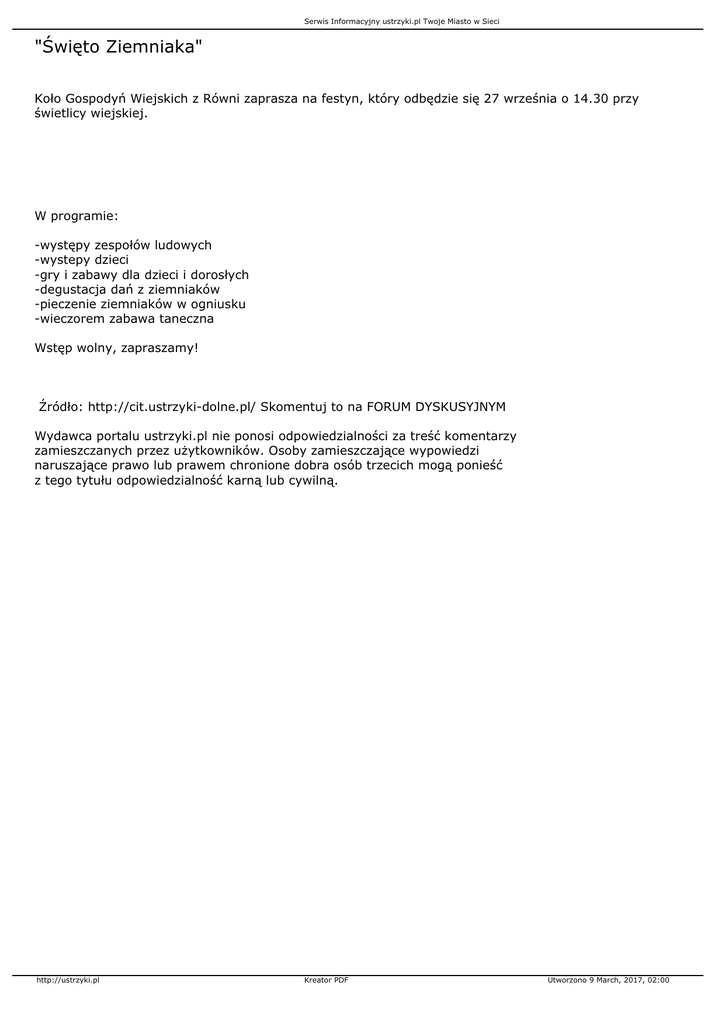 Serwis Informacyjny ustrzyki.pl Twoje Miasto w Sieci "Święto Ziemniaka" Koło Gospodyń Wiejskich z Równi zaprasza na festyn, który odbędzie się 27 września o 14.30 przy świetlicy wiejskiej. W programie: -występy zespołów ludowych -wystepy dzieci -gry i zabawy dla dzieci i dorosłych -degustacja dań z ziemniaków -pieczenie ziemniaków w ogniusku -wieczorem zabawa taneczna Wstęp wolny, zapraszamy! Źródło: http://cit.ustrzyki-dolne.pl/ Skomentuj to na FORUM DYSKUSYJNYM Wydawca portalu ustrzyki.pl nie ponosi odpowiedzialności za treść komentarzy zamieszczanych przez użytkowników. Osoby zamieszczające wypowiedzi naruszające prawo lub prawem chronione dobra osób trzecich mogą ponieść z tego tytułu odpowiedzialność karną lub cywilną. http://ustrzyki.pl Kreator PDF Utworzono 9 March, 2017, 02:00