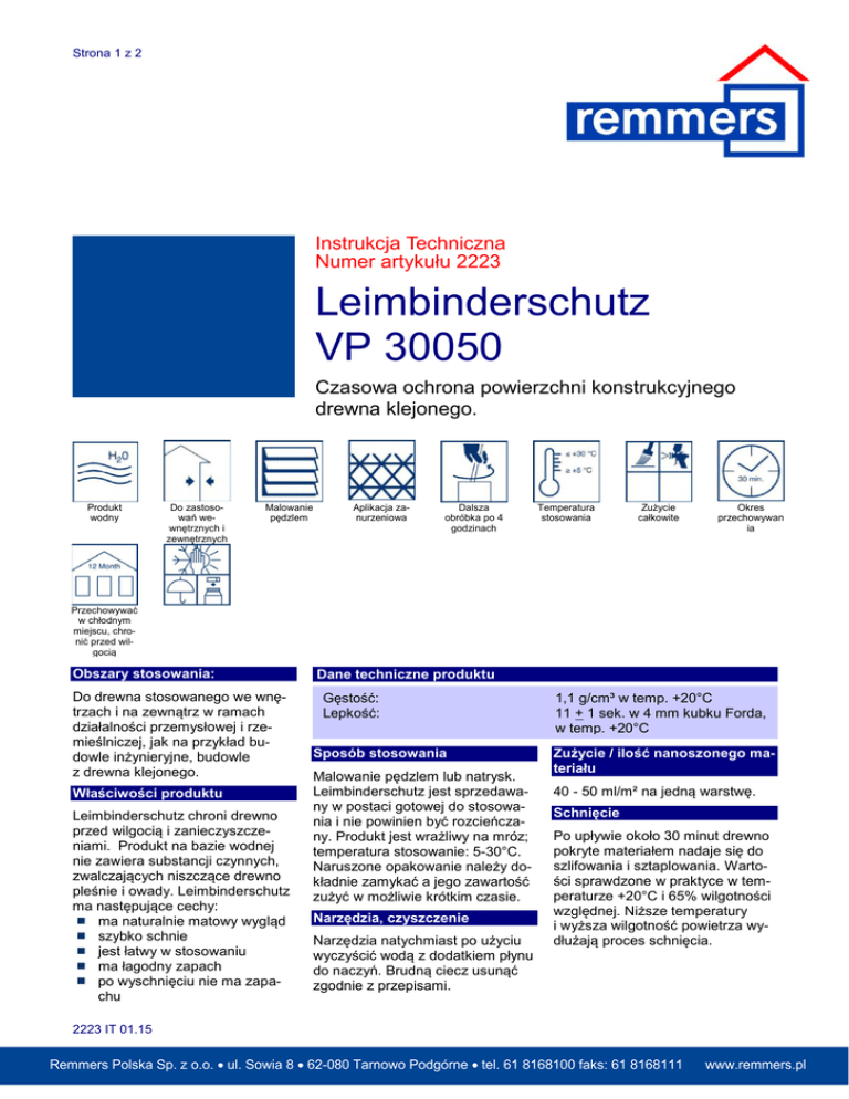 Strona 1 z 2 Instrukcja Techniczna Numer artykułu 2223 Leimbinderschutz VP 30050 Czasowa ochrona powierzchni konstrukcyjnego drewna klejonego. Produkt wodny Do zastosowań wewnętrznych i zewnętrznych Malowanie pędzlem Aplikacja zanurzeniowa Dalsza obróbka po 4 godzinach Temperatura stosowania Zużycie całkowite Okres przechowywan ia Przechowywać w chłodnym miejscu, chronić przed wilgocią Obszary stosowania: Do drewna stosowanego we wnętrzach i na zewnątrz w ramach działalności przemysłowej i rzemieślniczej, jak na przykład budowle inżynieryjne, budowle z drewna klejonego. Właściwości produktu Leimbinderschutz chroni drewno przed wilgocią i zanieczyszczeniami. Produkt na bazie wodnej nie zawiera substancji czynnych, zwalczających niszczące drewno pleśnie i owady. Leimbinderschutz ma następujące cechy: ma naturalnie matowy wygląd szybko schnie jest łatwy w stosowaniu ma łagodny zapach po wyschnięciu nie ma zapachu Dane techniczne produktu Gęstość: Lepkość: Sposób stosowania Malowanie pędzlem lub natrysk. Leimbinderschutz jest sprzedawany w postaci gotowej do stosowania i nie powinien być rozcieńczany. Produkt jest wrażliwy na mróz; temperatura stosowanie: 5-30°C. Naruszone opakowanie należy dokładnie zamykać a jego zawartość zużyć w możliwie krótkim czasie. Narzędzia, czyszczenie Narzędzia natychmiast po użyciu wyczyścić wodą z dodatkiem płynu do naczyń. Brudną ciecz usunąć zgodnie z przepisami. 1,1 g/cm³ w temp. +20°C 11 + 1 sek. w 4 mm kubku Forda, w temp. +20°C Zużycie / ilość nanoszonego materiału 40 - 50 ml/m² na jedną warstwę. Schnięcie Po upływie około 30 minut drewno pokryte materiałem nadaje się do szlifowania i sztaplowania. Wartości sprawdzone w praktyce w temperaturze +20°C i 65% wilgotności względnej. Niższe temperatury i wyższa wilgotność powietrza wydłużają proces schnięcia. 2223 IT 01.15 Remmers Polska Sp. z o.o. • ul. Sowia 8 • 62-080 Tarnowo Podgórne • tel. 61 8168100 faks: 61 8168111 www.remmers.pl Strona 2 z 2 Przechowywanie W zamkniętych oryginalnych opakowaniach, w miejscu chłodnym i suchym co najmniej 12 miesięcy. Zawartość lotnych substancji organicznych Granica wyznaczona dla tego produktu przez UE (kat. A/d): 130 g/l (2010) Ten produkt zawiera maksymalnie 120 g/l VOC. Kod produktu M-KH 01 Bezpieczeństwo, ochrona środowiska, usuwanie Bliższe informacje na temat bezpieczeństwa podczas transportu, składowania i posługiwania się tym produktem oraz jego utylizacji zawarte są w aktualnej Karcie Charakterystyki. Powyższe wskazówki zostały zestawione w naszym dziale produkcji według najnowszego stanu wiedzy i techniki stosowania. Ponieważ rodzaje zastosowań i sposób użycia są poza naszą kontrolą, z treści tej instrukcji nie wynika żadna odpowiedzialność producenta. Wskazówki wykraczające poza zawartość tej instrukcji lub wskazówki różniące się od treści instrukcji wymagają pisemnego potwierdzenia przez zakład macierzysty. W każdym przypadku obowiązują nasze ogólne warunki handlowe. Z wydaniem niniejszej instrukcji technicznej poprzednie tracą swoją ważność. 2223 IT 01.15 Remmers Polska Sp. z o.o. • ul. Sowia 8 • 62-080 Tarnowo Podgórne • tel. 61 8168100 faks: 61 8168111 www.remmers.pl