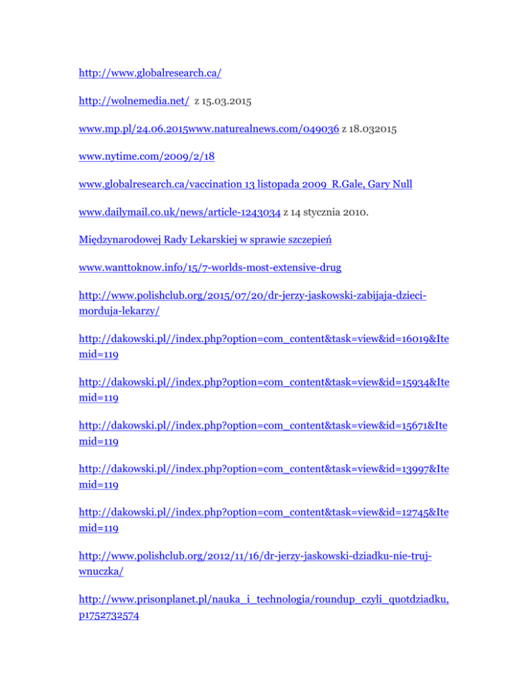 http://www.globalresearch.ca/ http://wolnemedia.net/ z 15.03.2015 www.mp.pl/24.06.2015www.naturealnews.com/049036 z 18.032015 www.nytime.com/2009/2/18 www.globalresearch.ca/vaccination 13 listopada 2009 R.Gale, Gary Null www.dailymail.co.uk/news/article-1243034 z 14 stycznia 2010. Międzynarodowej Rady Lekarskiej w sprawie szczepień www.wanttoknow.info/15/7-worlds-most-extensive-drug http://www.polishclub.org/2015/07/20/dr-jerzy-jaskowski-zabijaja-dziecimorduja-lekarzy/ http://dakowski.pl//index.php?option=com_content&task=view&id=16019&Ite mid=119 http://dakowski.pl//index.php?option=com_content&task=view&id=15934&Ite mid=119 http://dakowski.pl//index.php?option=com_content&task=view&id=15671&Ite mid=119 http://dakowski.pl//index.php?option=com_content&task=view&id=13997&Ite mid=119 http://dakowski.pl//index.php?option=com_content&task=view&id=12745&Ite mid=119 http://www.polishclub.org/2012/11/16/dr-jerzy-jaskowski-dziadku-nie-trujwnuczka/ http://www.prisonplanet.pl/nauka_i_technologia/roundup_czyli_quotdziadku, p1752732574 http://educodomi.blog.pl/2015/01/05/dyktaty-centralnych-bankow/ http://www.polishclub.org/2014/10/21/dr-jerzy-jaskowski-materialnekonsorcjum-rothschilda-upadek-panstwa-izrael-czesc-2/ http://alexjones.pl/pl/aj/aj-nwo/aj-informacje/item/39370-upadek-państwaizrael-materialne-konsorcjum-rothschilda?-cz-ii