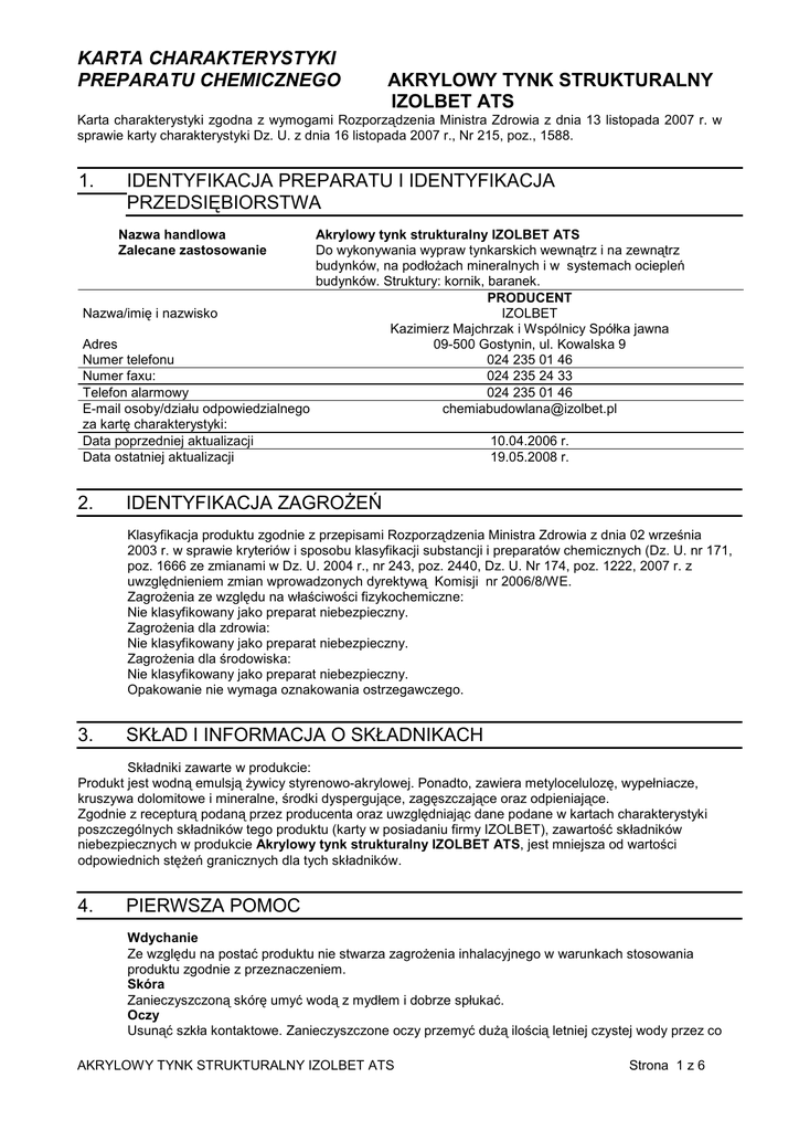 KARTA CHARAKTERYSTYKI PREPARATU CHEMICZNEGO AKRYLOWY TYNK STRUKTURALNY IZOLBET ATS Karta charakterystyki zgodna z wymogami Rozporządzenia Ministra Zdrowia z dnia 13 listopada 2007 r. w sprawie karty charakterystyki Dz. U. z dnia 16 listopada 2007 r., Nr 215, poz., 1588. 1. IDENTYFIKACJA PREPARATU I IDENTYFIKACJA PRZEDSIĘBIORSTWA Nazwa handlowa Zalecane zastosowanie Akrylowy tynk strukturalny IZOLBET ATS Do wykonywania wypraw tynkarskich wewnątrz i na zewnątrz budynków, na podłożach mineralnych i w systemach ociepleń budynków. Struktury: kornik, baranek. PRODUCENT Nazwa/imię i nazwisko IZOLBET Kazimierz Majchrzak i Wspólnicy Spółka jawna Adres 09-500 Gostynin, ul. Kowalska 9 Numer telefonu 024 235 01 46 Numer faxu: 024 235 24 33 Telefon alarmowy 024 235 01 46 E-mail osoby/działu odpowiedzialnego [email protected] za kartę charakterystyki: Data poprzedniej aktualizacji 10.04.2006 r. Data ostatniej aktualizacji 19.05.2008 r. 2. IDENTYFIKACJA ZAGROŻEŃ Klasyfikacja produktu zgodnie z przepisami Rozporządzenia Ministra Zdrowia z dnia 02 września 2003 r. w sprawie kryteriów i sposobu klasyfikacji substancji i preparatów chemicznych (Dz. U. nr 171, poz. 1666 ze zmianami w Dz. U. 2004 r., nr 243, poz. 2440, Dz. U. Nr 174, poz. 1222, 2007 r. z uwzględnieniem zmian wprowadzonych dyrektywą Komisji nr 2006/8/WE. Zagrożenia ze względu na właściwości fizykochemiczne: Nie klasyfikowany jako preparat niebezpieczny. Zagrożenia dla zdrowia: Nie klasyfikowany jako preparat niebezpieczny. Zagrożenia dla środowiska: Nie klasyfikowany jako preparat niebezpieczny. Opakowanie nie wymaga oznakowania ostrzegawczego. 3. SKŁAD I INFORMACJA O SKŁADNIKACH Składniki zawarte w produkcie: Produkt jest wodną emulsją żywicy styrenowo-akrylowej. Ponadto, zawiera metylocelulozę, wypełniacze, kruszywa dolomitowe i mineralne, środki dyspergujące, zagęszczające oraz odpieniające. Zgodnie z recepturą podaną przez producenta oraz uwzględniając dane podane w kartach charakterystyki poszczególnych składników tego produktu (karty w posiadaniu firmy IZOLBET), zawartość składników niebezpiecznych w produkcie Akrylowy tynk strukturalny IZOLBET ATS, jest mniejsza od wartości odpowiednich stężeń granicznych dla tych składników. 4. PIERWSZA POMOC Wdychanie Ze względu na postać produktu nie stwarza zagrożenia inhalacyjnego w warunkach stosowania produktu zgodnie z przeznaczeniem. Skóra Zanieczyszczoną skórę umyć wodą z mydłem i dobrze spłukać. Oczy Usunąć szkła kontaktowe. Zanieczyszczone oczy przemyć dużą ilością letniej czystej wody przez co AKRYLOWY TYNK STRUKTURALNY IZOLBET ATS Strona 1 z 6 KARTA CHARAKTERYSTYKI PREPARATU CHEMICZNEGO 4. AKRYLOWY TYNK STRUKTURALNY IZOLBET ATS PIERWSZA POMOC najmniej 15 minut. Zasięgnąć porady lekarza w przypadku utrzymywania się jakichkolwiek dolegliwości. Połknięcie Wypłukać usta wodą. Niezwłocznie zasięgnąć porady lekarza. 5. POSTĘPOWANIE W PRZYPADKU POŻARU Zalecane środki gaśnicze: Produkt nie jest palny. Powszechnie stosowane środki gaśnicze w zależności od otoczenia. Nieodpowiednie środki gaśnicze: Szczególne zagrożenie ze strony produktów spalania i wydzielających się gazów: Podczas pożaru mogą wytwarzać się szkodliwe gazy zawierające tlenek węgla, ditlenek węgla i inne toksyczne substancje. Specjalne wyposażenie ochronne strażaków: W razie potrzeby nosić odpowiedni sprzęt do oddychania Inne uwagi: Nie dopuszczać do przedostawania się skażonych środków gaśniczych do kanalizacji, wód powierzchniowych i gleby 6. POSTĘPOWANIE W PRZYPADKU NIEZAMIERZONEGO UWOLNIENIA DO ŚRODOWISKA Indywidualne środki ostrożności: Przed rozpoczęciem czynności założyć odpowiednie rękawice ochronne – gumowe i ubranie robocze. Unikać zanieczyszczenia oczu i skóry. Patrz także punkt 8. Środki ostrożności w zakresie ochrony środowiska: Nie dopuszczać do przedostawania się uwolnionego produktu do kanalizacji, wód powierzchniowych i gleby. Metody oczyszczania/usuwania: Uwolniony produkt zebrać do oznakowanych pojemników na odpady. Zanieczyszczone powierzchnie zmyć niezwłocznie wodą z odpowiednim środkiem czyszczącym. Pozostałości usuwać zgodnie z obowiązującymi przepisami. Patrz także punkt 13. 7. POSTĘPOWANIE Z PREPARATEM I JEGO MAGAZYNOWANIE Postępowanie z preparatem: Stosować zgodnie z zaleceniami podanymi w instrukcji stosowania. Przestrzegać zaleceń obowiązujących podczas pracy z czynnikami chemicznymi – rozporządzenie Ministra Zdrowia z dnia 30 grudnia 2004 r. w sprawie bezpieczeństwa i higieny pracy związanej z występowaniem w miejscu pracy czynników chemicznych – Dz. U. z dnia 18 stycznia 2005 r., Nr 11, poz. 86. Nie dopuszczać do uwalniania produktu. Unikać bezpośredniego kontaktu z oczami i skórą. Starannie umyć ręce po pracy z produktem. Magazynowanie: Przechowywać w szczelnie zamkniętym fabrycznym opakowaniu, w temperaturze od 5 C do 25 C. Chronić przed zamarzaniem. Zalecenia dotyczące wspólnego przechowywania: Nie ma szczególnych ograniczeń dotyczących przechowywania z innymi produktami. Stabilność przechowywania: 12 miesięcy od daty produkcji. AKRYLOWY TYNK STRUKTURALNY IZOLBET ATS Strona 2 z 6 KARTA CHARAKTERYSTYKI PREPARATU CHEMICZNEGO 8. AKRYLOWY TYNK STRUKTURALNY IZOLBET ATS KONTROLA NARAŻENIA I ŚRODKI OCHRONY INDYWIDUALNEJ Dodatkowe zalecenia w zakresie środków inżynieryjnych: Nosić odpowiednie środki ochrony indywidualnej – odpowiednie ubranie robocze, gumowe rękawice ochronne, okulary ochronne. Parametry kontroli narażenia: Rozporządzenie MPiPS z dnia 29 listopada 2002 r. w sprawie najwyższych dopuszczalnych stężeń i natężeń czynników szkodliwych dla zdrowia w środowisku pracy (Dz. U. z 2002 r. nr 217, poz. 1833 ze zmianami w Dz. U. z 2005 r. nr 212 poz. 1769, Dz. U. Nr 161, poz. 1142, 2007). Wartości dopuszczalnych stężeń w środowisku pracy Nie określono Zalecenia dotyczące procedur