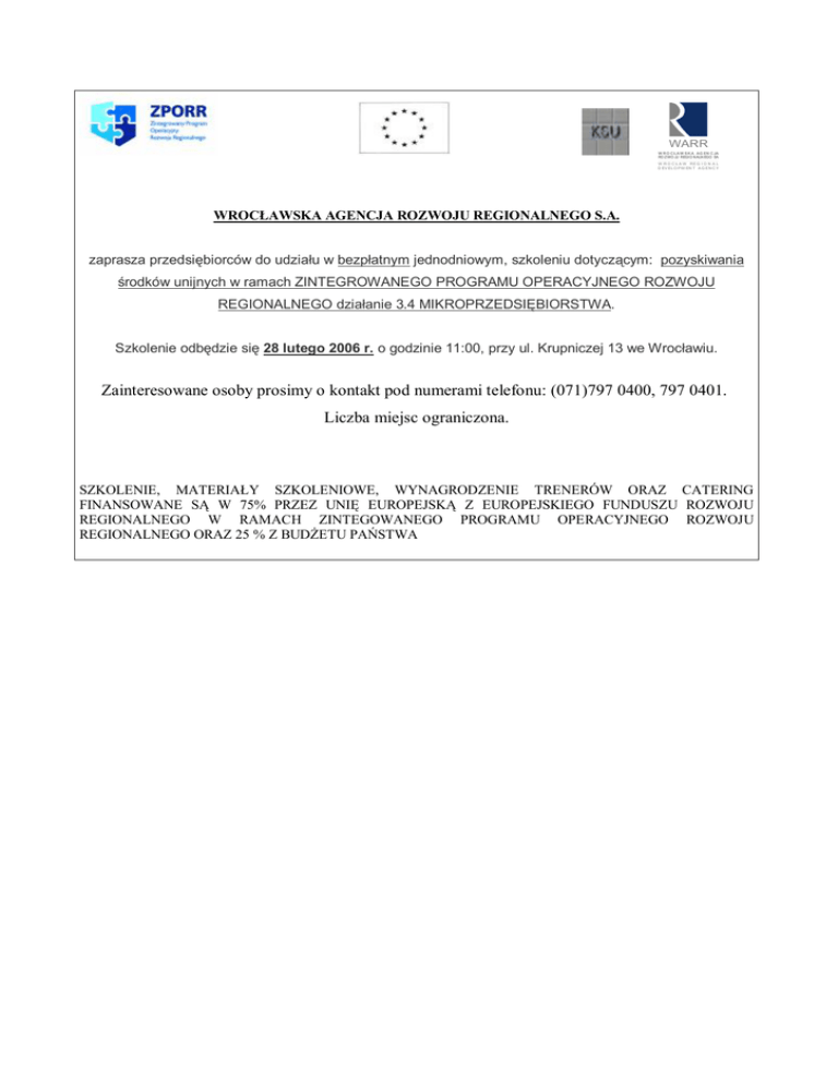 WARR W R O C ŁA W SK A AG EN C JA RO ZWO JU REGIO NALN EGO SA W R O C Ł A W RE G I O N A L D EV EL O P M EN T A G EN C Y WROCŁAWSKA AGENCJA ROZWOJU REGIONALNEGO S.A. zaprasza przedsiębiorców do udziału w bezpłatnym jednodniowym, szkoleniu dotyczącym: pozyskiwania środków unijnych w ramach ZINTEGROWANEGO PROGRAMU OPERACYJNEGO ROZWOJU REGIONALNEGO działanie 3.4 MIKROPRZEDSIĘBIORSTWA. Szkolenie odbędzie się 28 lutego 2006 r. o godzinie 11:00, przy ul. Krupniczej 13 we Wrocławiu. Zainteresowane osoby prosimy o kontakt pod numerami telefonu: (071)797 0400, 797 0401. Liczba miejsc ograniczona. SZKOLENIE, MATERIAŁY SZKOLENIOWE, WYNAGRODZENIE TRENERÓW ORAZ CATERING FINANSOWANE SĄ W 75% PRZEZ UNIĘ EUROPEJSKĄ Z EUROPEJSKIEGO FUNDUSZU ROZWOJU REGIONALNEGO W RAMACH ZINTEGOWANEGO PROGRAMU OPERACYJNEGO ROZWOJU REGIONALNEGO ORAZ 25 % Z BUDŻETU PAŃSTWA
