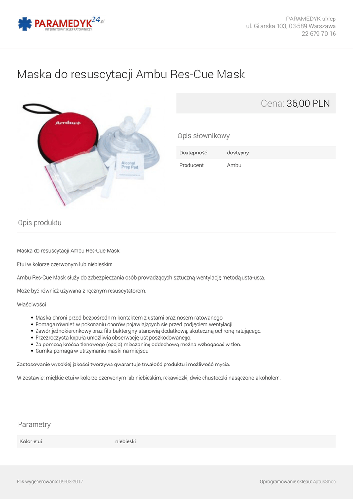 PARAMEDYK sklep ul. Gilarska 103, 03-589 Warszawa 22 679 70 16 Maska do resuscytacji Ambu Res-Cue Mask Cena: 36,00 PLN Opis słownikowy Dostępność dostępny Producent Ambu Opis produktu Maska do resuscytacji Ambu Res-Cue Mask Etui w kolorze czerwonym lub niebieskim Ambu Res-Cue Mask służy do zabezpieczania osób prowadzących sztuczną wentylację metodą usta-usta. Może być również używana z ręcznym resuscytatorem. Właściwości Maska chroni przed bezpośrednim kontaktem z ustami oraz nosem ratowanego. Pomaga również w pokonaniu oporów pojawiających się przed podjęciem wentylacji. Zawór jednokierunkowy oraz filtr bakteryjny stanowią dodatkową, skuteczną ochronę ratującego. Przezroczysta kopuła umożliwia obserwację ust poszkodowanego. Za pomocą króćca tlenowego (opcja) mieszaninę oddechową można wzbogacać w tlen. Gumka pomaga w utrzymaniu maski na miejscu. Zastosowanie wysokiej jakości tworzywa gwarantuje trwałość produktu i możliwość mycia. W zestawie: miękkie etui w kolorze czerwonym lub niebieskim, rękawiczki, dwie chusteczki nasączone alkoholem. Parametry Kolor etui Plik wygenerowano: 09-03-2017 niebieski Oprogramowanie sklepu: AptusShop PARAMEDYK sklep ul. Gilarska 103, 03-589 Warszawa 22 679 70 16 Galeria Plik wygenerowano: 09-03-2017 Powered by TCPDF (www.tcpdf.org) Oprogramowanie sklepu: AptusShop