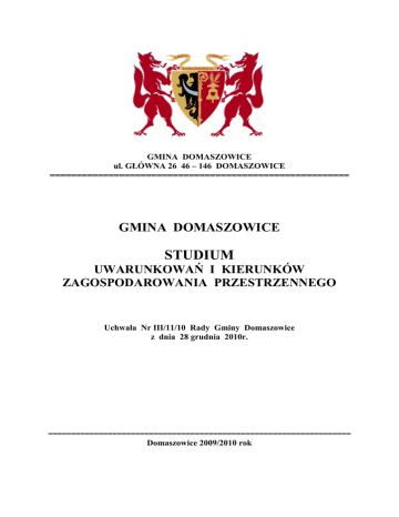 GMINA DOMASZOWICE ul. GŁÓWNA 26 46 – 146 DOMASZOWICE ======================================================== GMINA DOMASZOWICE STUDIUM UWARUNKOWAŃ I KIERUNKÓW ZAGOSPODAROWANIA PRZESTRZENNEGO Uchwała Nr III/11/10 Rady Gminy Domaszowice z dnia 28 grudnia 2010r. ================================================================== Domaszowice 2009/2010 rok Autorzy opracowania: główny projektant: mgr Helena Nowik czł. ZOIU Nr Z - 059 współpraca: mgr Dorota Sadkowska mgr inż. Adam Ziaja czł. ZOIU Nr Z - 507 III. Kierunki zagospodarowania przestrzennego, polityka przestrzenna gminy ….1 1. 1.1. 1.2. Cele rozwoju gminy Cel główny Cele pośrednie, zadania ……….…2 ……….…2 ………….3 2. Prognoza demograficzna ………….6 3. Kierunki zmian w strukturze przestrzennej gminy oraz w przeznaczaniu terenów ………….……….9 3.1. Ogólna charakterystyka planowanych kierunków rozwoju przestrzennego gminy …..9 3.1.1. Ogólna dyspozycja funkcjonalno – przestrzenna gminy ………………………….9 3.2. Waloryzacja obszaru gminy dla funkcji użytkowych związanych z przestrzennym rozwojem gminy dla ustalenia przeznaczenia i zasad zagospodarowania terenów………….10 3.3. Wskaźniki dotyczące zagospodarowania oraz użytkowania terenów ……………….18 3.4. Obszary zabudowane, ze wskazaniem terenów wymagających przekształceń i rehabilitacji …………………26 3.5. Zasady kształtowania zabudowy i krajobrazu .…………27 4. Kierunki polityki przestrzennej gminy w sferze ekologii 3.6.Strategiczne kierunki działań 3.7.Kierunki działań ochronnych …………………29 …………………30 …………………20 5. Obszary oraz zasady ochrony środowiska i jego zasobów ochrony przyrody i krajobrazu kulturowego …………….……32 5.1.Wartości środowiska przyrodniczego …………….……32 5.1.1. Obszary i obiekty prawnie chronione …………………………………………………33 ……….…36 5.2.Obszary cenne przyrodniczo nie objęte ochroną prawną 5.3.Obszary przyrodnicze proponowane do objęcia ochrona prawna ………….37 ……………….…37 5.4.Obszary o wartościach kulturowo – krajobrazowych 5.5.Przyrodnicze powiązania zewnętrzne gminy ……………….…38 5.6.Zagrożenia środowiskowe ………….38 5.7.Zagrożenia wynikające z istniejących uwarunkowań gminy …………….……40 6. Środowisko kulturowe – obszary i zasady ochrony dziedzictwa kulturowego i zabytków oraz dóbr kultury współczesnej ………………….40 6.1.Zabytki architektury i budownictwa ……….…41 6.2.Stanowiska archeologiczne ……….…43 6.3.Obiekty zabytkowe ewidencyjne ……………….…44 6.4.Polityka w zakresie ochrony wartości kulturowych gminy ……….…44 6.5.Zasady kształtowania krajobrazu kulturowego ……………….…45 7. Kierunki rozwoju systemów komunikacji ………………………………………….…46 8. Kierunki rozwoju systemów infrastruktury technicznej …………………………….48 8.1. Zaopatrzenie w wodę ……….…48 8.2. Odprowadzanie ścieków ……….…48 8.3. Elektroenergetyka …….……49 8.4. Gazownictwo ……….…49 8.5. Telekomunikacja …….……50 8.6. Ciepło ………….50 9. Gospodarka odpadami ………….………50 10. Obszary , na których rozmieszczone będą inwestycje celu publicznego o znaczeniu lokalnym ………………….52 11. Obszary, na których rozmieszczone będą inwestycje celu publicznego o znaczeniu ponadlokalnym, zgodnie z ustaleniami planu zagospodarowania przestrzennego województwa i ustaleniami programów o których mowa w art.48 ust.1 ……..…50 12. Obszary, dla których obowiązkowe jest sporządzenie miejscowego planu zagospodarowania przestrzennego na podstawie przepisów odrębnych, w tym obszary wymagające przeprowadzenia scaleń i podziału nieruchomości , a także obszary rozmieszczenia obiektów handlowych o powierzchni sprzedaży powyżej 2000m² oraz obszary przestrzennej publicznej ……….…54 13. Obszary, dla których gmina zamierza sporządzić plan zagospodarowania przestrzennego, w tym obszary wymagające zmiany przeznaczenia gruntów ……….…56 rolnych i leśnych na cele nierolnicze i nieleśne 14. Kierunki i zasady kształtowania rolniczej i leśnej przestrzeni produkcyjnej ….56 15. Kierunki rozwoju infrastruktury społecznej ……….…58 16. Obszary narażone na niebezpieczeństwo powodzi i osuwania się mas ziemnych ……….…59 17. Obiekty i obszary filar ochronny , dla których wyznacza się w złożu kopaliny ……….…59 18. Obszary pomników zagłady i ich stref ochronnych ……….…59 19. Obszary wymagające przekształceń, rehabilitacji lub rekultywacji ……….…59 20. Granice terenów zamkniętych i ich stref ochronnych ……….…60 21. Atrakcyjny wizerunek gminy jak element aktywizacji gospodarczej ………….61 22. Kierunki wykorzystania środowiska przyrodniczego gminy dla rozwoju funkcji rekreacyjno-wypoczynkowych ………….61 23. Kierunki zwiększenia potencjału gospodarczego gminy poprzez wykształcenie potencjału środowiska przyrodniczego ………….62 24.Uzasadnienie przyjętych w zmianie studium rozwiązań …………..63 25. Synteza ustaleń projektu zmiany studium …………..64 Gmina Domaszowice Studium Uwarunkowań i Kierunków zagospodarowania przestrzennego ================================================================== III. KIERUNKI ZAGOSPODAROWANIA PRZESTRZENNEGO – POLITYKA PRZESTRZENNA GMINY Zgodnie z art. ustawy z 27 marca 2003 roku o planowaniu i zagospodarowaniu przestrzennym w studium określa się w szczególności: 1) kierunki zmian w strukturze przestrzennej gminy oraz w przeznaczeniu terenów, 2) kierunki i wskaźniki dotyczące zagospodarowania oraz użytkowania terenów, w tym tereny wyłączone spod zabudowy, 3) obszary oraz zasady ochrony środowiska i jego zasobów, och