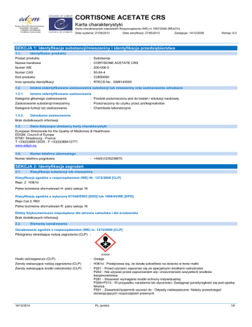 CORTISONE ACETATE CRS Karta charakterystyki Karta charakterystyki odpowiedni Rozporządzenie (WE) nr 1907/2006 (REACH) Data wydania: 27/06/2013 Data weryfikacji: 27/06/2013 Zastępuje: 14/12/2009 Wersja: 6.0 SEKCJA 1: Identyfikacja substancji/mieszaniny i identyfikacja przedsiębiorstwa 1.1. Identyfikator produktu Postać produktu : Substancja Nazwa handlowa : CORTISONE ACETATE CRS Numer WE : 200-006-5 Numer CAS : 50-04-4 Kod produktu : C2800000 Inne sposoby identyfikacji : RTECS No : GM9140000 1.2. Istotne zidentyfikowane zastosowania substancji lub mieszaniny oraz zastosowania odradzane 1.2.1. Istotne zidentyfikowane zastosowania Kategoria głównego zastosowania : Produkt przeznaczony jest do badań i edukacji naukowej. Zastosowanie substancji/mieszaniny : Przeznaczony do użytku przez profesjonalistów Kategoria funkcji lub zastosowania : Chemikalia laboratoryjne 1.2.2. Odradzane zastosowanie Brak dodatkowych informacji 1.3. Dane dotyczące dostawcy karty charakterystyki European Directorate for the Quality of Medicines & Healthcare EDQM, Council of Europe 67081 Strasbourg - France T +33(0)388412035 - F +33(0)388412771 www.edqm.eu 1.4. Numer telefonu alarmowego Numer telefonu pogotowia : +44(0)1235239670 SEKCJA 2: Identyfikacja zagrożeń 2.1. Klasyfikacja substancji lub mieszaniny Klasyfikacja zgodnie z rozporządzeniem (WE) Nr. 1272/2008 [CLP] Repr. 2 H361d Pełne brzmienie sformułowań H: patrz sekcja 16 Klasyfikacja zgodnie z wytyczną 67/548/EWG [DSD] lub 1999/45/WE [DPD] Repr.Cat.3; R63 Pełne brzmienie sformułowań R: patrz sekcja 16 Efekty fizykochemiczne niepożądane dla zdrowia człowieka i dla środowiska Brak dodatkowych informacji 2.2. Elementy oznakowania Oznakowanie zgodnie z rozporządzeniem (WE) nr. 1272/2008 [CLP] Piktogramy określające rodzaj zagrożenia (CLP) : GHS08 Hasło ostrzegawcze (CLP) : Uwaga Zwroty wskazujące rodzaj zagrożenia (CLP) : H361d - Podejrzewa się, że działa szkodliwie na dziecko w łonie matki Zwroty wskazujące środki ostrożności (CLP) : P201 - Przed użyciem zapoznać się ze specjalnymi środkami ostrożności P202 - Nie używać przed zapoznaniem się i zrozumieniem wszystkich środków bezpieczeństwa P281 - Stosować wymagane środki ochrony indywidualnej P308+P313 - W przypadku narażenia lub styczności: Zasięgnąć porady/zgłosić się pod opiekę lekarza P501 - Zawartość/pojemnik usuwać do : Odpady niebezpieczne. Należy przestrzegać obowiązujących rozporządzeń prawnych 18/12/2014 PL (polski) 1/6 CORTISONE ACETATE CRS Karta charakterystyki Karta charakterystyki odpowiedni Rozporządzenie (WE) nr 1907/2006 (REACH) 2.3. Inne zagrożenia Inne zagrożenia mające wpływ na klasyfikację : Ekspozycja może spowodować reakcję alergiczną. SEKCJA 3: Skład/informacja o składnikach 3.1. Substancja Nazwa : CORTISONE ACETATE Numer CAS : 50-04-4 Numer WE : 200-006-5 Nazwa Identyfikator produktu % Klasyfikacja zgodnie z dyrektywą 67/548/EEC CORTISONE ACETATE (Numer CAS) 50-04-4 (Numer WE) 200-006-5 ≤ 100 Repr.Cat.3; R63 Nazwa Identyfikator produktu % Klasyfikacja zgodnie z rozporządzeniem (WE) Nr. 1272/2008 [CLP] CORTISONE ACETATE (Numer CAS) 50-04-4 (Numer WE) 200-006-5 ≤ 100 Repr. 2, H361d Brzmienie sformułowań R i H: patrz sekcja 16 3.2. Mieszanina Nie dotyczy SEKCJA 4: Środki pierwszej pomocy 4.1. Opis środków pierwszej pomocy Pierwsza pomoc - środki po zainhalowaniu : W razie przypadkowej inhalacji, wyprowadzić poszkodowanego na świeże powietrze. Zapewnić oddychanie świeżym powietrzem. Pierwsza pomoc - środki po kontakcie ze skórą : Spłukać skórę pod strumieniem wody/prysznicem. Pierwsza pomoc - środki po kontakcie z oczami : Płukanie w wodzie trzymając powieki szeroko rozwarte. Zdjąć soczewki kontaktowe. Pierwsza pomoc - środki po połknięciu : Przepłukać usta wodą. 4.2. Najważniejsze ostre i opóźnione objawy oraz skutki narażenia Symptomy/urazy 4.3. : Patrz Punkt 2. Wskazania dotyczące wszelkiej natychmiastowej pomocy lekarskiej i szczególnego postępowania z poszkodowanym W przypadku jakichkolwiek wątpliwości lub jeśli objawy się utrzymują, zwrócić się do lekarza. SEKCJA 5: Postępowanie w przypadku pożaru 5.1. Środki gaśnicze Odpowiednie środki gaśnicze : Małe ilości: Stosować odpowiednie środki do zwalczania pożaru w sąsiedztwie. Koc gaśniczy. Ditlenek węgla. Suchy proszek. Duże ilości: Nie dotyczy. Nieodpowiednie środki gaśnicze : Woda może być nieskuteczna w zwalczaniu pożaru ze względu na słabą rozpuszczalność. 5.2. Szczególne zagrożenia związane z substancją lub mieszaniną Reaktywny w przypadku pożaru 5.3. : Patrz Rubryka 10.1. Informacje dla straży pożarnej Środki zapobiegawcze celem uniknięcia pożaru : Małe ilości: Stosować zwykły, indywidualny sprzęt ochrony przeciwpożarowej. Duże ilości: Nie dotyczy. SEKCJA 6: Postępowanie w przypadku niezamierzonego uwolnienia do środowiska 6.1. Indywidualne środki ostrożności, wyposażenie ochronne i procedury w sytuacjach awaryjnych Ogólne środki zaradcze 6.1.1. Dla osób nienależących do personelu udzielającego pomocy Wyposażenie ochronne 6.1.2. : Unikać wydzielania się pyłów. Nosić odpowiednią odzież ochronną, odpowiednie rękawice i okulary ochronne lub osłonę twarzy. Duże ilości: Nie dotyczy. : Patrz Nagłówek 7/8. Dla osób udzielających pomocy Brak dodatkowych informacji 6.2. Środki ostrożności w zakresie ochrony środowiska Brak dodatkowych informacji 18/12/2014 PL (polski) 2/6 CORTISONE ACETATE CRS Karta charakterystyki Karta charakterystyki odpowiedni Rozporządzenie (WE) nr 1907/2006 (REACH) 6.3. Metody i materiały zapobiegające rozprzestrzenianiu się skażenia i służące do usuwania skażenia Metody oczyszczania 6.4. : Zamieść i zebrać rozprzestrzenioną substancję do pojemników. Należy upewnić się, że odpady zostaną zebrane i zmagazynowane w bezpiecznym miejscu. Dokładnie wyczyścić. Słabo rozpuszczalny w wodzie. Czysz