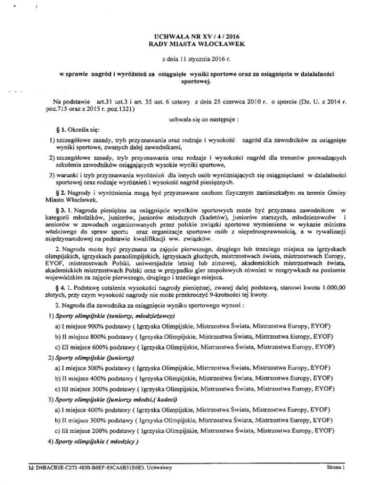 ucHwALA NR XV I 412016 RADY MIASTA WLOCI-AWEK z dnia I I stvcznia 2016 r. w sprawie nagr6d i wyr62nieri za osiqgnigte wyniki sportowe oraz za osiqgnigcia w dzialalnoici sportowej, Na podstawie art.3l ust.3 poz.'115 oraz 22015 r, i arl 35 ust. 6 ustawy z dr'ia 25 czerwca 2010 poz.l321) uchwala sig co nastgpuje $ l. r. o sporcie @z U.22014 r. : OkeSla sig: tryb przyzrawania oraz rodzaje i wysokoSi nagr6d dla zawodnik6w za osiqgnigte wyniki sportowe, zwanych dalej zawodnikami, 1) szczeg6lowe zasady, 2) szczegrAowe zasady, tryb przynawania oraz rodzale i wysokoSci nagr6d dla trener6w prowadz4cych szkolenia zawodnik6w osi4gaj4cych wysokie wyniki sportowe, 3) warunki i tryb prrymawania wyr62niei dla innych os6b wyr6zniaj4cych sig osiqgnigciami w dzialalnoSci spo*owej oraz rodzaje wyr62nief i wysokoSi nag6d pienig2nych. $ 2. Nagrody i wyr62nienia mog4 byi przyznawane osobom fizycznym zanieszkalym na terenie Gminy Miasto Woclawek. $3. 1. Nagroda pienigZna za osi4gnigcie wynik6w sportowych moze byi przyznana zawodnikom w kategorii mlo&ik6w, junior6w, junior6w mlodszych (kadet6w), junior6w starszych, mlodzieZowc6w i senior6w w zawodach organizowanych przez polskie zwiqzki sportowe wymienione w wykazie ministra wlaSciwego do spraw sportu oraz orgNizacje sportowe os6b z niepelnosprawnoSci4 a w rywalizacji migdzynarodowej na podstawie kwalifikacji ww. zwiqzk6w 2. Nagroda mo2e byi pzymxb za zajgcie pierwszego, drugiego lub trzeciego miejsca na igrzyskach olimpijskich, igrzyskach paraolimpijskich, igrzyskach gluchyctr" mistrzostwach Swiat4 mistrzostwach Europy, EYOF, mistrzostwach Polski, uniwersjadzie letniej lub zimowej, akademickich mistrzostwach Swiat4 akademickich mistrzostwach Polski oraz w przypadku gier zespolowych r6wnie2 w rozgrywkach na poziomie wojew6dzkim za zajgcie pierwszego, drugiego i trzeciego miejsca. $ 4. l. Podstawg ustalenia wysoko5ci nagrody pienig2nej, zwanej dalej podstaw4, stanowi kwota 1.000,00 zlolych, przy czym wysoko66 nagrody nie mo2e przekroczy6 9-kotnodci tej kwoty. 2. Nagroda dla zawodnika za osi4gnigcie wyniku sportowego 1) Sporty $lnosi : olimpiskie (seniorqy, mlodzieiowcy) a) I miejsce 900% podstawy ( Igrzyska Olimpijskie, Mistrzostwa Swiata, Mistrzostwa Europy, EYOF) 2) b) II miejsce 800% podstawy ( Igrzyska Olimpijskie, Mistrzostwa Swiata, Mistrzostwa Europy, EYOF) c) III miejsce 600% podstawy ( Igrzyska Olimpijskie, Mistrzostwa Swiata, Mistrzostwa Europy, EYOF) Spofi olimpijskie Quniorzy) a) I miejsce 500% podstawy ( Igrzyska Olimpijskie, Mistrzostwa Swiata- Mistrzostwa Europy, EYOF) b) II miejsce 400% podstawy ( Igrzyska Olimpijskie, Mistrzostwa Swiat4 Mistrzostwa Europy, EYOF) c) III miejsce 300% podstawy ( Igrzyska Olimpijskie, Mistrzostwa Swiat4 Mistrzostwa Europy, EYOF) 3) Sporty olimpijskie (juniorq mlodsi,( kadeci) a) I miejsce 400% podstawy ( Igrzyska Olimpijskie, Mistrzostwa Swiata, Mistrzostwa Europy, EYOF) 4) b) II miejsce 300% podstawy ( Igrzyska Olimpijskie, Mistrzostwa Swiata, Mistrzostwa Europy, EYOF) c) III miejsce 200% podstawy ( Igzyska Olimpijskie, Mistrzostwa Swiata, Mistrzostwa Europy, EYOF) Sporv olimpijskie ( nlodzicy ) Idt D4B ACB2E-C273 4850-B0EF.83CA683 I E6E3. Uchwalony Stsona I a) I miejsce 300% podstawy ( Igrzyska Olimpijskie, Mistrzostwa Swiata, Mishzoshva Europy, b) II miejsce 200 7o podstawy ( Igrzyska orimpijskie. Mistrzostwa EyOF) swiat4 Mistrzostwa Europy, EyoF) c) III miejsce 100% podstawy ( Igrzyska orimpijskie, Mistrzostwa Swiat4 Mistrzosrwa Europy, EyoF) 5) Sporty olimpijskie (seniarzy, mtodzieiowc! a) I miejsce 150% podstawy ( Mistrzostwa polski, uniwersjada letnia lub zimowa) II miejsce 120% podstawy ( Mistrzostwa polski, uniwersjada letnia lub zimowa) c) III miejsce 100% podstawy ( Mistrzostwa polski, uniwersjada letnia lub zimowa) b) 6) Sporty olimpijskie (juniorry) a) I miejsce 120% podstawy ( Mistrzostwa polski, uniwersjada letnia lub zimowa) b) II miejsce 100% podstawy ( Mistrzostwa polski, uniwersjada letnia lub zimowa) c) III miejsce 80% podstawy ( Mistr-zostwa polski, uniwersjada letnia lub zimowa) 7) Sporty olimpijskie Qunio4y mtodsi,( kadeci, ) a) I miejsce 100% podstawy ( Mistrzostwa polski, uniwersjada letnia lub zimowa) b) II miejsce 80% podstawy ( Mistrzostwa polski, uniwersjada letnia lub zimowa) c) III miejsce 60% podstawy (Mistrzostwa polski, uniwersjada letrria lub zirnowa) 8) Spofiy olintpfiskie ( n lodzicf ) a) I miejsce 80% podstawy (Mistrzostwa polski, uniwenjada letnia lub zimowa) b) II miejsce 60% podstawy (Mistrzostwa polski, uniwersjada letnia lub zimowa) c) III miejsce 40% podstawy ( Misnzostwa polski, uniwenjada letnia lub zimowa) 9) Sport! nieolimpijskie (seniarqy, mlodzieZowq)) .l.j:.: 70% podstawy (Mistrzostwa swiata ,Mistrzostwa Europy, Mistrzostwa porski, uniwenjada ") IIetnia lub zimowa) b) II miejsce.60% podstawy ( Igrzyska olimpijskie, Mistrzostwa Swiata, Mistr-zostwa Europy, Mistrzostwa Polski, uniwenjada letnia lub zimowa) c) III.. miejsce 5070 podstawy. ( olimpijskie, Mistrzosrwa Swiat4 Mistrzostwa Euopy, (Mishzostwa Polski, uniwenjada Jp.vrt" letnia lub zimowa) 10) Sporty nieolimpijshie (j un iony) a) I miejsce b) II miejsce.5O% podstawy ( Igrzyska olimpijskie, Mistrzostwa Swiat4 Mistrzosrwa Europy, Misrzosrwa Polski, uniwenjada letnia lub zimowa) fo% gofstawy ( Igrzyska olimpijskie, Mistrzostwa Swiata Mistrzosrwa Europy, Mistrzostwa Polski, uniwersjada letnia lub zimowa) c) III.miejsce.40% podstawy ( Igrzyska orimpijskie, Misazostwa swiat4 Mistrzosrwa Europy, Mistrzostwa Polski, uniwersjada letnia lub zimowa) ll) Sporty nieolinpiskie (juniorry nlodsi, (kadeci), nnodzic! ) a) I miejsce 507o podstawy ( Igrzyska olimpijskie, Mistrzostwa swiata, Mistrzostwa Europy, Mistrzostwa Polski, uniwenjada leuria lub zimowa.l b) II miejsce.40%.pgdstawy ( Igrzyska orimpijskie, Mistrzostwa Swiat4 Mistrzostwa Europy, Mistrzostwa Polski, uniwersjada letnia lub zrmowa) c) III,miejsce 307o podstawy ( Igrzyska olimpijskie, Mistrzostwa Swiata, Misrrzosrwa Europy, Mistrzostwa Polski, uniwersjada letnia lub