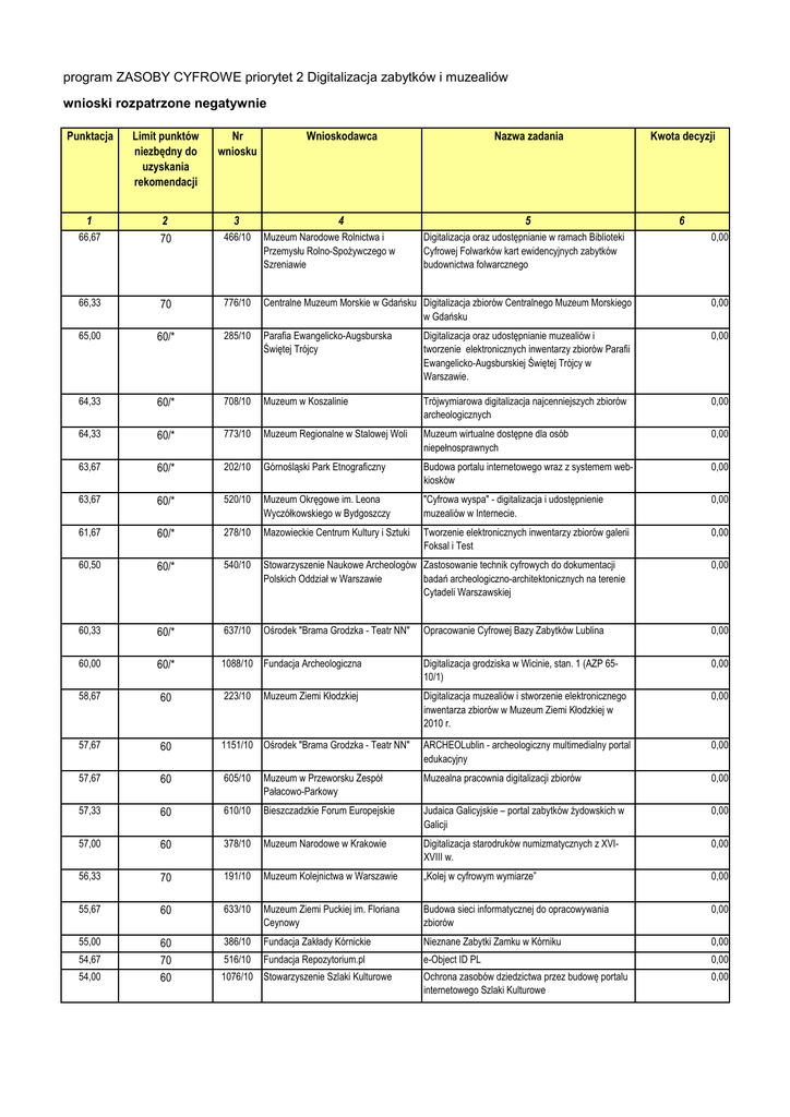 program ZASOBY CYFROWE priorytet 2 Digitalizacja zabytków i muzealiów wnioski rozpatrzone negatywnie Punktacja Limit punktów niezbędny do uzyskania rekomendacji 1 66,67 2 70 466/10 Muzeum Narodowe Rolnictwa i Przemysłu Rolno-SpoŜywczego w Szreniawie 66,33 70 776/10 Centralne Muzeum Morskie w Gdańsku Digitalizacja zbiorów Centralnego Muzeum Morskiego w Gdańsku 0,00 65,00 60/* 285/10 Parafia Ewangelicko-Augsburska Świętej Trójcy Digitalizacja oraz udostępnianie muzealiów i tworzenie elektronicznych inwentarzy zbiorów Parafii Ewangelicko-Augsburskiej Świętej Trójcy w Warszawie. 0,00 64,33 60/* 708/10 Muzeum w Koszalinie Trójwymiarowa digitalizacja najcenniejszych zbiorów archeologicznych 0,00 64,33 60/* 773/10 Muzeum Regionalne w Stalowej Woli Muzeum wirtualne dostępne dla osób niepełnosprawnych 0,00 63,67 60/* 202/10 Górnośląski Park Etnograficzny Budowa portalu internetowego wraz z systemem webkiosków 0,00 63,67 60/* 520/10 Muzeum Okręgowe im. Leona Wyczółkowskiego w Bydgoszczy "Cyfrowa wyspa" - digitalizacja i udostępnienie muzealiów w Internecie. 0,00 61,67 60/* 278/10 Mazowieckie Centrum Kultury i Sztuki Tworzenie elektronicznych inwentarzy zbiorów galerii Foksal i Test 0,00 60,50 60/* 540/10 Stowarzyszenie Naukowe Archeologów Zastosowanie technik cyfrowych do dokumentacji Polskich Oddział w Warszawie badań archeologiczno-architektonicznych na terenie Cytadeli Warszawskiej 0,00 60,33 60/* 637/10 Ośrodek "Brama Grodzka - Teatr NN" Opracowanie Cyfrowej Bazy Zabytków Lublina 0,00 60,00 60/* 1088/10 Fundacja Archeologiczna Digitalizacja grodziska w Wicinie, stan. 1 (AZP 6510/1) 0,00 58,67 60 223/10 Digitalizacja muzealiów i stworzenie elektronicznego inwentarza zbiorów w Muzeum Ziemi Kłodzkiej w 2010 r. 0,00 57,67 60 1151/10 Ośrodek "Brama Grodzka - Teatr NN" ARCHEOLublin - archeologiczny multimedialny portal edukacyjny 0,00 57,67 60 605/10 Muzeum w Przeworsku Zespół Pałacowo-Parkowy Muzealna pracownia digitalizacji zbiorów 0,00 57,33 60 610/10 Bieszczadzkie Forum Europejskie Judaica Galicyjskie – portal zabytków Ŝydowskich w Galicji 0,00 57,00 60 378/10 Muzeum Narodowe w Krakowie Digitalizacja starodruków numizmatycznych z XVIXVIII w. 0,00 56,33 70 191/10 Muzeum Kolejnictwa w Warszawie „Kolej w cyfrowym wymiarze” 0,00 55,67 60 633/10 Muzeum Ziemi Puckiej im. Floriana Ceynowy Budowa sieci informatycznej do opracowywania zbiorów 0,00 55,00 60 70 60 386/10 Fundacja Zakłady Kórnickie Nieznane Zabytki Zamku w Kórniku 0,00 516/10 Fundacja Repozytorium.pl e-Object ID PL 0,00 Ochrona zasobów dziedzictwa przez budowę portalu internetowego Szlaki Kulturowe 0,00 54,67 54,00 Nr wniosku 3 Wnioskodawca 4 Muzeum Ziemi Kłodzkiej 1076/10 Stowarzyszenie Szlaki Kulturowe Nazwa zadania Kwota decyzji 5 6 Digitalizacja oraz udostępnianie w ramach Biblioteki Cyfrowej Folwarków kart ewidencyjnych zabytków budownictwa folwarcznego 0,00 51,33 60 366/10 Muzeum Śląskie w Katowicach Digitalizacja przestrzenna zasobów muzealnych Muzeum Śląskiego w Katowicach 0,00 51,33 60 484/10 Muzeum Rolnictwa im. ks. Krzysztofa Kluka w Ciechanowcu "Wirtualne Muzeum Rolnictwa im. ks. Krzysztofa Kluka w Ciechanowcu" 0,00 51,00 60 412/10 Muzeum Nadwiślańskie w Kazimierzu Dolnym Przeszłość przyszłości. Wirtualna prezentacja zbiorów puławskich 0,00 49,33 60 735/10 Towarzystwo Przyjaciół Skawiny Digitalizacja zabiorów i utworzenie Wirtualnego Muzeum Regionalnego w Skawinie 0,00 48,67 60 456/10 Muzeum Narodowe Rolnictwa i Przemysłu Rolno-SpoŜywczego w Szreniawie Digitalizacja muzealiów 2D/3D i udostępnienie w internecie 0,00 47,67 60 748/10 Fundacja Nauka i Kultura Portal Internetowy "Krakowskie kamienice i ich mieszkańcy" Etap I Kazimierz 0,00 47,00 60 397/10 Muzeum Miasta Ostrowa Wielkopolskiego Digitalizacja zbiorów Muzeum Miasta Ostrowa Wielkopolskiego 0,00 47,00 60 742/10 Fundacja Nauka i Kultura Portal Edukacyjny - Bitwy OręŜa Polskiego. Etap I "Rok 1410 - Bitwa pod Grunwaldem" 0,00 45,67 60 478/10 Parafia Rzymskokatolicka p.w. św. Bartłomieja Apostoła i św. Jadwigi w Trzebnicy Wirtualne Sanktuarium 0,00 44,50 60 1102/10 Stowarzyszenie Naukowe Archeologów Digitalizacja zabytków archeologicznych z grodziska w Polskich Oddział Lubuski Wicinie 0,00 42,67 60 214/10 Muzeum OręŜa Polskiego w Kołobrzegu Pracownia Digitalizacji i Dokumentacji Zbiorów 0,00 41,67 60 402/10 Ośrodek Kultury "Wzgórze Zamkowe" Świadectwa czasu - zabytki powiatu lubińskiego 0,00 40,33 60 60 532/10 Muzeum Łowiectwa i Jeździectwa W kierunku wirtualnego muzeum 0,00 27,33 264/10 Państwowe Muzeum Etnograficzne w Warszawie Digitalizacja ksiąg inwentarzowych muzealiów i archiwaliów. 0,00 22,67 60 241/10 Muzeum Wsi Radomskiej Digitalizacja w muzeach skansenowskich i etnograficznych 0,00 /* Na podstawie § 7 ust. 10 Regulaminu oceny wniosków, stanowiącego załącznik nr 4 do decyzji Ministra Kultury i Dziedzictwa Narodowego Nr 19 z dnia 19 października 2009 r. (Dziennik Urzędowy MKiDN Nr 4 z 2009 r.), limit punktów wymaganych do otrzymania dotacji został podniesiony do wysokości 66 punktów (dla zadań jednorocznych).