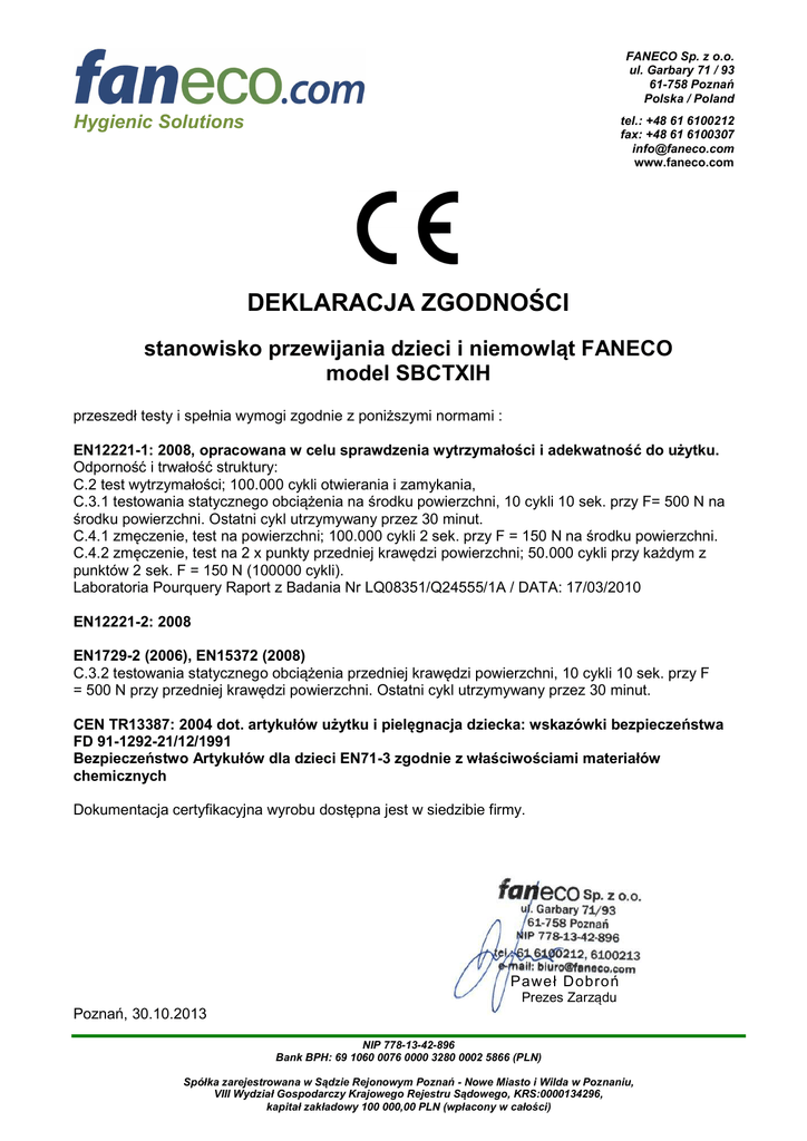 FANECO Sp. z o.o. ul. Garbary 71 / 93 61-758 Poznań Polska / Poland Hygienic Solutions tel.: +48 61 6100212 fax: +48 61 6100307 [email protected] www.faneco.com DEKLARACJA ZGODNOŚCI stanowisko przewijania dzieci i niemowląt FANECO model SBCTXIH przeszedł testy i spełnia wymogi zgodnie z poniższymi normami : EN12221-1: 2008, opracowana w celu sprawdzenia wytrzymałości i adekwatność do użytku. Odporność i trwałość struktury: C.2 test wytrzymałości; 100.000 cykli otwierania i zamykania, C.3.1 testowania statycznego obciążenia na środku powierzchni, 10 cykli 10 sek. przy F= 500 N na środku powierzchni. Ostatni cykl utrzymywany przez 30 minut. C.4.1 zmęczenie, test na powierzchni; 100.000 cykli 2 sek. przy F = 150 N na środku powierzchni. C.4.2 zmęczenie, test na 2 x punkty przedniej krawędzi powierzchni; 50.000 cykli przy każdym z punktów 2 sek. F = 150 N (100000 cykli). Laboratoria Pourquery Raport z Badania Nr LQ08351/Q24555/1A / DATA: 17/03/2010 EN12221-2: 2008 EN1729-2 (2006), EN15372 (2008) C.3.2 testowania statycznego obciążenia przedniej krawędzi powierzchni, 10 cykli 10 sek. przy F = 500 N przy przedniej krawędzi powierzchni. Ostatni cykl utrzymywany przez 30 minut. CEN TR13387: 2004 dot. artykułów użytku i pielęgnacja dziecka: wskazówki bezpieczeństwa FD 91-1292-21/12/1991 Bezpieczeństwo Artykułów dla dzieci EN71-3 zgodnie z właściwościami materiałów chemicznych Dokumentacja certyfikacyjna wyrobu dostępna jest w siedzibie firmy. Paweł Dobroń Prezes Zarządu Poznań, 30.10.2013 NIP 778-13-42-896 Bank BPH: 69 1060 0076 0000 3280 0002 5866 (PLN) Spółka zarejestrowana w Sądzie Rejonowym Poznań - Nowe Miasto i Wilda w Poznaniu, VIII Wydział Gospodarczy Krajowego Rejestru Sądowego, KRS:0000134296, kapitał zakładowy 100 000,00 PLN (wpłacony w całości)