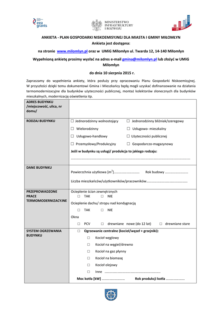 ANKIETA - PLAN GOSPODARKI NISKOEMISYJNEJ DLA MIASTA I GMINY MIŁOMŁYN Ankieta jest dostępna: na stronie www.milomlyn.pl oraz w UMiG Miłomłyn ul. Twarda 12, 14-140 Miłomłyn Wypełnioną ankietę prosimy wysłać na adres e-mail [email protected] lub złożyć w UMiG Miłomłyn do dnia 10 sierpnia 2015 r. Zapraszamy do wypełnienia ankiety, która posłuży przy opracowaniu Planu Gospodarki Niskoemisyjnej. W przyszłości dzięki temu dokumentowi Gmina i Mieszkańcy będą mogli uzyskać dofinansowanie na działania termomodernizacyjne dla budynków użyteczności publicznej, montaż kolektorów słonecznych dla budynków mieszkalnych, modernizację oświetlenia itp. ADRES BUDYNKU /miejscowość, ulica, nr domu/ RODZAJ BUDYNKU □ Jednorodzinny wolnostojący □ Jednorodzinny bliźniak/szeregowy □ Wielorodzinny □ Usługowo- mieszkalny □ Usługowo-handlowy □ Użyteczności publicznej □ Przemysłowy/Produkcyjny □ Gospodarczo-magazynowy Jeśli w budynku są usługi/ produkcja to jakiego rodzaju: …………………………………………………………………………………………………………………………. DANE BUDYNKU 2 Powierzchnia użytkowa [m ]………………………… Rok budowy ……………………… Liczba mieszkańców/użytkowników/pracowników………………………………………… PRZEPROWADZONE PRACE TERMOMODERNIZACYJNE Ocieplenie ścian zewnętrznych □ TAK □ NIE Ocieplenie dachu/ stropu nad kondygnacją TAK □ NIE □ PCV □ drewniane nowe (do 12 lat) □ Ogrzewanie centralne (kocioł/węzeł + grzejniki): □ Okna SYSTEM OGRZEWANIA BUDYNKU □ drewniane stare □ Kocioł węglowy □ Kocioł na węgiel/drewno □ Kocioł na gaz płynny □ Kocioł na biomasę □ Kocioł olejowy □ Inne ……………………………………………………….. Moc kotła [kW] ……………………… Rok produkcji kotła …………………. □ PALIWO /ŚREDNIE ROCZNE ZUŻYCIE PALIWA I ENERGII SYSTEM PRZYGOTOWANIA CIEPŁEJ WODY ROCZNE ZUŻYCIE MEDIÓW ODNAWIALNE ŹRÓDŁA ENERGII □ Brak instalacji c.o. (piece kaflowe, grzejnik elektr.) □ Węgiel …………………………….[t/r] □ Drewno, pellet, słoma …………………………… [m /r] □ Gaz LPG ……………………………. [m /r] □ Olej opałowy ……………………………. [m /r] □ Inne …………………………….. 3 Zintegrowany z C.O. 3 3 □ INNY Jeśli INNY, to jaki ………………………………………………………………………………………….….. □ Energia elektryczna ……………………………. [kWh/r] Czy wykorzystywane są odnawialne źródła energii (np. kolektory słoneczne, energia wiatrowa, pompy ciepła)? * □ TAK □ NIE Jeśli TAK to jakie …………………………………………………………………………………………………. ZMIANY DOTYCZĄCE SYSTEMU GRZEWCZEGO Czy są Państwo zainteresowani wymianą źródła ciepła na nowe, ekologiczne? □ Tak, w przypadku otrzymania dofinansowania □ Tak, także w przypadku nie otrzymania dofinansowania □ Nie Jeśli TAK to jakie (np. pompa ciepła, kolektory, ogniwa fotowoltaiczne, wymiana kotła na nowy)……………………………………………………………………………………………………. POJAZDY osobowe ciężarowe rolnicze Liczba pojazdów Poj. silnika Rodzaj paliwa Roczny przebieg pojazdów w km GOSPODARSTWO ROLNE /wypełniać jeśli jest/ Łączna powierzchnia gruntów rolnych w hektarach…………………………………… Orientacyjna, roczna ilość nadwyżek słomy w tonach/rok…………………………. Łączna liczba dużych zwierząt : □Bydło ……………… szt. □Trzoda chlewna ……………..szt. □Konie………………..szt. DZIĘKUJEMY ZA WYPEŁNIENIE ANKIETY