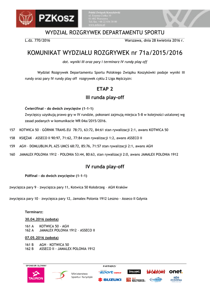 Polski Związek Koszykówki ul. Erazma Ciołka 10 01-402 Warszawa Tel./fax. +48 22 836 38 00 www.pzkosz.pl WYDZIAŁ ROZGRYWEK DEPARTAMENTU SPORTU Polski Związek Koszykówki _______________________________________________________________________________________________________________________________________________________ L.dz. 770/2016 ul. Erazma Ciołka 10, 01-402 Warszawa Warszawa, Tel./fax. +48 22 836 38 00, www.pzkosz.pl, [email protected] NIP: 527-20-43-457, REGON: 000866604, KRS: 0000033466 dnia 28 kwietnia 2016 r. KOMUNIKAT WYDZIAŁU ROZGRYWEK nr 71a/2015/2016 dot. wyniki III oraz pary i terminarz IV rundy play off Wydział Rozgrywek Departamentu Sportu Polskiego Związku Koszykówki podaje wyniki III rundy oraz pary IV rundy play off rozgrywek cyklu 2 Liga Mężczyzn: ETAP 2 III runda play-off Ćwierćfinał – do dwóch zwycięstw (1-1-1) Zwycięzcy uzyskują prawo gry w IV rundzie, pokonani zajmują miejsca 5-8 w kolejności ustalonej wg zasad podanych w komunikacie WR 04a/2015/2016. 157 KOTWICA 50 – GÓRNIK TRANS.EU 78:73, 63:72, 84:61 stan rywalizacji 2:1, awans KOTWICA 50 158 KSIĘŻAK – ASSECO II 90:97, 71:62, 77:84 stan rywalizacji 1:2, awans ASSECO II 159 AGH – DOMLUBLIN.PL AZS UMCS 68:72, 85:76, 71:57 stan rywalizacji 2:1, awans AGH 160 JAMALEX POLONIA 1912 – POLONIA 53:44, 80:63, stan rywalizacji 2:0, awans JAMALEX POLONIA 1912 IV runda play-off Półfinał – do dwóch zwycięstw (1-1-1) zwycięzca pary 9 – zwycięzca pary 11, Kotwica 50 Kołobrzeg – AGH Kraków zwycięzca pary 10 – zwycięzca pary 12, Jamalex Polonia 1912 Leszno - Asseco II Gdynia Terminarz: 30.04.2016 (sobota) 161 A 162 A KOTWICA 50 - AGH JAMALEX POLONIA 1912 – ASSECO II 07.05.2016 (sobota) 161 B 162 B AGH – KOTWICA 50 ASSECO II - JAMALEX POLONIA 1912 Polski Związek Koszykówki ul. Erazma Ciołka 10 01-402 Warszawa Tel./fax. +48 22 836 38 00 www.pzkosz.pl WYDZIAŁ ROZGRYWEK DEPARTAMENTU SPORTU Polski Związek Koszykówki _______________________________________________________________________________________________________________________________________________________ ew. 11.05.2016 (środa) 161 C 162 C ul. Erazma Ciołka 10, 01-402 Warszawa Tel./fax. +48 22 836 38 00, www.pzkosz.pl, [email protected] NIP: 527-20-43-457, REGON: 000866604, KRS: 0000033466 KOTWICA 50 - AGH JAMALEX POLONIA 1912 – ASSECO II UWAGA! O rozstawieniu w rywalizacji play-off (przewaga własnego boiska) oraz o kolejności końcowej po odpadnięciu w określonej rundzie, decydują kolejno: 1. Wyższe miejsce w tabeli końcowej Etapu 1 2. Większa liczba punktów meczowych w tabeli końcowej Etapu 1 3. Lepsza różnica punktów koszowych w tabeli końcowej Etapu 1 4. Większa liczba zdobytych punktów koszowych w tabeli końcowej Etapu 1 5. Losowanie. Końcowa kolejność na miejscach 5-48: 5. KS Księżak Łowicz 6. KK Polonia Bytom 7. Górnik Trans.eu Wałbrzych 8. domlublin.pl AZS UMCS Lublin 9. MCKiS Jaworzno 10. RKKS Rawia Rawag Rawicz 11. AZS UMK Consus PBDI Toruń 12. AZS Uniwersytet Łódzki Szkoła Gortata Łódź 13. MCS Daniel Gimbaskets 2 Przemyśl 14. Zagłębie Sosnowiec 15. Muszkieterowie Nowa Sól 16. Decka Pelplin 17. MKS Sokół Marbo Międzychód 18. Politechnika Gdańska 19. Alba Chorzów 20. KS Shmoolky Warszawa 21. KS Sudety Jelenia Góra 22. OKK Sokół Ostrów Mazowiecka 23. KS AZS PŚ Gliwice 24. Domino Inowrocław 25. KK Warszawa 26. WKK Wrocław 27. AZS Politechnika Częstochowa 28. Trefl II Sopot 29. MKS Start SA II Lublin 30. KS Pogoń Ruda Śląska 31. AZS Politechnika Poznań 32. BC Obra Kościan 33. ZKS Stal Stalowa Wola 34. KK Oleśnica 35. TS Wisła Kraków 36. KS Basket Piła 37. AZS AWF Mickiewicz Romus II Katowice 38. TKM Włocławek 39. KKS Tur Basket Bielsk Podlaski 40. MKS Otmuchów 41. KS MOSiR Cieszyn (spadek do 3LM) 42. SMS PZKosz Władysławowo (spadek do 3LM) 43. Rosa Sport Radom (spadek do 3LM) 44. Röben Gimbasket Wrocław (spadek do 3LM) 45. Itago Gdynia (spadek do 3LM) 46. Sklep Polski MKK Gniezno (spadek do 3LM) 47. Polonia Warszawa (spadek do 3LM) 48. MKS II Dąbrowa Górnicza (spadek do 3LM) UWAGA! Zgodnie z zapisami Regulaminu Cyklu 2LM mecze play-off muszą się odbyć w terminie wyznaczonym. W przypadku trudności, prosimy o natychmiastowy kontakt z WR DS PZKosz. Otrzymują: Wojewódzkie Związki Koszykówki Zainteresowane kluby Wydział Szkolenia Departamentu Sportu PZKosz Pełnomocnik Zarządu ds. Komisarzy Przewodniczący Komisji Rozgrywek Kolegium Sędziów PZKosz Redakcja PZKosz.pl