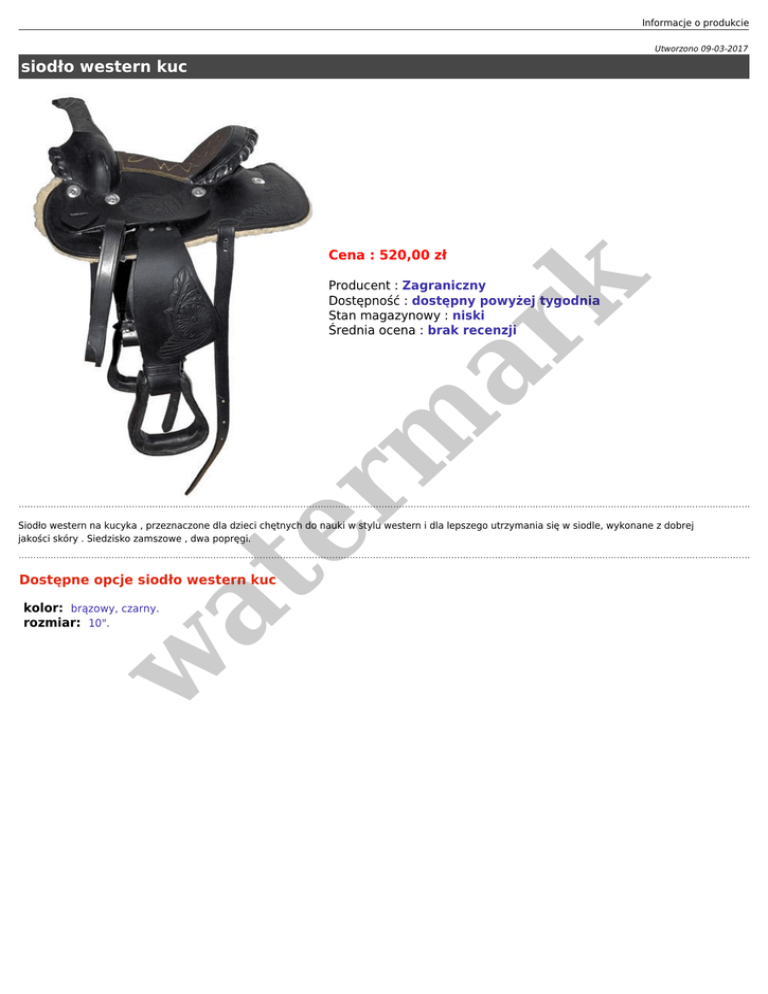Informacje o produkcie Utworzono 09-03-2017 siodło western kuc Cena : 520,00 zł er m ar k Producent : Zagraniczny Dostępność : dostępny powyżej tygodnia Stan magazynowy : niski Średnia ocena : brak recenzji Siodło western na kucyka , przeznaczone dla dzieci chętnych do nauki w stylu western i dla lepszego utrzymania się w siodle, wykonane z dobrej jakości skóry . Siedzisko zamszowe , dwa popręgi. at Dostępne opcje siodło western kuc w kolor: brązowy, czarny. rozmiar: 10".