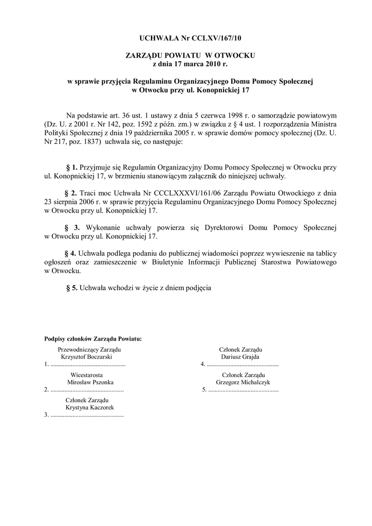 UCHWAŁA Nr CCLXV/167/10 ZARZĄDU POWIATU W OTWOCKU z dnia 17 marca 2010 r. w sprawie przyjęcia Regulaminu Organizacyjnego Domu Pomocy Społecznej w Otwocku przy ul. Konopnickiej 17 Na podstawie art. 36 ust. 1 ustawy z dnia 5 czerwca 1998 r. o samorządzie powiatowym (Dz. U. z 2001 r. Nr 142, poz. 1592 z późn. zm.) w związku z § 4 ust. 1 rozporządzenia Ministra Polityki Społecznej z dnia 19 października 2005 r. w sprawie domów pomocy społecznej (Dz. U. Nr 217, poz. 1837) uchwala się, co następuje: § 1. Przyjmuje się Regulamin Organizacyjny Domu Pomocy Społecznej w Otwocku przy ul. Konopnickiej 17, w brzmieniu stanowiącym załącznik do niniejszej uchwały. § 2. Traci moc Uchwała Nr CCCLXXXVI/161/06 Zarządu Powiatu Otwockiego z dnia 23 sierpnia 2006 r. w sprawie przyjęcia Regulaminu Organizacyjnego Domu Pomocy Społecznej w Otwocku przy ul. Konopnickiej 17. § 3. Wykonanie uchwały powierza się Dyrektorowi Domu Pomocy Społecznej w Otwocku przy ul. Konopnickiej 17. § 4. Uchwała podlega podaniu do publicznej wiadomości poprzez wywieszenie na tablicy ogłoszeń oraz zamieszczenie w Biuletynie Informacji Publicznej Starostwa Powiatowego w Otwocku. § 5. Uchwała wchodzi w Ŝycie z dniem podjęcia Podpisy członków Zarządu Powiatu: Przewodniczący Zarządu Krzysztof Boczarski 1. ................................................ Członek Zarządu Dariusz Grajda 4. .............................................. Wicestarosta Mirosław Pszonka 2. ............................................... Członek Zarządu Grzegorz Michalczyk 5. ............................................. Członek Zarządu Krystyna Kaczorek 3. ............................................... Załącznik do uchwały Nr CCLXV/167/10 Zarządu Powiatu w Otwocku z dnia 17.03.2010 r. REGULAMIN ORGANIZACYJNY DOMU POMOCY SPOŁECZNEJ W OTWOCKU PRZY UL. KONOPNICKIEJ 17 Rozdział I. POSTANOWIENIA WSTĘPNE §1. Dom Pomocy Społecznej w Otwocku przy ul. Konopnickiej 17, zwany dalej Domem, działa na podstawie obowiązujących przepisów prawa oraz Statutu Domu nadanego Uchwałą Nr 245/XXXVI/09 Rady Powiatu w Otwocku z dnia 10 grudnia 2009r. oraz niniejszego Regulaminu. Rozdział. II. POSTANOWIENIA OGÓLNE § 2. Nazwa Domu w pełnym brzmieniu: Dom Pomocy Społecznej ul. Konopnickiej 17 05-400 Otwock § 3. 1. Bezpośredni nadzór nad Domem sprawuje Starosta Otwocki przy pomocy Powiatowego Centrum Pomocy Rodzinie w Otwocku. 2. Nadzór nad przestrzeganiem standardu usług świadczonych przez Dom, a takŜe zgodnością zatrudnienia pracowników z wymaganiami kwalifikacyjnymi sprawuje Wojewoda Mazowiecki. 1. 2. 3. 4. 5. § 4. Dom Pomocy Społecznej w Otwocku przy ul. Konopnickiej 17 jest przeznaczony dla osób dorosłych niepełnosprawnych intelektualnie oraz dzieci i młodzieŜy niepełnosprawnych intelektualnie. Dom dysponuje 35 miejscami. Podstawowe zadania Domu określa statut. Dom świadczy usługi bytowe, opiekuńcze i wspomagające na poziomie obowiązującego standardu, w zakresie i formach wynikających z indywidualnych potrzeb mieszkańców. Organizacja Domu oraz zakres i poziom świadczonych usług uwzględnia w szczególności wolność, intymność, godność i poczucie bezpieczeństwa mieszkańców oraz stopień ich fizycznej i psychicznej sprawności. Rozdział III. ORGANY DOMU § 5. Domem kieruje dyrektor. Zadania i kompetencje dyrektora określa statut. Dyrektor zobowiązany jest do realizacji uchwał i zarządzeń organu prowadzącego Dom. Dyrektor w miarę potrzeby moŜe wydawać wewnętrzne regulacje prawne dotyczące działalności Domu w formie zarządzeń własnych. 5. Dyrektor w wykonywaniu swoich zadań współpracuje ze wszystkimi pracownikami Domu. 1. 2. 3. 4. Rozdział IV. ZASADY DZIALANIA I ORGANIZACJA DOMU § 6. 1. Decyzję o skierowaniu do Domu i decyzję ustalającą opłatę za pobyt w Domu wydaje organ gminy właściwej dla tej osoby w dniu jej kierowania do domu pomocy społecznej. 2. W przypadku osób kierowanych do Domu na podstawie postanowienia sądu, ośrodek pomocy społecznej kompletuje dokumenty w terminie nieprzekraczającym trzech miesięcy od dnia wydania skierowania do Domu i przekazuje do Powiatowego Centrum Pomocy Rodzinie w Otwocku. 3. Do Domu kieruje się na czas nieokreślony chyba, Ŝe osoba kierowana lub jej przedstawiciel ustawowy wystąpi z wnioskiem o skierowanie do Domu na czas określony. 4. Decyzję o umieszczeniu w Domu wydaje Starosta Otwocki lub osoba działająca z jego upowaŜnienia, w porozumieniu z dyrektorem Domu. 5. Przed przyjęciem osoby do Domu pracownik socjalny ustala aktualną sytuację w miejscu zamieszkania lub pobytu tej osoby, która stanowi podstawę opracowania indywidualnego planu wsparcia po przyjęciu tej osoby do Domu. 6. Dyrektor Domu zawiadamia pisemnie osobę ubiegającą się lub jej przedstawiciela ustawowego o terminie przyjęcia do Domu. 7. Osobę, która przybyła do Domu przyjmuje dyrektor lub osoba przez niego wyznaczona. 8. W trakcie przyjmowania osoby do Domu dyrektor lub osoba przyjmująca przeprowadza rozmowę z osobą przyjmowaną lub jej przedstawicielem ustawowym, podczas której ustala jej aktualną sytuację, odnotowuje zmiany zaistniałe w jej sytuacji od momentu złoŜenia wniosku o skierowanie do domu pomocy społecznej oraz ustala wstępne warunki pobytu, a takŜe informuje o zakresie usług świadczonych przez Dom. 9. O przyjęciu do Domu osoby skierowanej, dyrektor niezwłocznie powiadamia Powiatowe Centrum Pomocy Rodzinie w Otwocku. Rozdział V. STANDARDY USŁUG ŚWIADCZONYCH PRZEZ DOM § 7. Celem Domu jest zapewnienie mieszkańcom całodobowej opieki, bezpiecznego i godnego Ŝycia, intymności oraz niezaleŜności. § 8. Dom świadczy mieszkańcom następujące usługi: 1. w zakresie potrzeb bytowych Dom zapewnia: 1) miejsce zamieszkania wyposaŜone zgodnie z obowiązującymi standardami, 2) wyŜywienie w ramach obowiązujących norm Ŝywieniowych, dostosowane do wskazań lekarza, 3) odzieŜ i obuwie, 4) ut