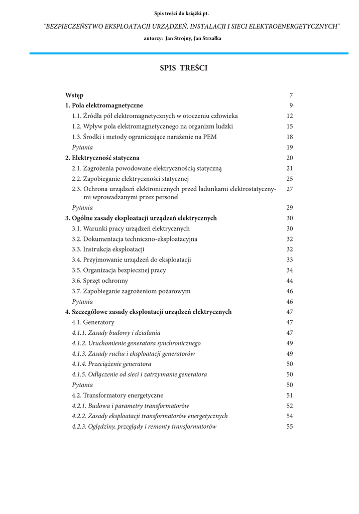 Spis treści do książki pt. "BEZPIECZEŃSTWO EKSPLOATACJI URZĄDZEŃ, INSTALACJI I SIECI ELEKTROENERGETYCZNYCH" autorzy: Jan Strojny, Jan Strzałka SPIS TREŚCI Wstęp 7 1. Pola elektromagnetyczne 9 1.1. Źródła pół elektromagnetycznych w otoczeniu człowieka 12 1.2. Wpływ pola elektromagnetycznego na organizm ludzki 15 1.3. Środki i metody ograniczające narażenie na PEM 18 Pytania 19 2. Elektryczność statyczna 20 2.1. Zagrożenia powodowane elektrycznością statyczną 21 2.2. Zapobieganie elektryczności statycznej 25 2.3. Ochrona urządzeń elektronicznych przed ładunkami elektrostatycznymi wprowadzanymi przez personel 27 Pytania 29 3. Ogólne zasady eksploatacji urządzeń elektrycznych 30 3.1. Warunki pracy urządzeń elektrycznych 30 3.2. Dokumentacja techniczno-eksploatacyjna 32 3.3. Instrukcja eksploatacji 32 3.4. Przyjmowanie urządzeń do eksploatacji 33 3.5. Organizacja bezpiecznej pracy 34 3.6. Sprzęt ochronny 44 3.7. Zapobieganie zagrożeniom pożarowym 46 Pytania 46 4. Szczegółowe zasady eksploatacji urządzeń elektrycznych 47 4.1. Generatory 47 4.1.1. Zasady budowy i działania 47 4.1.2. Uruchomienie generatora synchronicznego 49 4.1.3. Zasady ruchu i eksploatacji generatorów 49 4.1.4. Przeciążenie generatora 50 4.1.5. Odłączenie od sieci i zatrzymanie generatora 50 Pytania 50 4.2. Transformatory energetyczne 51 4.2.1. Budowa i parametry transformatorów 52 4.2.2. Zasady eksploatacji transformatorów energetycznych 54 4.2.3. Oględziny, przeglądy i remonty transformatorów 55 Bezpieczeństwo eksploatacji urządzeń, instalacji i sieci elektroenergetycznych 4.2.4. Postępowanie w przypadku awarii i zakłóceń 55 4.2.5. Zakres badań eksploatacyjnych transformatorów energetycznych 56 Pytania 56 4.3. Stacje elektroenergetyczne 56 4.3.1. Podział stacji ze względu na warunki eksploatacji 57 4.3.2. Czynności łączeniowe 58 4.3.3. Urządzenia zawierające sześciofluorek siarki SF6 59 Pytania 60 4.4. Sieci napowietrzne 60 4.4.1. Wymagania dotyczące montażu linii napowietrznych 62 4.4.2. Zasady eksploatacji linii napowietrznych 62 4.4.3. Zakres badań eksploatacyjnych linii napowietrznych 64 Pytania 65 4.5. Linie kablowe 65 Pytania 67 4.6. Instalacje elektryczne 67 4.6.1. Uklady sieciowe 69 4.6.2. Zasady doboru i układania przewodów w instalacjach 70 4.6.3. Dobór zabezpieczeń przewodów 72 4.6.4. Wymagania dotyczące wyposażenia instalacji 73 4.6.5. Zasady eksploatacji instalacji elektrycznych 74 Pytania 77 4.7. Baterie kondensatorów do kompensacji mocy biernej 77 4.7.1. Zastosowanie i budowa kondensatorów elektroenergetycznych 77 4.7.2. Zasady eksploatacji baterii kondensatorów 78 Pytania 79 4.8. Elektryczne urządzenia napędowe 79 4.8.1. Rozruch i regulacja prędkości silników asynchronicznych 82 4.8.2. Dobór silników do warunków 83 4.8.3. Zabezpieczenia silników 84 4.8.4. Zasady eksploatacji silników 85 4.8.5. Oględziny, przeglądy i remonty urządzeń napędowych 86 Pytania 87 4.9. Urządzenia oświetleniowe 87 Pytania 91 Bezpieczeństwo eksploatacji urządzeń, instalacji i sieci elektroenergetycznych 4.10. Urządzenia elektrotermiczne 91 4.10.1. Budowa i zasada działania wybranych urządzeń elektrotermicznych 92 4.10.1.1. Urządzenia reyzstancyjne (oporowe) 92 4.10.1.2. Urządzenia elektrodowe 92 4.10.1.3. Urządzenia łukowe 93 4.10.1.4. Urządzenia indukcyjne 93 4.10.2. Pomiary i regulacja temperatury w urządzeniach elektrotermicznych 94 4.10.3. Zasady eksploatacji urządzeń elektrotermicznych 94 4.10.4. Oględziny, przeglądy i remonty urządzeń elektrotermicznych 95 Pytania 96 4.11. Zespoły prądotwórcze 96 4.11.1. Ogólne zasady eksploatacji 96 4.11.2. Uruchomienie i zatrzymywanie zespołu prądotwórczego 97 Pytania 97 4.12. Elektrofiltry 97 4.12.1. Wymagania dotyczące instalacji 98 4.12.2. Zasady eksploatacji elektrofiltrów 99 Pytania 100 4.13. Urządzenia prostownikowe i akumulatory 100 4.13.1. Rodzaje i charakterystyka akumulatorów 102 4.13.2. Zasady eksploatacji urządzeń prostownikowych i akumulatorów 104 4.13.3. Oględziny i przeglądy urządzeń prostownikowych i akumulatorów 105 4.13.4. Ocena wyników pomiarów urządzeń prostownikowych i akumulatorów 106 Pytania 107 4.14. Urządzenia energoelektroniczne 107 4.14.1. Budowa i właściwości urządzeń energoelektronicznych 108 4.14.2. Zabezpieczenia przetężeniowe i ziemnozwarciowe urządzeń energoelektronicznych 109 4.14.3. Ochrona przeciwporażeniowa w urządzeniach energoelektronicznych 110 4.14.4. Zasady eksploatacji urządzeń energoelektronicznych 111 4.14.5. Oględziny, przeglądy i remonty urządzeń energoelektronicznych 112 4.14.6. Zakres badań eksploatacyjnych urządzeń energoelektronicznych 113 Pytania 114 4.15. Urządzenia spawalnicze 114 Pytania 116 5 Bezpieczeństwo eksploatacji urządzeń, instalacji i sieci elektroenergetycznych 5. Zasady stosowania urządzeń elektrycznych w strefach zagrożonych wybuchem 117 5.1. Klasyfikacja przestrzeni i stref zagrożenia 117 5.2. Zasady budowy i doboru urządzeń elektrycznych do pracy w warunkach zagrożenia wybuchem 118 5.3. Zasady eksploatacji urządzeń elektrycznych w warunkach zagrożenia wybuchowego 120 Pytania 120 6. Ochrona odgromowa i przeciwprzepięciowa 121 6.1. Rodzaje i charakterystyka przepięć 121 6.2. Zasady ochrony odgromowej obiektów budowlanych 121 6.3. Zasady ochrony przeciwprzepięciowej 123 Pytania 126 7. Ochrona przeciwporażeniowa 127 7.1. Działanie prądu elektrycznego na człowieka 127 7.2. Zagrożenia porażeniowe i statystyka porażeń prądem 128 7.3. Organizacyjne środki ochrony przeciwporażeniowej 128 7.4. Techniczne środki ochrony przeciwporażeniowej 129 7.4.1. Ochrona przeciwporażeniowa w urządzeniach o napięciu do 1 kV 129 7.4.1.1. Ochrona podstawowa (przed dotykiem bezpośrednim) 130 7.4.1.2. Ochrona przy uszkodzeniu (przy dotyku pośrednim) 132 7.4.2. Ochrona przeciwporażeniowa w urządzeniach o napięciu powyżej 1 kV 141 7.5. Przewody ochronn