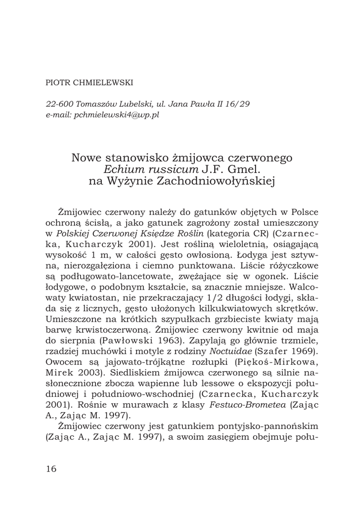 PIOTR CHMIELEWSKI 22-600 Tomaszów Lubelski, ul. Jana Pawła II 16/29 e-mail: [email protected] Nowe stanowisko żmijowca czerwonego Echium russicum J.F. Gmel. na Wyżynie Zachodniowołyńskiej Żmijowiec czerwony należy do gatunków objętych w Polsce ochroną ścisłą, a jako gatunek zagrożony został umieszczony w Polskiej Czerwonej Księdze Roślin (kategoria CR) (Czarnecka, Kucharczyk 2001). Jest rośliną wieloletnią, osiągającą wysokość 1 m, w całości gęsto owłosioną. Łodyga jest sztywna, nierozgałęziona i ciemno punktowana. Liście różyczkowe są podługowato-lancetowate, zwężające się w ogonek. Liście łodygowe, o podobnym kształcie, są znacznie mniejsze. Walcowaty kwiatostan, nie przekraczający 1/2 długości łodygi, składa się z licznych, gęsto ułożonych kilkukwiatowych skrętków. Umieszczone na krótkich szypułkach grzbieciste kwiaty mają barwę krwistoczerwoną. Żmijowiec czerwony kwitnie od maja do sierpnia (Pawłowski 1963). Zapylają go głównie trzmiele, rzadziej muchówki i motyle z rodziny Noctuidae (Szafer 1969). Owocem są jajowato-trójkątne rozłupki (Piękoś-Mirkowa, Mirek 2003). Siedliskiem żmijowca czerwonego są silnie nasłonecznione zbocza wapienne lub lessowe o ekspozycji południowej i południowo-wschodniej (Czarnecka, Kucharczyk 2001). Rośnie w murawach z klasy Festuco-Brometea (Zając A., Zając M. 1997). Żmijowiec czerwony jest gatunkiem pontyjsko-pannońskim (Zając A., Zając M. 1997), a swoim zasięgiem obejmuje połu16 dniowo-wschodnią Europę od Moraw i Austrii po południową i środkową Rosję. Ponadto występuje w Turcji (góry Taurus), na Kaukazie i w północnej Armenii (Hegi 1975). Polskie stanowiska żmijowca czerwonego znajdują się na północno-zachodniej granicy zasięgu tego gatunku. Podawano go z 16 stanowisk w obrębie Wyżyny Lubelskiej i Wyżyny Zachodniowołyńskiej (Czarnecka, Kucharczyk 2001). Po 1980 r. potwierdzono zaledwie 2 z nich: w rezerwacie częściowym „Skarpa Dobużańska” w Dobużku koło Łaszczowa oraz na zboczach doliny Bugu nieopodal Czumowa, chronionych jako pomnik przyrody (Kucharczyk, Wójciak 1995, Czarnecka, Kucharczyk 2001). Na stanowisku objętym ochroną rezerwatową obserwowano w 2001 r. łącznie 22 osobniki żmijowca czerwonego, w tym jedynie 6 z kwitnącymi pędami. W Czumowie stwierdzono w 1996 r. 52 osobniki tego gatunku, z czego 15 zakwitło (Czarnecka, Kucharczyk 2001). Na liczebność żmijowca na stanowisku w dolinie Bugu wpłynął fakt, że w 1993 r. uzupełniono populację osobnikami pochodzącymi z uprawy w Ogrodzie Botanicznym UMCS w Lublinie (Dąbrowska i in. 1997). W czerwcu 2006 r. odkryto nowe stanowisko żmijowca czerwonego nieopodal wsi Posadów koło Łaszczowa (kwadrat ATPOL GF 07) w obrębie Grzędy Sokalskiej na Wyżynie Zachodniowołyńskiej. Stanowisko znajduje się w odległości ok. 12 km od najbliższej populacji na „Skarpie Dobużańskiej”. Opisywany gatunek zasiedla strome lessowe zbocze doliny rzeki Kamionki, znajdujące się po wschodniej stronie szosy Posadów–Telatyn. Zaobserwowano jeden kwitnący okaz rosnący w murawie kserotermicznej o powierzchni ok. 0,5 ha, należącej do zespołu Thalictro-Salvietum pratensis. Działka gruntowa porośnięta wspomnianą murawą jest własnością prywatną. Żmijowcowi towarzyszą inne, rzadkie i chronione gatunki roślin: goryczka krzyżowa Gentiana cruciata i pierwiosnka lekarska Primula veris. Ponadto występują tutaj: szałwia łąkowa Salvia pratensis, rutewka mniejsza Thalictrum minus, kostrzewa bruzdkowana Festuca rupicola, wilczomlecz sosnka Euphorbia cyparissias, lucerna sierpowata Medicago falcata, żebrzyca roczna Seseli annuum oraz perz siny Elymus hispidus i in. (Chmielewski P., Cymbała R., Michalczuk J., Michalczuk W., mat. niepubl.). 17 Pomimo poszukiwań autorowi nie udało się odnaleźć innych okazów żmijowca. Przeczesywanie murawy utrudniał wysoki stopień jej zwarcia, który w przyszłości może przyczynić się do wytworzenia tzw. wojłoku stepowego i zaniku interesujących gatunków flory. Groźny dla populacji żmijowca czerwonego może być również spływ środków ochrony roślin oraz nawozów z sąsiadujących ze zboczem pól uprawnych. W związku z powyższym, zalecane jest objęcie muraw kserotermicznych w dolinie Kamionki ochroną w formie użytku ekologicznego i ich regularne koszenie. Wniosek o utworzenie użytku ekologicznego jest w fazie przygotowań. Podziękowania Dziękuję Pani dr Renacie Piwowarczyk za cenne uwagi do powyższego artykułu i pomoc w oznaczeniu gatunków towarzyszących. SUMMARY A new locality of Echium russicum J.F. Gmel in the Wyżyna Zachodniowołyńka Upland (E Poland) Echium russicum is a protected species classified as critically endangered (CR) in the Polish Red Data Book. It has become extinct in 14 localities in Wyżyna Lubelska Upland and Wyżyna Zachodniowołyńska Upland. Only 2 localities have persisted: the „Skarpa Dobużańska” nature reserve near Dobużek (50o34’ N, 23o44’ E), and the protected steppe slope near Czumów (50o46’ N, 23o58’ E), both in the Bug river valley. Echium russicum grows in thermophilous grasslands of Festuco-Brometea class. In June 2006 a new locality of this species was discovered close to Posadów village (50o30’ N, 23o50’ E; ATPOL GF 07), which is located 12 km SE from the nearest population in the „Skarpa Dobużańska” reserve. It grows in ThalictroSalvietum pratensis plant association on a steep loess slope of the Kamionka stream together with other protected, rare, and noteworthy plants: Gentiana cruciata, Primula veris, Salvia pratensis, Thalictrum minus, Festuca rupicola, Euphorbia cyparissias, Medicago falcata, Seseli annuum, and Elymus hispidus. Only one flowering plant of 18 E. russicum has been found. The increasing plant density in this slope and the use of pesticides and herbicides in nearby fields pose threat to the thermophilous grassland. Ther
