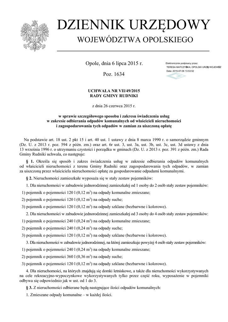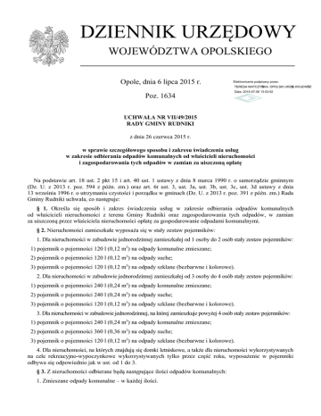 DZIENNIK URZĘDOWY WOJEWÓDZTWA OPOLSKIEGO Opole, dnia 6 lipca 2015 r. Elektronicznie podpisany przez: TERESA MATCZYŃSKA; OPOLSKI URZĄD WOJEWÓDZKI Poz. 1634 Data: 2015-07-06 13:53:52 UCHWAŁA NR VII/49/2015 RADY GMINY RUDNIKI z dnia 26 czerwca 2015 r. w sprawie szczegółowego sposobu i zakresu świadczenia usług w zakresie odbierania odpadów komunalnych od właścicieli nieruchomości i zagospodarowania tych odpadów w zamian za uiszczoną opłatę Na podstawie art. 18 ust. 2 pkt 15 i art. 40 ust. 1 ustawy z dnia 8 marca 1990 r. o samorządzie gminnym (Dz. U. z 2013 r. poz. 594 z późn. zm.) oraz art. 6r ust. 3, ust. 3a, ust. 3b, ust. 3c, ust. 3d ustawy z dnia 13 września 1996 r. o utrzymaniu czystości i porządku w gminach (Dz. U. z 2013 r. poz. 391 z późn. zm.) Rada Gminy Rudniki uchwala, co następuje: § 1. Określa się sposób i zakres świadczenia usług w zakresie odbierania odpadów komunalnych od właścicieli nieruchomości z terenu Gminy Rudniki oraz zagospodarowania tych odpadów, w zamian za uiszczoną przez właściciela nieruchomości opłatę za gospodarowanie odpadami komunalnymi. § 2. Nieruchomości zamieszkałe wyposaża się w stały zestaw pojemników: 1. Dla nieruchomości w zabudowie jednorodzinnej zamieszkałej od 1 osoby do 2 osób stały zestaw pojemników: 1) pojemnik o pojemności 120 l (0,12 m3) na odpady komunalne zmieszane; 2) pojemnik o pojemności 120 l (0,12 m3) na odpady suche; 3) pojemnik o pojemności 120 l (0,12 m3) na odpady szklane (bezbarwne i kolorowe). 2. Dla nieruchomości w zabudowie jednorodzinnej zamieszkałej od 3 osoby do 4 osób stały zestaw pojemników: 1) pojemnik o pojemności 240 l (0,24 m3) na odpady komunalne zmieszane; 2) pojemnik o pojemności 240 l (0,24 m3) na odpady suche; 3) pojemnik o pojemności 120 l (0,12 m3) na odpady szklane (bezbarwne i kolorowe). 3. Dla nieruchomości w zabudowie jednorodzinnej, na której zamieszkuje powyżej 4 osób stały zestaw pojemników: 1) pojemnik o pojemności 240 l (0,24 m3) na odpady komunalne zmieszane; 2) pojemnik o pojemności 360 l (0,36 m3) na odpady suche; 3) pojemnik o pojemności 120 l (0,12 m3) na odpady szklane (bezbarwne i kolorowe). 4. Dla nieruchomości, na których znajdują się domki letniskowe, a także dla nieruchomości wykorzystywanych na cele rekreacyjno-wypoczynkowe wykorzystywanych tylko przez część roku, wyposażenie w pojemniki odbywa się odpowiednio jak w ust. od 1 do 3. § 3. Z nieruchomości odbierane będą następujące ilości odpadów komunalnych: 1. Zmieszane odpady komunalne – w każdej ilości. Dziennik Urzędowy Województwa Opolskiego –2– Poz. 1634 2. Odpady z selektywnej zbiórki – w każdej ilości, w tym: 1) szkło; 2) papier i tekturę, opakowania wielomateriałowe, tworzywa sztuczne, metal- zbierane łącznie. 3. Meble i inne odpady wielkogabarytowe, zużyty sprzęt elektryczny i elektroniczny – w każdej ilości; zużyte opony samochodowe w limicie do 4 szt. rocznie. § 4.1. Zmieszane odpady komunalne odbierane są z nieruchomości z częstotliwością raz w miesiącu. 2. Selektywnie zebrane odpady z podziałem na: 1) szkło – raz w kwartale; 2) zebrane łącznie odpady z tworzywa sztucznego, metalu i opakowania wielomateriałowe, papier i tektura – raz w miesiącu; 3) meble i inne odpady wielkogabarytowe, zużyty sprzęt elektryczny i elektroniczny, zużyte opony odbierane są dwa razy w roku metodą „przy krawężniku”, zgodnie z harmonogramem odbioru; 4) gmina na stronie internetowej Urzędu Gminy Rudniki oraz w sposób zwyczajowo przyjęty opublikuje harmonogram odbioru odpadów komunalnych z uwzględnieniem częstotliwości określonej w uchwale. § 5.1. Do Punktu Selektywnego Zbierania Odpadów Komunalnych można przekazać w ramach uiszczonej opłaty odpady komunalne zebrane w sposób selektywny, w tym: 1) papier i tektura (w tym opakowania, gazety, czasopisma, itp.); 2) metale; 3) tworzywa sztuczne; 4) opakowania wielomateriałowe; 5) szkło (w tym opakowaniowe szkło bezbarwne i kolorowe); 6) odpady zielone; 7) przeterminowane leki; 8) chemikalia (farby, rozpuszczalniki, oleje odpadowe); 9) zużyte baterie i akumulatory; 10) zużyty sprzęt elektryczny i elektroniczny; 11) meble i inne odpady wielkogabarytowe; 12) odpady budowlano-rozbiórkowe w ilości do 1,5 m3 od nieruchomości, za którą została uiszczona opłata w ciągu roku; 13) zużyte opony (wyłącznie od samochodów osobowych). 2. Transport odpadów do Punktu Selektywnego Zbierania Odpadów Komunalnych (PSZOK) mieszkańcy zapewniają we własnym zakresie i na własny koszt. 3. Regulamin korzystania z Punktu Selektywnego Zbierania Odpadów Komunalnych (PSZOK) zlokalizowanego w Rudnikach, ul. Dąbrówka 6, stanowiący załącznik nr 1 do uchwały określa zasady przyjmowania odpadów oraz dni i godziny otwarcia. § 6. W przypadku niewłaściwego świadczenia usług przez odbierającego odpady komunalne od właścicieli lub przez prowadzącego punkt selektywnego zbierania odpadów komunalnych – należy: 1. Zgłosić niezwłocznie po stwierdzeniu takiego faktu, nie później jednak niż do 3 dni od dnia, w którym usługa została niewłaściwie wykonana. 2. Zgłoszenia należy kierować do Urzędu Gminy w Rudnikach, Referat Gospodarki Komunalnej, Rolnictwa i Ochrony Środowiska, ul. Wojska Polskiego 12A, 46-325 Rudniki, pok. nr 6 osobiście, telefonicznie na nr 34/3595 072 wew. 25, pisemnie za pośrednictwem poczty tradycyjnej lub elektronicznej na adres [email protected]. Dziennik Urzędowy Województwa Opolskiego –3– Poz. 1634 3. Wszystkie reklamacje rozpatruje się bez zbędnej zwłoki, nie później niż w terminie 30 dni. 4. Odpowiedź na złożoną reklamację zostanie przekazana w takiej formie w jakiej została złożona chyba, że składający reklamację określi inny sposób, w jaki ma być udzielona odpowiedź. § 7. Uchyla się uchwałę nr XXII/198/2013 Rady Gminy Rudniki z dnia 30 kwietnia 2013 r. § 8. Wykonanie uchwały p