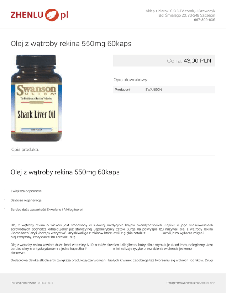 Sklep zielarski S.C S.Półtorak, J.Szewczyk Bol Śmiałego 23, 70-348 Szczecin 667-309-636 Olej z wątroby rekina 550mg 60kaps Cena: 43,00 PLN Opis słownikowy Producent SWANSON Opis produktu Olej z wątroby rekina 550mg 60kaps · Zwiększa odporność · Szybsza regeneracja · Bardzo duża zawartość Skwalenu i Alkilogliceroli Olej z wątroby rekina o wieków jest stosowany w ludowej medycynie krajów skandynawskich. Zapiski o jego właściwościach zdrowotnych pochodzą odnajdujemy już starożytnej Japoniirybacy zatoki Surga na półwyspie Izu nazywali olej z wątroby rekina „Samedawa” czyli „leczący wszystko”. Uzyskiwali go z rekinów które łowili z głębin zatoki #℣佐⌡⌀瀀漀渀愀搀 洀⌡⍃倣℣. Cenili je za wyborne mięso i olej z wątroby, który dawał im zdrowie i siłę. Olej z wątroby rekina zawiera duże ilości witaminy A i D, a także skwalen i alkiglicerol który silnie stymuluje układ immunologiczny. Jest bardzo silnym antyoksydantem a jedna kapsułka #℣佐⌡⌀漀搀瀀漀眀椀攀搀渀椀欀 䈀礁簀欀椀 琀爀愀渀甀⌡⍃倣℣ minimalizuje ryzyko przeziębienia w okresie jesienno zimowym. Dodatkowa dawka alkigliceroli zwiększa produkcję czerwonych i białych krwinek, zapobiega też tworzeniu się wolnych rodników. Drugi Plik wygenerowano: 09-03-2017 Oprogramowanie sklepu: AptusShop Sklep zielarski S.C S.Półtorak, J.Szewczyk Bol Śmiałego 23, 70-348 Szczecin 667-309-636 związek, czyli skwalen, występuje w tkance tłuszczowej, komórkach skóry i tętnic. Substancja ta pomaga w produkcji przeciwciał i poprawia elastyczność skóry oraz wpływa na poprawę działania układu krążenia oraz układu nerwowego. Zawiera również kwasy omega-3 które regulują poziom cholesterolu oraz obniżają poziom trójglicerydów Wartość odżywcza Kalorie 1 kapsułka żelowa 2 kapsułki żelowe 10kcal/21kJ 20kcal/42kJ % realizacji dziennego zapotrzebowania RDA * 1g 550mg 2g 1100mg * * (120mg) (240mg) (100mg) (200mg) Tłuszcz ogółem ecoMarine™ Olej z wątroby rekina - Skwalen - Alkiloglicerole (z 225mg estrów diacylogliceroli - DAGE) Skład: Olej z wątroby rekina, żelatyna (otoczka kapsułki), gliceryna (substancja utrzymująca wilgotność), woda oczyszczona. SPOSÓB UŻYCIA: Jedna kapsułka 1-2 razy dziennie dziennie. Nie przekraczać zalecanej porcji do spożycia w ciągu dnia. Produkt nie może być stosowany jako substytut prawidłowo zróżnicowanej diety. Produkt niewskazany dla kobiet w ciąży i karmiących. PRZECHOWYWANIE: Przechowywać w temperaturze pokojowej, w sposób niedostępny dla małych dzieci. ecoMarine™ marka zastrzeżona przez firmę Marine Nutriceutical Corp. eksluzywnie licencjonowana dla firmy Swanson Health Producst Plik wygenerowano: 09-03-2017 Powered by TCPDF (www.tcpdf.org) Oprogramowanie sklepu: AptusShop