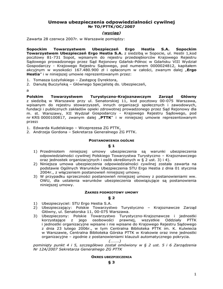 Umowa ubezpieczenia odpowiedzialności cywilnej Nr TO/PTTK/OC/2007 (wyciąg) Zawarta 28 czerwca 2007r. w Warszawie pomiędzy: Sopockim Towarzystwem Ubezpieczeń Ergo Hestia S.A. Sopockim Towarzystwem Ubezpieczeń Ergo Hestia S.A. z siedzibą w Sopocie, ul. Hestii 1,kod pocztowy 81-731 Sopot, wpisanym do rejestru przedsiębiorców Krajowego Rejestru Sądowego prowadzonego przez Sąd Rejonowy Gdańsk-Północ w Gdańsku VIII Wydział Gospodarczy - Krajowego Rejestru Sądowego, pod numerem 0000024812, kapitałem akcyjnym w wysokości 167.480.900 zł i opłaconym w całości, zwanym dalej „Ergo Hestia” i w niniejszej umowie reprezentowanym przez: 1. Tomasza Łożyńskiego – Zastępcę Dyrektora, 2. Danutę Buczyńską – Głównego Specjalistę ds. Ubezpieczeń, a Polskim Towarzystwem Turystyczno-Krajoznawczym Zarząd Główny z siedzibą w Warszawie przy ul. Senatorskiej 11, kod pocztowy 00-075 Warszawa, wpisanym do rejestru stowarzyszeń, innych organizacji społecznych i zawodowych, fundacji i publicznych zakładów opieki zdrowotnej prowadzonego przez Sąd Rejonowy dla m. st. Warszawy, XII Wydział Gospodarczy - Krajowego Rejestru Sądowego, pod nr KRS 0000100817, zwanym dalej „PTTK” i w niniejszej umowie reprezentowanym przez: 1. Edwarda Kudelskiego – Wiceprezesa ZG PTTK, 2. Andrzeja Gordona – Sekretarza Generalnego ZG PTTK. POSTANOWIENIA OGÓLNE §1 1) Przedmiotem niniejszej umowy ubezpieczenia są warunki ubezpieczenia odpowiedzialności cywilnej Polskiego Towarzystwa Turystyczno – Krajoznawczego oraz jednostek organizacyjnych i osób określonych w § 2 ust. 3) i 4). 2) Niniejsza umowa ubezpieczenia odpowiedzialności cywilnej została zawarta na podstawie Ogólnych Warunków Ubezpieczenia STU Ergo Hestia z dnia 01 stycznia 2004r., z włączeniem postanowień niniejszej umowy. 3) W przypadku sprzeczności postanowień niniejszej umowy z postanowieniami ww. OWU, dla ustalenia warunków ubezpieczenia obowiązujące są postanowienia niniejszej umowy. ZAKRES PODMIOTOWY UMOWY §2 1) 2) Ubezpieczyciel: STU Ergo Hestia S.A. Ubezpieczający: Polskie Towarzystwo Turystyczno – Krajoznawcze Zarząd Główny, ul. Senatorska 11, 00-075 Warszawa. 3) Ubezpieczony: Polskie Towarzystwo Turystyczno-Krajoznawcze i jednostki korzystające z jego osobowości prawnej, wszystkie Oddziały PTTK i jednostki organizacyjne wpisane i nie wpisane do Krajowego Rejestru Sądowego z dnia 23 lutego 2006r., w tym Centralna Biblioteka PTTK im. K. Kulwiecia w Warszawie, Centralna Biblioteka Górska PTTK w Krakowie oraz inne jednostki organizacyjne – zgodnie z postanowieniami klauzuli automatycznego pokrycia. (……..) pominięty punkt 4 i 5, szczegółowo został omówiony w § 2 ust. 5 i 6 Zarządzenia Nr 12A/2007 Sekretarza Generalnego ZG PTTK OKRES UBEZPIECZENIA §3 1 Umowa ubezpieczenia zostaje zawarta na okres od 01 lipca 2007r. do 31 marca 2008r. SKŁADKA UBEZPIECZENIOWA §4 (…ta część umowy objęta jest tajemnicą handlową, bez zgody STU Ergo Hestia SA nie może być udostępniana …) §5 Ubezpieczona działalność Strony postanawiają, że zakres ubezpieczenia obejmuje ryzyka wynikające z działalności prowadzonej przez podmioty określone w § 2 ust. 3) i 4), zgodnie ze statutem PTTK (tekst jednolity Statutu zgodnie z wpisem do KRS z dnia 23 lutego 2006r.), w tym odpowiedzialność wynikającą z wytyczania, znakowania i utrzymania szlaków turystycznych. §6 Suma gwarancyjna i limity odpowiedzialności 1) 2) Odpowiedzialności STU Ergo Hestia S.A. jest ograniczona do wysokości sumy gwarancyjnej (kwota objęta tajemnicą handlową) na jedno i wszystkie zdarzenia w okresie ubezpieczenia. W zakresie poszczególnych klauzul rozszerzających zakres ubezpieczenia odpowiedzialność STU Ergo Hestia limitowana jest zgodnie z postanowieniami niniejszej umowy określone w § 7 ust. 3). §7 Zakres ubezpieczenia 1) Zakres ubezpieczenia obejmuje odpowiedzialność cywilną (deliktową i kontraktową) Ubezpieczającego i/lub Ubezpieczonych za szkody osobowe i ich następstwa i rzeczowe oraz ich następstwa wyrządzone osobom trzecim w związku z prowadzeniem działalności, posiadaniem oraz użytkowaniem mienia z włączeniem odpowiedzialności za produkt oraz usługę. 2) Skreśla się postanowienia § 8 ust. 1 pkt. 7) OWU STU Ergo Hestia z dnia 01 stycznia (limit odpowiedzialności Ubezpieczyciela stanowi tajemnicę handlową, uwzględniany jest w relacjach pomiędzy Ubezpieczającym i Ubezpieczycielem). 3) Zakres ubezpieczenia rozszerzony został o następujące klauzule: a) Klauzula rozszerzająca zakres terytorialny ochrony ubezpieczeniowej (…….) (pominięto omówienia Klauzul, zamieszczonych w Zarządzeniu Nr 12A/2007) b) Klauzula odpowiedzialności cywilnej wzajemnej (……) c) Włączenie szkód w nieruchomościach osób trzecich (……) d) Włączenie szkód w rzeczach ruchomych osób trzecich e) Klauzula odpowiedzialności cywilnej pracodawcy f) Odpowiedzialność cywilna gastronomicznej (……..) z tytułu g) Odpowiedzialność cywilna hotelarza h) Klauzula odpowiedzialności cywilnej w mieniu osób trzecich (……..) i) (…….) (……..) prowadzenia działalności (……..) za szkody wyrządzone Klauzula odpowiedzialności cywilnej za szkody w pojazdach pozostawionych na parkingu strzeżonym wyrządzone (……..) 2 j) Klauzula odpowiedzialności cywilnej wynikającej z organizowania lub współorganizowania imprez nie mających charakteru imprezy masowej (……..) k) Szkody wyrządzone przez podwykonawców z zachowaniem prawa regresu do sprawcy szkody (……..) l) Klauzula automatycznego pokrycia nowo powstałych jednostek organizacyjnych: Ochroną ubezpieczeniową objęte będą wszystkie jednostki organizacyjne PTTK z chwilą powołania przez Zarząd Główny PTTK lub podjęcia działalności w zakresie zgodnym ze Statutem PTTK z dnia 23 lutego 2006 r. bez obowiązku zgłaszania powyższego faktu do ubezpieczyciela. m) n) (…….Klauzule objęte tajemnicą han