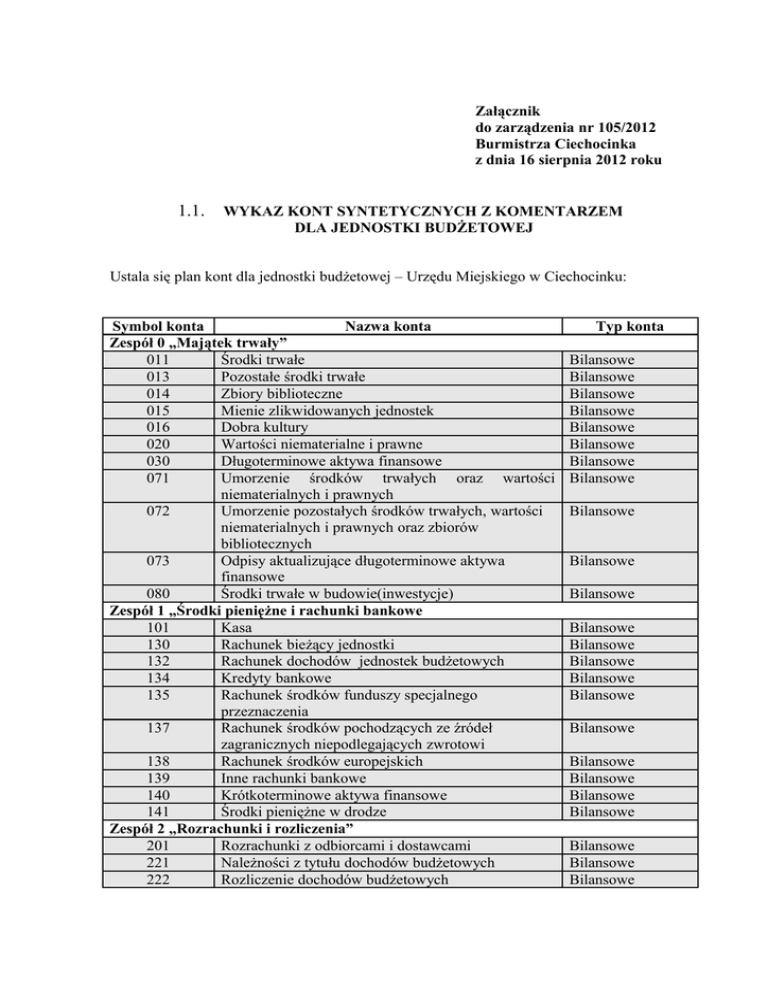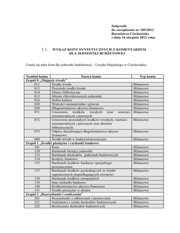 Załącznik do zarządzenia nr 105/2012 Burmistrza Ciechocinka z dnia 16 sierpnia 2012 roku 1.1. WYKAZ KONT SYNTETYCZNYCH Z KOMENTARZEM DLA JEDNOSTKI BUDŻETOWEJ Ustala się plan kont dla jednostki budżetowej – Urzędu Miejskiego w Ciechocinku: Symbol konta Nazwa konta Zespół 0 „Majątek trwały” 011 Środki trwałe 013 Pozostałe środki trwałe 014 Zbiory biblioteczne 015 Mienie zlikwidowanych jednostek 016 Dobra kultury 020 Wartości niematerialne i prawne 030 Długoterminowe aktywa finansowe 071 Umorzenie środków trwałych oraz wartości niematerialnych i prawnych 072 Umorzenie pozostałych środków trwałych, wartości niematerialnych i prawnych oraz zbiorów bibliotecznych 073 Odpisy aktualizujące długoterminowe aktywa finansowe 080 Środki trwałe w budowie(inwestycje) Zespół 1 „Środki pieniężne i rachunki bankowe 101 Kasa 130 Rachunek bieżący jednostki 132 Rachunek dochodów jednostek budżetowych 134 Kredyty bankowe 135 Rachunek środków funduszy specjalnego przeznaczenia 137 Rachunek środków pochodzących ze źródeł zagranicznych niepodlegających zwrotowi 138 Rachunek środków europejskich 139 Inne rachunki bankowe 140 Krótkoterminowe aktywa finansowe 141 Środki pieniężne w drodze Zespół 2 „Rozrachunki i rozliczenia” 201 Rozrachunki z odbiorcami i dostawcami 221 Należności z tytułu dochodów budżetowych 222 Rozliczenie dochodów budżetowych Typ konta Bilansowe Bilansowe Bilansowe Bilansowe Bilansowe Bilansowe Bilansowe Bilansowe Bilansowe Bilansowe Bilansowe Bilansowe Bilansowe Bilansowe Bilansowe Bilansowe Bilansowe Bilansowe Bilansowe Bilansowe Bilansowe Bilansowe Bilansowe Bilansowe 223 224 Rozliczenie wydatków budżetowych Rozliczenie dotacji budżetowych oraz płatności z budżetu środków europejskich 225 Rozrachunki z budżetami 226 Długoterminowe należności budżetowe 227 Rozliczenie wydatków z budżetu środków europejskich 228 Rozliczenie środków pochodzących ze źródeł zagranicznych niepodlegających zwrotowi 229 Pozostałe rozrachunki publicznoprawne 230 Rozliczenia z budżetem środków europejskich 231 Rozrachunki z tytułu wynagrodzeń 234 Pozostałe rozrachunki z pracownikami 240 Pozostałe rozrachunki 245 Wpływy do wyjaśnienia 290 Odpisy aktualizujące należności Zespół 3 „Materiały i towary” 310 Materiały Zespół 4 „Koszty według rodzajów i ich rozliczenie” 400 Amortyzacja 401 Zużycie materiałów i energii 402 Usługi obce 403 Podatki i opłaty 404 Wynagrodzenia 405 Ubezpieczenia społeczne i inne świadczenia 409 Pozostałe koszty rodzajowe 410 Inne świadczenia 411 Pozostałe obciążenia 490 Rozliczenie kosztów Zespół 6 „Produkty” 640 Rozliczenia międzyokresowe kosztów Zespół 7 „Przychody, dochody i koszty” 700 Sprzedaż produktów i koszt ich wytworzenia 720 Przychody z tytułu dochodów budżetowych 730 Sprzedaż towarów i ich wartość zakupu 740 Dotacje i środki na inwestycje 750 Przychody finansowe 751 Koszty finansowe 760 Pozostałe przychody operacyjne 761 Pozostałe koszty operacyjne 770 Zyski nadzwyczajne 771 Straty nadzwyczajne Zespół 8 „Fundusze, rezerwy i wynik finansowy” 800 Fundusz jednostki 810 Dotacje budżetowe, płatności z budżetu środków europejskich oraz środki z budżetu na inwestycje 820 Rozliczenie wyniku finansowego 840 Rezerwy i rozliczenia międzyokresowe przychodów 851 Zakładowy fundusz świadczeń socjalnych 2 Bilansowe Bilansowe Bilansowe Bilansowe Bilansowe Bilansowe Bilansowe Bilansowe Bilansowe Bilansowe Bilansowe Bilansowe Bilansowe Bilansowe Wynikowe Wynikowe Wynikowe Wynikowe Wynikowe Wynikowe Wynikowe Wynikowe Wynikowe Wynikowe Bilansowe Wynikowe Wynikowe Wynikowe Wynikowe Wynikowe Wynikowe Wynikowe Wynikowe Wynikowe Wynikowe Bilansowe Bilansowe Bilansowe Bilansowe Bilansowe 853 855 860 870 Fundusze celowe Fundusz mienia zlikwidowanych jednostek Wynik finansowy Podatki i obowiązkowe rozliczenia z budżetem obciążające wynik finansowy Konta pozabilansowe 970 Płatności ze środków europejskich 975 Wydatki strukturalne 976 Wzajemne rozliczenia między jednostkami 980 Plan finansowy wydatków budżetowych 981 Plan finansowy niewygasających wydatków 982 Plan wydatków środków europejskich 983 Zaangażowanie wydatków środków europejskich roku bieżącego 984 Zaangażowanie wydatków środków europejskich przyszłych lat 990 Plan finansowy wydatków budżetowych w układzie zadaniowym 992 Zapewnienia finansowania lub dofinansowania z budżetu państwa 998 Zaangażowanie wydatków budżetowych roku bieżącego 999 Zaangażowanie wydatków budżetowych przyszłych lat Bilansowe Bilansowe Bilansowe Bilansowe Pozabilansowe Pozabilansowe Pozabilansowe Pozabilansowe Pozabilansowe Pozabilansowe Pozabilansowe Pozabilansowe Pozabilansowe Pozabilansowe Pozabilansowe 3 1.2. TREŚĆ EKONOMICZNA KONT ORAZ TYPOWE ZAPISY NA KONTACH W Urzędzie Miejskim w Ciechocinku do ewidencji operacji gospodarczych jednostki budżetowej obowiązują następujące konta: ZESPÓŁ 0 „Majątek trwały Konta zespołu 0 "Majątek trwały" służą do ewidencji: 1) rzeczowego majątku trwałego, 2) wartości niematerialnych i prawnych, 3) finansowego majątku trwałego, 4) umorzenia majątku, 5) inwestycji. KONTO 011 „Środki trwałe” Konto 011 służy do ewidencji stanu oraz zwiększeń i zmniejszeń wartości początkowej środków trwałych związanych z wykonywaną działalnością jednostki, które nie podlegają ujęciu na kontach: 013, 014, 016 i 017, Na stronie Wn konta 0l1 ujmuje się zwiększenia, a na stronie Ma - zmniejszenia stanu i wartości początkowej środków trwałych, z wyjątkiem umorzenia środków trwałych, które ujmuje się na koncie 071. Na stronie Wn konta 011 ujmuje się w szczególności: 1) przychody nowych lub używanych środków trwałych pochodzących z zakupu gotowych środków trwałych lub inwestycji oraz wartość ulepszeń zwiększających wartość początkową środków trwałych, 2) przychod