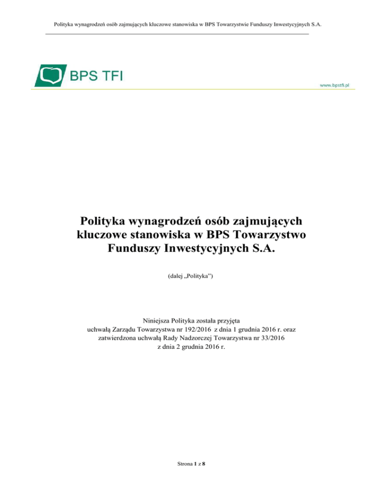 Polityka wynagrodzeń osób zajmujących kluczowe stanowiska w BPS Towarzystwie Funduszy Inwestycyjnych S.A. Polityka wynagrodzeń osób zajmujących kluczowe stanowiska w BPS Towarzystwo Funduszy Inwestycyjnych S.A. (dalej „Polityka”) Niniejsza Polityka została przyjęta uchwałą Zarządu Towarzystwa nr 192/2016 z dnia 1 grudnia 2016 r. oraz zatwierdzona uchwałą Rady Nadzorczej Towarzystwa nr 33/2016 z dnia 2 grudnia 2016 r. Strona 1 z 8 Polityka wynagrodzeń osób zajmujących kluczowe stanowiska w BPS Towarzystwie Funduszy Inwestycyjnych S.A. Wstęp §1 1. Na podstawie art. 47a ustawy o funduszach inwestycyjnych i zarządzaniu alternatywnymi funduszami inwestycyjnymi z dnia 27 maja 2004 r. (tj. Dz.U. z 2014 r. poz. 157 ze zm.), zwanej dalej „Ustawą”, oraz § 2 Rozporządzenia Ministra Finansów z dnia 30 sierpnia 2016 r. w sprawie szczegółowych wymagań, jakim powinna odpowiadać polityka wynagrodzeń w towarzystwie funduszy inwestycyjnych (Dz.U. 2016 poz. 1487), zwanego dalej „Rozporządzeniem”, jak również uwzględniając § 28 ust. 1 Zasad Ładu Korporacyjnego dla Instytucji nadzorowanych, przyjętych uchwałą Komisji Nadzoru Finansowego z dnia 22 lipca 2014 r., ustanawia się niniejszą Politykę wynagrodzeń w BPS Towarzystwo Funduszy Inwestycyjnych S.A. 2. Polityka wynagrodzeń została opracowana i uchwalona przez Zarząd oraz zatwierdzona przez Radę Nadzorczą Towarzystwa, po pozytywnym zaopiniowaniu przez komórki organizacyjne Towarzystwa odpowiedzialne za audyt wewnętrzny, zarządzanie ryzykiem oraz nadzór zgodności działalności Towarzystwa z prawem. 3. Polityka wynagrodzeń została opracowana oraz będzie aktualizowana z uwzględnieniem następujących celów: a. prawidłowe i skuteczne zarządzanie ryzykiem i zapobieganie podejmowaniu ryzyka niezgodnego z profilami ryzyka, polityką inwestycyjną, strategiami inwestycyjnymi, statutami funduszy inwestycyjnych, którymi zarządza Towarzystwo, b. wspieranie realizacji strategii prowadzenia działalności Towarzystwa, c. przeciwdziałanie powstawaniu konfliktów interesów. Definicje §2 Definicje i skróty użyte w niniejszej Polityce mają następujące znaczenie: 1) Fundusz, Fundusze – fundusze inwestycyjne zarządzane przez Towarzystwo, 2) Inspektor Nadzoru – osoba wykonująca czynności nadzoru zgodności działalności w BPS TFI z prawem zatrudnione w Zespole Nadzoru Towarzystwa, 3) Osoba zajmująca kluczowe stanowisko – osoba zatrudniona w Towarzystwie, do której zadań należą czynności istotnie wpływające na profil ryzyka Towarzystwa lub Funduszu, w szczególności która: a. pełni funkcję członka Zarządu, b. jest Zarządzającym, c. pełni funkcję osoby kierującej komórką organizacyjną Towarzystwa podległą bezpośrednio pod jednego z członków Zarządu Towarzystwa, d. otrzymuje miesięczne wynagrodzenie brutto w wysokości ponad 12 000,00 (słownie: dwanaście tysięcy złotych), e. pełni funkcję Inspektora Nadzoru, f. pełni funkcję Audytora Wewnętrznego, g. pełni funkcję Specjalisty ds. Zarządzania Ryzykiem, 4) Polityka – niniejsza Polityka wynagrodzeń osób zajmujących kluczowe stanowiska w Strona 2 z 8 Polityka wynagrodzeń osób zajmujących kluczowe stanowiska w BPS Towarzystwie Funduszy Inwestycyjnych S.A. BPS Towarzystwo Funduszy Inwestycyjnych S.A. 5) Rada Nadzorcza – Rada Nadzorcza BPS TFI, 6) Specjalista ds. Zarządzania Ryzykiem – osoba sprawująca funkcje z zakresu zarządzania ryzykiem w BPS TFI zatrudniona w Zespole Zarządzania Ryzykiem Towarzystwa, 7) Audytor Wewnętrzny – osoba pełniąca funkcje związane z audytem wewnętrznym w BPS TFI, 8) Towarzystwo, BPS TFI - BPS Towarzystwo Funduszy Inwestycyjnych S.A., 9) Zarząd – Zarząd BPS TFI, 10) Zatrudnienie - zatrudnienie określonej osoby fizycznej przez Towarzystwo na podstawie stosunku pracy, kontraktu menedżerskiego, umowy zlecenia lub innego stosunku prawnego o podobnym charakterze, 11) Zarządzający – osoba wyznaczona w Towarzystwie do zarządzania danym portfelem inwestycyjnym Funduszu lub portfelem, w skład którego wchodzi jeden lub większa liczba instrumentów finansowych (a w przypadku braku wskazania takiej osoby – członek Zarządu Towarzystwa odpowiedzialny za komórkę organizacyjną Towarzystwa, ramach której odbywa się zarządzanie danym portfelem inwestycyjnym Funduszu lub portfelem, w skład którego wchodzi jeden lub większa liczba instrumentów finansowych). Postanowienia ogólne §3 1. Polityka określa zasady wynagradzania Osób zajmujących kluczowe stanowiska, w tym zasady przyznawania tym osobom zmiennych składników wynagrodzeń uzależnionych od wyników. 2. Wynagrodzenie Osób zajmujących kluczowe stanowisko będzie wypłacane wyłącznie ze środków Towarzystwa, przy szczególnym uwzględnieniu skali działalności i sytuacji finansowej Towarzystwa, jego celów, w tym zasad związanych z ochroną inwestorów i klientów, przestrzegania wewnętrznych zasad i procedur, a także pełnionej przez taką osobę funkcji. 3. W przypadku, gdy wynagrodzenie jest podzielone na składniki stałe i zmienne zależne od wyników – stałe składniki powinny stanowić na tyle dużą część łącznej wysokości wynagrodzenia, aby było możliwe prowadzenie elastycznej polityki dotyczącej zmiennych składników wynagrodzenia uzależnionych od wyników. Składnik stały powinien stanowić wynagrodzenie za świadczenie profesjonalnych usług zgodnie z wykształceniem, stażem zatrudnienia, wymaganym poziomem wiedzy i umiejętności, ograniczeniami i doświadczeniem zawodowym, sektorem działalności oraz regionem. 4. Towarzystwo zawierając umowy o zatrudnienie z Osobami zajmującymi kluczowe stanowiska dokłada należytej staranności by płatności z tytułu wcześniejszego rozwiązania takich umów odzwierciedlały wyniki pracy osiągnięte w dłuższym okresie czasu (tj. co najmniej 2 lat, a w przypadku osób zajmujących stanowisko krócej niż dw
