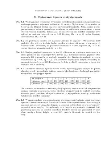 Statystyka matematyczna (2 mie, 2014/2015) 9. Testowanie hipotez statystycznych Ćw. 9.1 Według normy technicznej wykonanie obróbki mechanicznej jednego pierścienia stalowego powinno zajmować szlifierzowi 22 minuty. Wylosowano 16 stanowisk roboczych, dla których średni czas obróbki wynosił 24 minuty. Jednocześnie z przeprowadzonego badania generalnego wiadomo, że odchylenie standardowe σ czasu obróbki wynosi 4 minuty. Zakładając, że czas obróbki ma rozkład normalny, zweryfikuj na poziomie istotności α = 0,05 hipotezę H0 : a = 22 wobec hipotezy alternatywnej H1 : a ̸= 22. Ćw. 9.2 Na pudełkach zapałek jest napisane „średnio 64 zapałki”. Wylosowano 1000 pudełek, dla których średnia liczba zapałek wyniosła 65 sztuk, a wariancja s2 wynosiła 625. Zweryfikuj na poziomie istotności α = 0,05 hipotezę H0 : a = 64 wobec hipotezy alternatywnej H1 : a > 64. Ćw. 9.3 Średnia prędkość tramwaju (w km/h) obliczona na podstawie zmierzonych w środę prędkości 200 tramwajów była równa 15,1, natomiast średnia prędkość obliczona dla 120 tramwajów w niedzielę wynosiła 16,4. Wariancja prędkości wynosiła odpowiednio s21 = 6,8, s22 = 4,2. Na podstawie uzyskanych danych zweryfikuj na poziomie istotności α = 0,05 hipotezę, że średnia prędkość tramwajów w środę jest mniejsza niż w niedzielę. Ćw. 9.4 Zmierzono ciśnienie tętnicze wśród losowo wybranej grupy chorych na pewną chorobę przed i po podaniu takiego samego leku każdemu z badanych pacjentów. Otrzymano następujące wyniki: Nr pacjenta Ciśnienie przed Ciśnienie po 1 2 3 4 5 6 7 8 210 180 260 270 190 250 180 200 180 160 220 260 200 230 180 190 Na poziomie istotności α = 0,05 zweryfikuj hipotezę, że stosowany lek nie powoduje zmiany ciśnienia u pacjentów, wobec hipotezy alternatywnej, że wartość przeciętna ciśnienia przed podaniem leku jest wyższa niż po jego podaniu, wiedząc, że ciśnienie tętnicze ma rozkład normalny. Ćw. 9.5 W czasie sondażu przeprowadzonego przez pracownię badania opinii społecznej spośród 1100 ankietowanych dorosłych Polaków 1090 odpowiedziało, że w ubiegłym miesiącu nie przeczytali żadnej książki, a pozostali potwierdzili, że przeczytali przynajmniej jedna książkę. Na podstawie tych danych, na poziomie istotności 0,01, przetestuj hipotezę, że odsetek dorosłych Polaków, którzy nie przeczytali w ubiegłym miesiącu żadnej książki, wynosi 99%, przeciw hipotezie, że odsetek ten jest inny. Statystyka matematyczna (2 mie, 2014/2015) 9. Testowanie hipotez statystycznych Zadania do samodzielnego rozwiązania Zad. 9.1 Dostawca drewnianych belek twierdzi, że ich średnia wytrzymałość jest równa µ = 40 kg/cm2 . Wiadomo z doświadczenia, że wytrzymałość może być uznana za zmienną losową o rozkładzie normalnym i odchyleniu standardowym 2. Wybrano losowo 25 belek i zmierzono ich wytrzymałości. Otrzymano, że średnia wytrzymałość w próbie wynosi 39. Przetestuj na poziomie istotności 0,1 hipotezę dostawcy przeciwko alternatywie, że średnia wytrzymałość belek jest mniejsza niż 40 kg/cm2 . Zad. 9.2 W celu ustalenia stopnia wykonania normy przez pracowników z dwóch zakładów włókienniczych wylosowano po 25 robotników pracujących systemem akordowym. Średnie miesięczne wykonanie normy dla zakładu pierwszego wynosiło 118%, zaś dla zakładu drugiego 121%. Ponadto odchylenia standardowe s dla obu zakładów wynosiły odpowiednio 7,3% oraz 7,7%. Zakładając, że rozkład wykonania normy jest w obu zakładach normalny i wiedząc, że test równości wariancji wykonany dla powyższych próbek nie pozwolił na odrzucenie hipotezy zerowej, na poziomie istotności α = 0,05 zweryfikuj hipotezę, że średnie wykonanie normy w obu zakładach jest jednakowe wobec hipotezy, że jest ono różne. Zad. 9.3 Liczba sprzedanych biletów MZK w Toruniu w kolejnych niedzielach maja i czerwca przedstawia się następująco: Numer niedzieli 1 Liczba sprzedanych biletów (w tys.) 2,9 2 3,3 3 3,2 4 3,2 5 3,2 6 3,0 7 2,9 8 3,1 Na podstawie tych danych, na poziomie istotności α = 0,1 przetestuj hipotezę, że średnia liczba sprzedawanych biletów w niedziele jest równa 3,2 tys. przeciw hipotezie, że średnia sprzedawanych biletów jest (a) mniejsza niż 3,2 tys., (b) różna od 3,2 tys., jeżeli wiadomo, że liczba sprzedawanych biletów ma rozkład normalny. Zad. 9.4 Producent płatków mydlanych wysunął hipotezę, że stopień wyprania tkaniny wełnianej płatkami mydlanymi jest wyższy od stopnia wyprania płynem do prania. W celu sprawdzenia tej hipotezy wykonano pomiary stopnia wyprania 10 wycinków tkaniny pranej płatkami, otrzymując w procentach wyniki 74,4; 75,1; 73,0; 72,8; 76,2; 74,6; 76,0; 73,4; 72,9; 71,6, oraz 7 wycinków pranych płynem do prania, otrzymując wyniki 56,8; 57,8; 54,6; 59,0; 57,1; 58,2; 57,6. Zakładając, że stopień wyprania tkaniny ma rozkład normalny i wiedząc, że test równości wariancji wykonany dla powyższych próbek nie pozwolił na odrzucenie hipotezy zerowej, na poziomie istotności α = 0,05 zweryfikuj hipotezę wysuniętą przez producenta.
