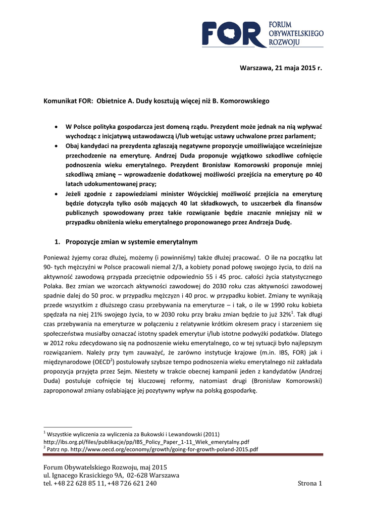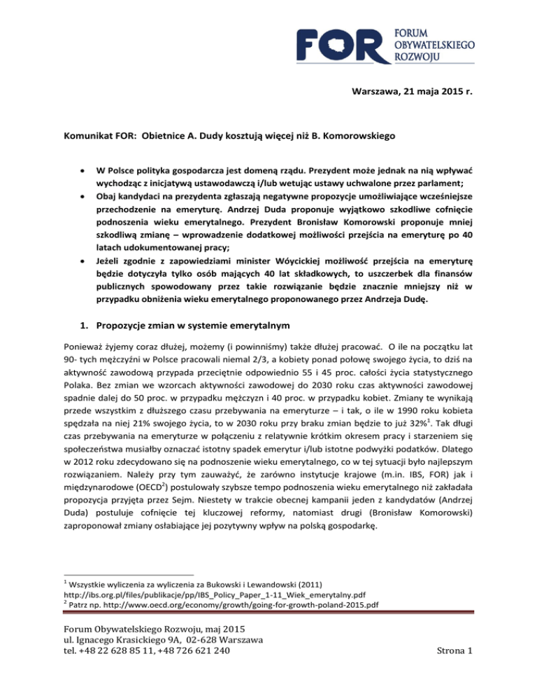 Warszawa, 21 maja 2015 r. Komunikat FOR: Obietnice A. Dudy kosztują więcej niż B. Komorowskiego W Polsce polityka gospodarcza jest domeną rządu. Prezydent może jednak na nią wpływać wychodząc z inicjatywą ustawodawczą i/lub wetując ustawy uchwalone przez parlament; Obaj kandydaci na prezydenta zgłaszają negatywne propozycje umożliwiające wcześniejsze przechodzenie na emeryturę. Andrzej Duda proponuje wyjątkowo szkodliwe cofnięcie podnoszenia wieku emerytalnego. Prezydent Bronisław Komorowski proponuje mniej szkodliwą zmianę – wprowadzenie dodatkowej możliwości przejścia na emeryturę po 40 latach udokumentowanej pracy; Jeżeli zgodnie z zapowiedziami minister Wóycickiej możliwość przejścia na emeryturę będzie dotyczyła tylko osób mających 40 lat składkowych, to uszczerbek dla finansów publicznych spowodowany przez takie rozwiązanie będzie znacznie mniejszy niż w przypadku obniżenia wieku emerytalnego proponowanego przez Andrzeja Dudę. 1. Propozycje zmian w systemie emerytalnym Ponieważ żyjemy coraz dłużej, możemy (i powinniśmy) także dłużej pracować. O ile na początku lat 90- tych mężczyźni w Polsce pracowali niemal 2/3, a kobiety ponad połowę swojego życia, to dziś na aktywność zawodową przypada przeciętnie odpowiednio 55 i 45 proc. całości życia statystycznego Polaka. Bez zmian we wzorcach aktywności zawodowej do 2030 roku czas aktywności zawodowej spadnie dalej do 50 proc. w przypadku mężczyzn i 40 proc. w przypadku kobiet. Zmiany te wynikają przede wszystkim z dłuższego czasu przebywania na emeryturze – i tak, o ile w 1990 roku kobieta spędzała na niej 21% swojego życia, to w 2030 roku przy braku zmian będzie to już 32%1. Tak długi czas przebywania na emeryturze w połączeniu z relatywnie krótkim okresem pracy i starzeniem się społeczeństwa musiałby oznaczać istotny spadek emerytur i/lub istotne podwyżki podatków. Dlatego w 2012 roku zdecydowano się na podnoszenie wieku emerytalnego, co w tej sytuacji było najlepszym rozwiązaniem. Należy przy tym zauważyć, że zarówno instytucje krajowe (m.in. IBS, FOR) jak i międzynarodowe (OECD2) postulowały szybsze tempo podnoszenia wieku emerytalnego niż zakładała propozycja przyjęta przez Sejm. Niestety w trakcie obecnej kampanii jeden z kandydatów (Andrzej Duda) postuluje cofnięcie tej kluczowej reformy, natomiast drugi (Bronisław Komorowski) zaproponował zmiany osłabiające jej pozytywny wpływ na polską gospodarkę. 1 Wszystkie wyliczenia za wyliczenia za Bukowski i Lewandowski (2011) http://ibs.org.pl/files/publikacje/pp/IBS_Policy_Paper_1-11_Wiek_emerytalny.pdf 2 Patrz np. http://www.oecd.org/economy/growth/going-for-growth-poland-2015.pdf Forum Obywatelskiego Rozwoju, maj 2015 ul. Ignacego Krasickiego 9A, 02-628 Warszawa tel. +48 22 628 85 11, +48 726 621 240 Strona 1 Cofnięcie podnoszenia wieku emerytalnego - Andrzej Duda Postulat zakłada zaniechanie stopniowego podnoszenia wieku emerytalnego do 67 lat i jego cofnięcie z powrotem do 60 lat dla kobiet i 65 lat dla mężczyzn. Ze względu na postępujące negatywne trendy demograficzne, zmiana wiązałaby się z bardzo dużym negatywnym wpływem na saldo sektora finansów publicznych, a pośrednio na koszt obsługi polskiego zadłużenia. Obliczenia z oceny skutków regulacji załączonej do ustawy podnoszącej wiek emerytalny, wskazują, że w ciągu jednej 5-letniej kadencji do 2020 roku efekt ten wyniósłby ok. 43,6 mld zł (w cenach stałych z 2014 roku). W późniejszych latach koszty te szybko rosną. Szacunek obejmuje wpływ na budżet państwa, jednostki samorządu terytorialnego, FUS, FRD, FP i FGŚP. Obliczenia były wykonane w 2012 roku, czyli przed antyreformą OFE - obecnie wpływ byłby większy ze względu na większą część składek emerytalnych trafiających do ZUS. Dla samych emerytów niższy wiek emerytalny oznacza niższe świadczenia, w szczególności w przypadku kobiet. Według szacunków Banku Światowego, dla kobiety z wyższym wykształceniem przejście na emeryturę w wieku 67 lat oznacza emeryturę równą 50% średniego wynagrodzenia, a w wieku 60 lat stopę zastąpienia wynoszącą tylko 40%. Z kolei przejście na emeryturę mężczyzny z wyższym wykształceniem w wieku 67 lat wiązałoby się ze stopą zastąpienia w wysokości 63%, a w wieku 65 lat w wysokości 57%. Podobne różnice występują w przypadku osób z niższymi poziomami wykształcenia. Niższy wiek emerytalny bezpośrednio (poprzez mniejszą aktywność zawodową) oraz pośrednio (poprzez niższą stopę inwestycji) negatywnie wpłynie na tempo wzrostu polskiego PKB, co odczujemy wszyscy, niezależnie od wieku. Wprowadzenie możliwości przechodzenia na emeryturę po 40 latach pracy - Bronisław Komorowski Wpływ proponowanej zmiany na finanse publiczne i rynek pracy będzie zależał od tego, ile osób dzięki niej będzie mogło przejść na emeryturę przed osiągnięciem ustawowego wieku emerytalnego. Według danych ZUS3 spośród osób, którym w 2013 roku przyznano emeryturę 72,8% osób miało staż pracy krótszy niż 40 lat. Innymi słowy proponowane zmiany mogłyby mieć wpływ na moment przejścia na emeryturę tylko pozostałych 27,2% osób. Wyliczenia te dotyczą jednak tylko emerytur przyznanych według dotychczasowych zasad, ZUS nie podaje analogicznej statystyki dla osób, którym przyznano emeryturę na nowych zasadach. Nie jest też obecnie do końca jasne, co będzie wliczane do stażu pracy. Według wypowiedzi minister Wóycickiej4 miałyby to być tylko lata składkowe, a więc bez okresu studiów. Takie rozwiązanie znacznie zawęzi liczbę osób, które na bazie nowych przepisów mogłyby przejść na emeryturę przed osiągnięciem wieku emerytalnego. minister Wóycicka stwierdziła także, że wymagany minimalny czas pracy ma być stopniowo wydłużany z 40 do 45 lat (dokładne tempo podnoszenia nie zostało podane). Na podstawie dostępnych informa