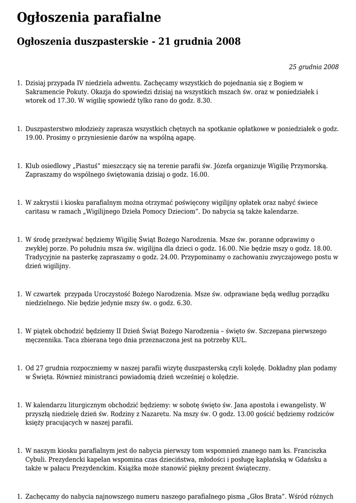 Ogłoszenia parafialne Ogłoszenia duszpasterskie - 21 grudnia 2008 25 grudnia 2008 1. Dzisiaj przypada IV niedziela adwentu. Zachęcamy wszystkich do pojednania się z Bogiem w Sakramencie Pokuty. Okazja do spowiedzi dzisiaj na wszystkich mszach św. oraz w poniedziałek i wtorek od 17.30. W wigilię spowiedź tylko rano do godz. 8.30. 1. Duszpasterstwo młodzieży zaprasza wszystkich chętnych na spotkanie opłatkowe w poniedziałek o godz. 19.00. Prosimy o przyniesienie darów na wspólną agapę. 1. Klub osiedlowy „Piastuś” mieszczący się na terenie parafii św. Józefa organizuje Wigilię Przymorską. Zapraszamy do wspólnego świętowania dzisiaj o godz. 16.00. 1. W zakrystii i kiosku parafialnym można otrzymać poświęcony wigilijny opłatek oraz nabyć świece caritasu w ramach „Wigilijnego Dzieła Pomocy Dzieciom”. Do nabycia są także kalendarze. 1. W środę przeżywać będziemy Wigilię Świąt Bożego Narodzenia. Msze św. poranne odprawimy o zwykłej porze. Po południu msza św. wigilijna dla dzieci o godz. 16.00. Nie będzie mszy o godz. 18.00. Tradycyjnie na pasterkę zapraszamy o godz. 24.00. Przypominamy o zachowaniu zwyczajowego postu w dzień wigilijny. 1. W czwartek przypada Uroczystość Bożego Narodzenia. Msze św. odprawiane będą według porządku niedzielnego. Nie będzie jedynie mszy św. o godz. 6.30. 1. W piątek obchodzić będziemy II Dzień Świąt Bożego Narodzenia – święto św. Szczepana pierwszego męczennika. Taca zbierana tego dnia przeznaczona jest na potrzeby KUL. 1. Od 27 grudnia rozpoczniemy w naszej parafii wizytę duszpasterską czyli kolędę. Dokładny plan podamy w Święta. Również ministranci powiadomią dzień wcześniej o kolędzie. 1. W kalendarzu liturgicznym obchodzić będziemy: w sobotę święto św. Jana apostoła i ewangelisty. W przyszłą niedzielę dzień św. Rodziny z Nazaretu. Na mszy św. O godz. 13.00 gościć będziemy rodziców księży pracujących w naszej parafii. 1. W naszym kiosku parafialnym jest do nabycia pierwszy tom wspomnień znanego nam ks. Franciszka Cybuli. Prezydencki kapelan wspomina czas dzieciństwa, młodości i posługę kapłańską w Gdańsku a także w pałacu Prezydenckim. Książka może stanowić piękny prezent świąteczny. 1. Zachęcamy do nabycia najnowszego numeru naszego parafialnego pisma „Głos Brata”. Wśród różnych artykułów znajdują się cykliczne artykuły pogłębiające naszą wiedzę religijną oraz wiele ciekawych zdjęć i wspomnień ukazujących naszą obecną działalność duszpasterską. 1. W kiosku parafialnym są również do nabycia płyty DVD ukazujące montaż nowego ołtarza oraz jego poświęcenie przez ks. Arcybiskupa. Zakup takiej płyty jest nabyciem cegiełki na ten cel. 1. Informujemy iż na naszej parafialnej stronie internetowej znajdują się kartki świąteczne. Wysyłającym życzenia drogą internetową polecamy tę stronę. 1. Szkolne Koło Caritas działające w Gimnazjum nr 21 przygotowało kiermasz prac świątecznych wykonanych przez młodzież także z klasach integracyjnych. Zebrane fundusze zostaną przeznaczone na akcję Unicef: „Na ratunek dzieciom w Kongo”. Kiermasz odbywa się przed naszym kościołem. 1. Wszystkim ofiarodawcom wspierającym nasze wspólne parafialne działania składamy serdeczne Bóg zapłać. W minionym tygodniu zbieraliśmy dary i ofiary dla najuboższych. Dzięki temu wsparliśmy blisko 50 rodzin z naszej parafii. Dziękujemy za każdy dar serca. Zakończyliśmy także kolejny etap prac brukarskich na terenie parafialnym przylegającym do zakrystii. Wszystkich ofiarodawców jak zawsze polecamy dobremu Bogu. 1. Pomódlmy się za wszystkich zmarłych z naszych rodzin i za zmarłych parafian a zwłaszcza za tych , którzy odeszli do wieczności w minionym tygodniu: Śp. Lucjan Jaczyński z ul. Kołobrzeskiej Śp. Bogdan Niedźwiecki z ul. Kołobrzeskiej Śp. Urszula Mularczyk z ul. Kołobrzeskiej