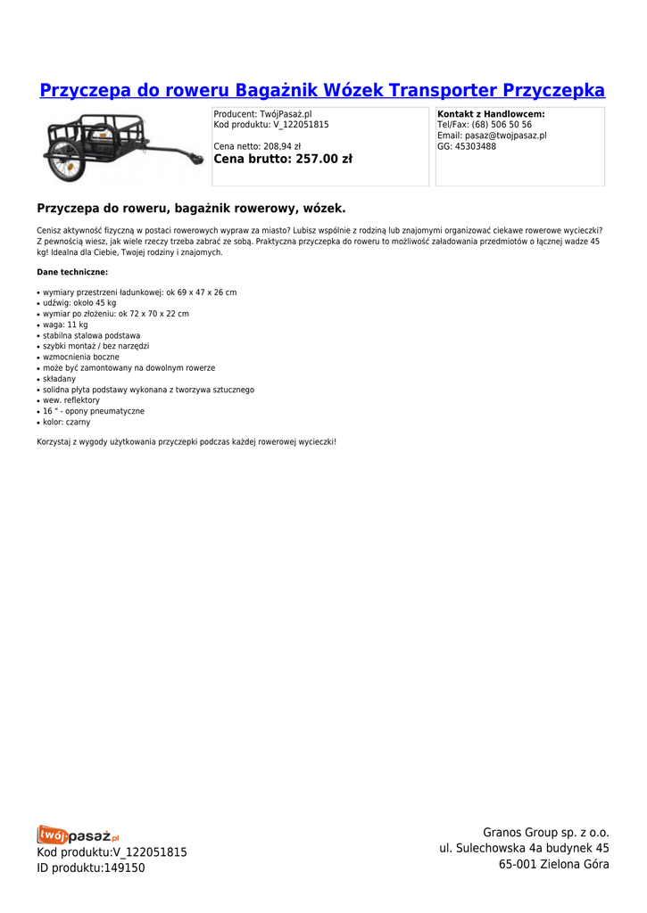 Przyczepa do roweru Bagażnik Wózek Transporter Przyczepka Producent: TwójPasaż.pl Kod produktu: V_122051815 Cena netto: 208,94 zł Kontakt z Handlowcem: Tel/Fax: (68) 506 50 56 Email: [email protected] GG: 45303488 Cena brutto: 257.00 zł Przyczepa do roweru, bagażnik rowerowy, wózek. Cenisz aktywność fizyczną w postaci rowerowych wypraw za miasto? Lubisz wspólnie z rodziną lub znajomymi organizować ciekawe rowerowe wycieczki? Z pewnością wiesz, jak wiele rzeczy trzeba zabrać ze sobą. Praktyczna przyczepka do roweru to możliwość załadowania przedmiotów o łącznej wadze 45 kg! Idealna dla Ciebie, Twojej rodziny i znajomych. Dane techniczne: ● ● ● ● ● ● ● ● ● ● ● ● ● wymiary przestrzeni ładunkowej: ok 69 x 47 x 26 cm udźwig: około 45 kg wymiar po złożeniu: ok 72 x 70 x 22 cm waga: 11 kg stabilna stalowa podstawa szybki montaż / bez narzędzi wzmocnienia boczne może być zamontowany na dowolnym rowerze składany solidna płyta podstawy wykonana z tworzywa sztucznego wew. reflektory 16 " - opony pneumatyczne kolor: czarny Korzystaj z wygody użytkowania przyczepki podczas każdej rowerowej wycieczki! Kod produktu:V_122051815 ID produktu:149150 Granos Group sp. z o.o. ul. Sulechowska 4a budynek 45 65-001 Zielona Góra