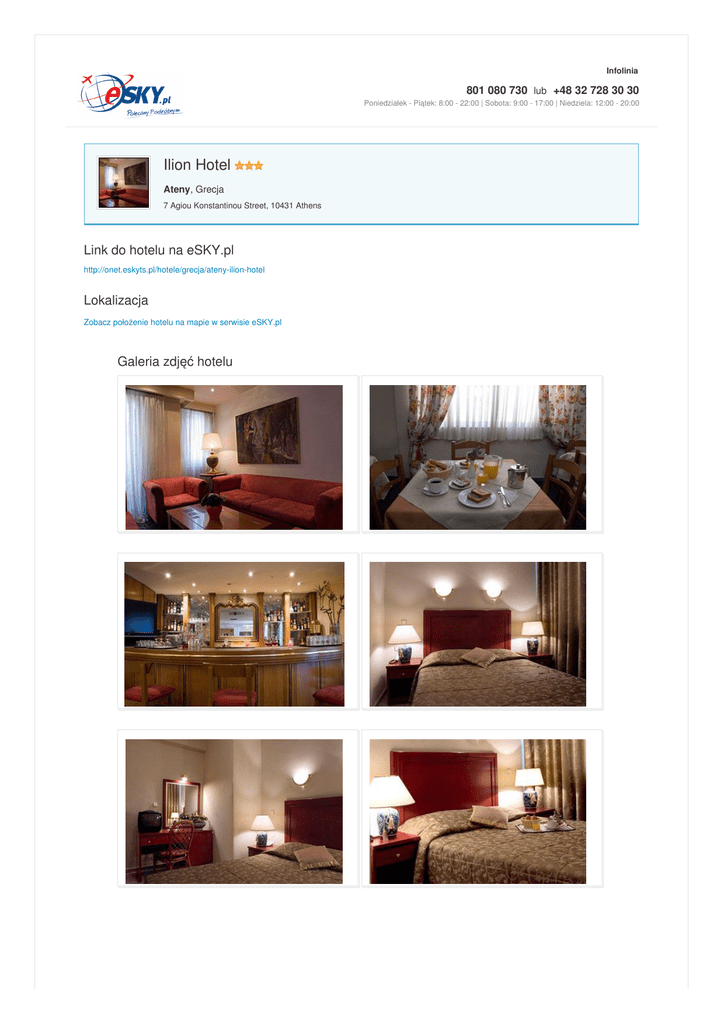 Infolinia 801 080 730 lub +48 32 728 30 30 Poniedziałek - Piątek: 8:00 - 22:00 | Sobota: 9:00 - 17:00 | Niedziela: 12:00 - 20:00 Ilion Hotel Ateny, Grecja 7 Agiou Konstantinou Street, 10431 Athens Link do hotelu na eSKY.pl http://onet.eskyts.pl/hotele/grecja/ateny-ilion-hotel Lokalizacja Zobacz położenie hotelu na mapie w serwisie eSKY.pl Galeria zdjęć hotelu Hotele – Bilety lotnicze – Tanie linie lotnicze – Ubezpieczenia Podróżne
